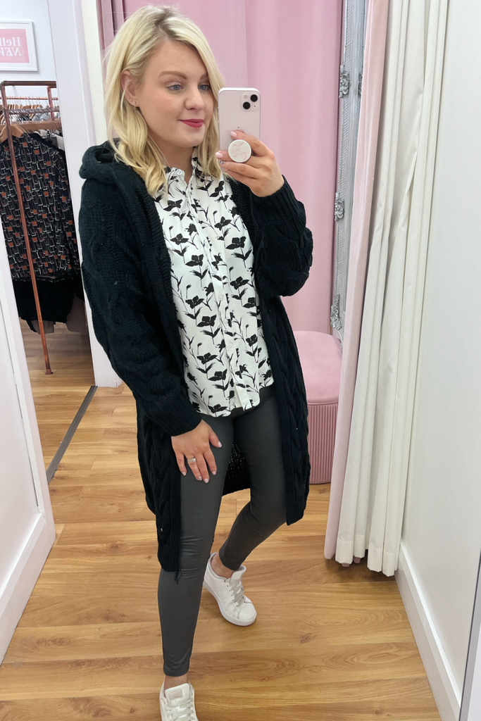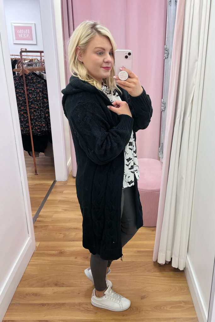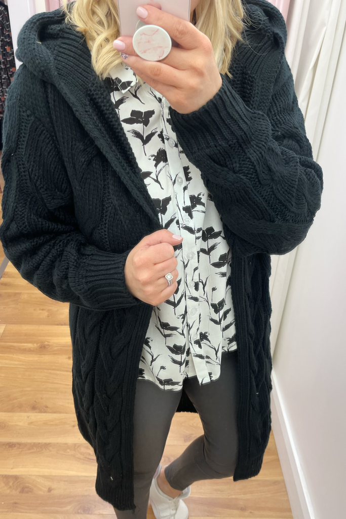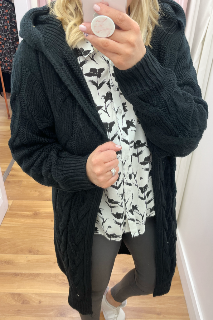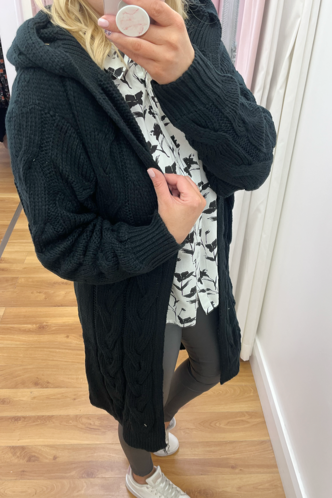Knitted longer length cardigan with hood. An easy one for every day wear, wear it with denims, leggings or layer it over a dress. It is the perfect layer for both comfort and style!