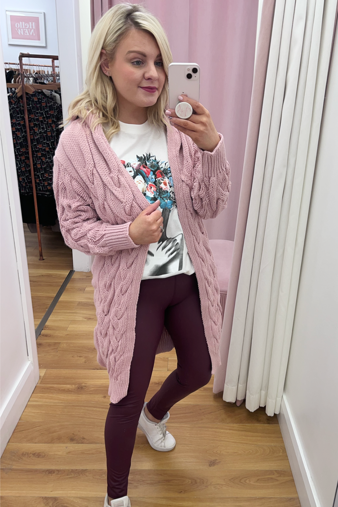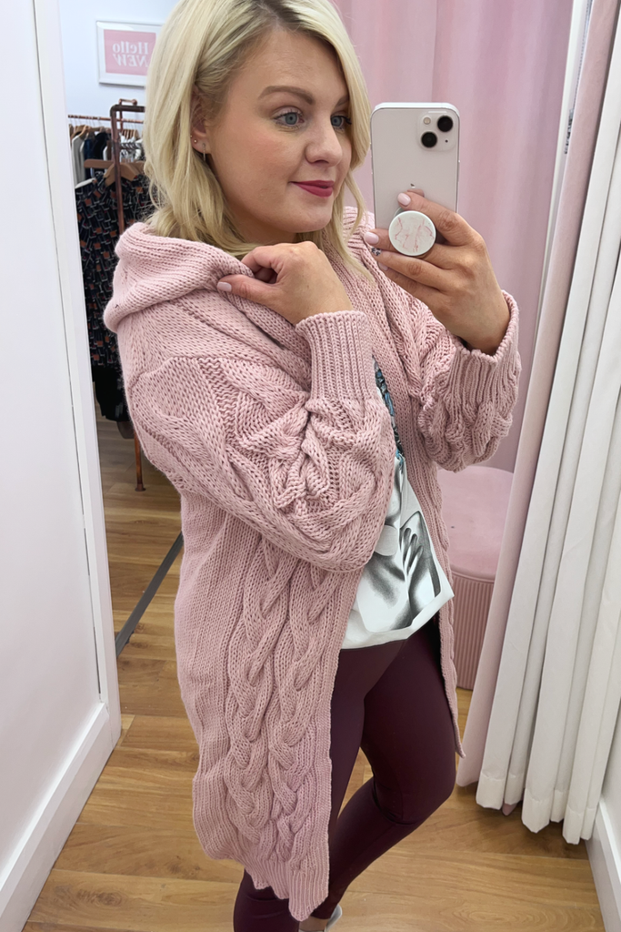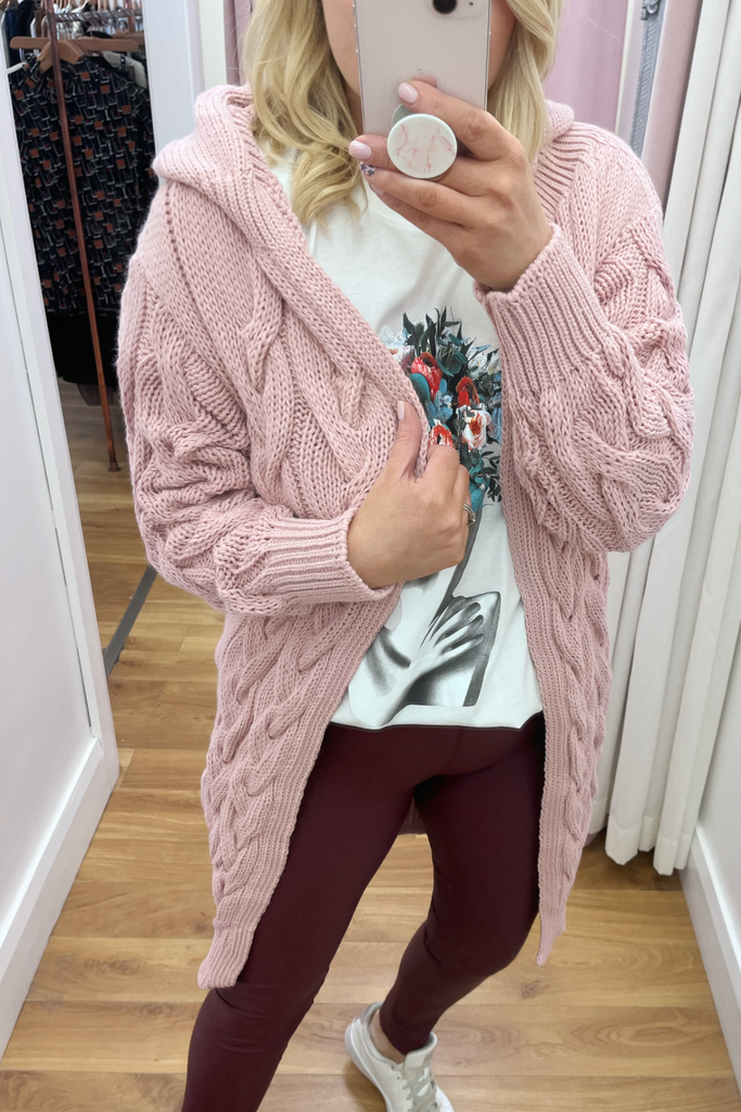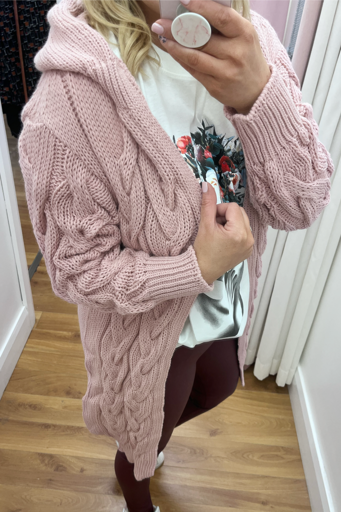 Knitted longer length cardigan with hood. An easy one for every day wear, wear it with denims, leggings or layer it over a dress. It is the perfect layer for both comfort and style!