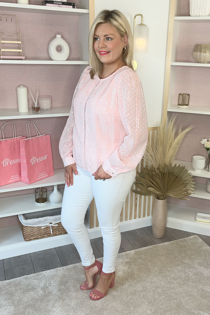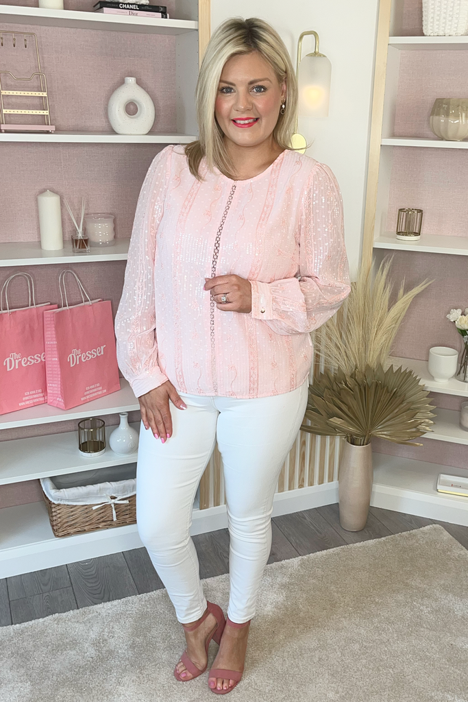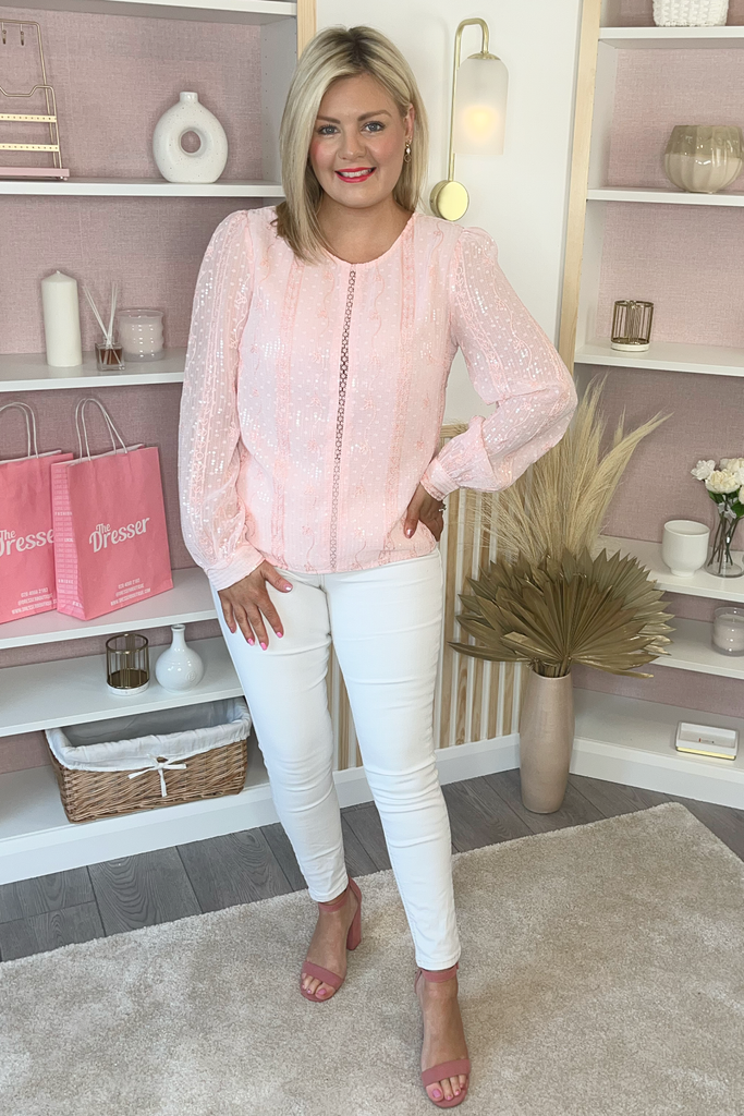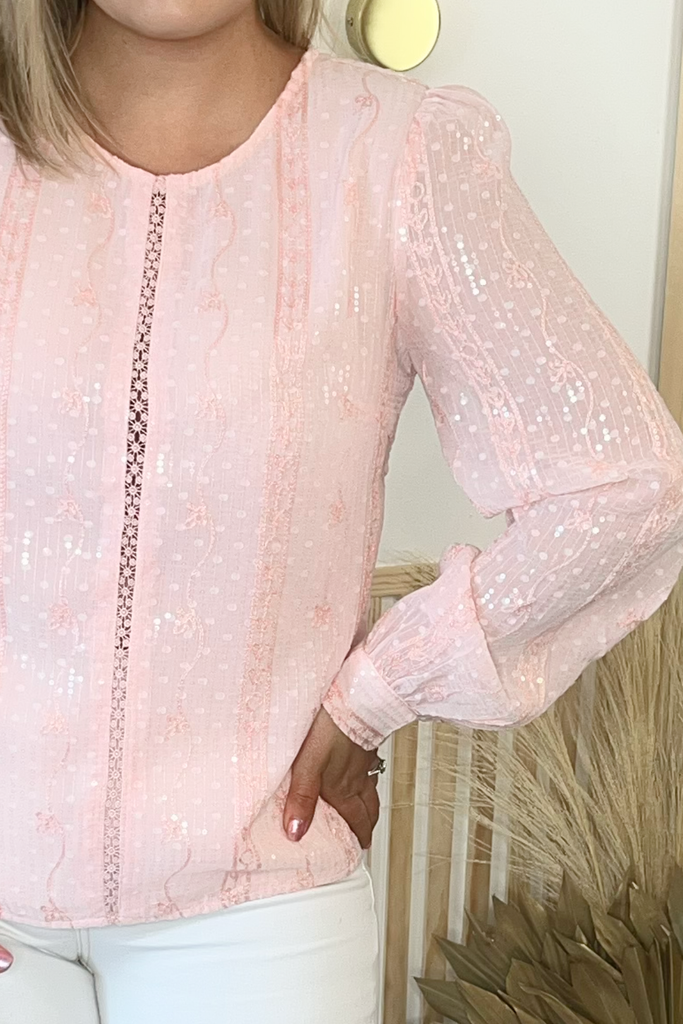 Pretty pink textured blouse with delicate sequin and soft sheen. In a straight cut, featuring lace detail, round neckline and balloon sleeve with fitted cuff. with button closure at back of the neck