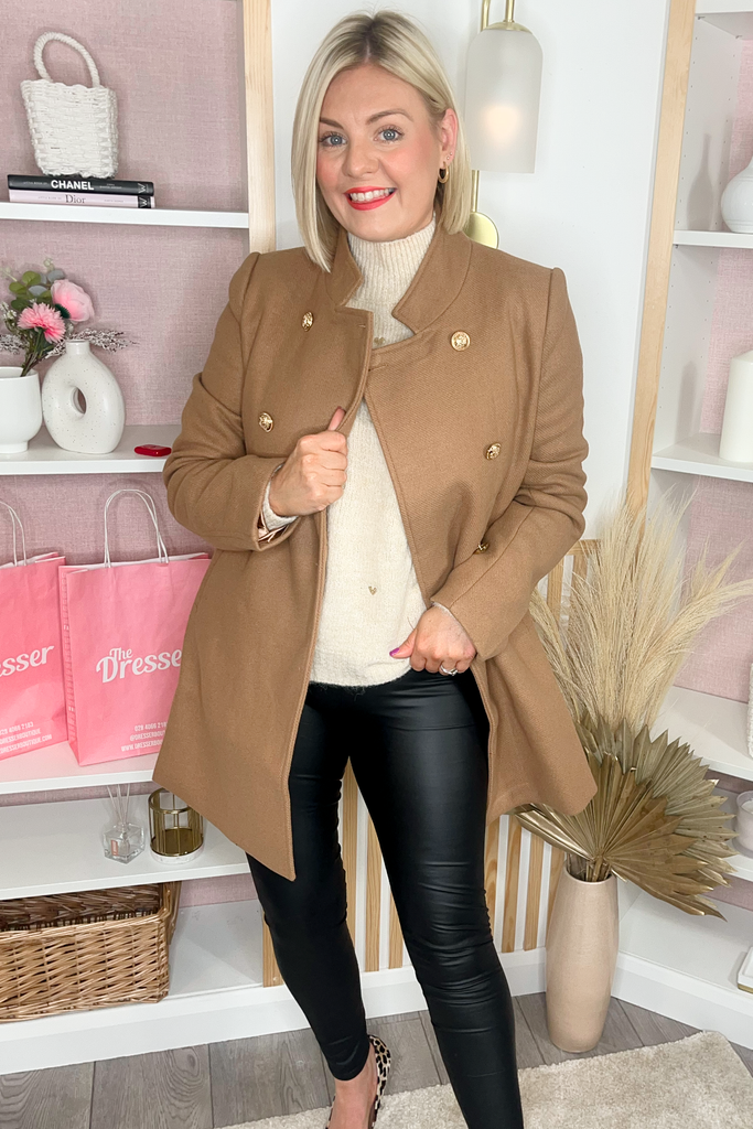 Camel mid-length coat with 6 gold buttons. This style is lined
