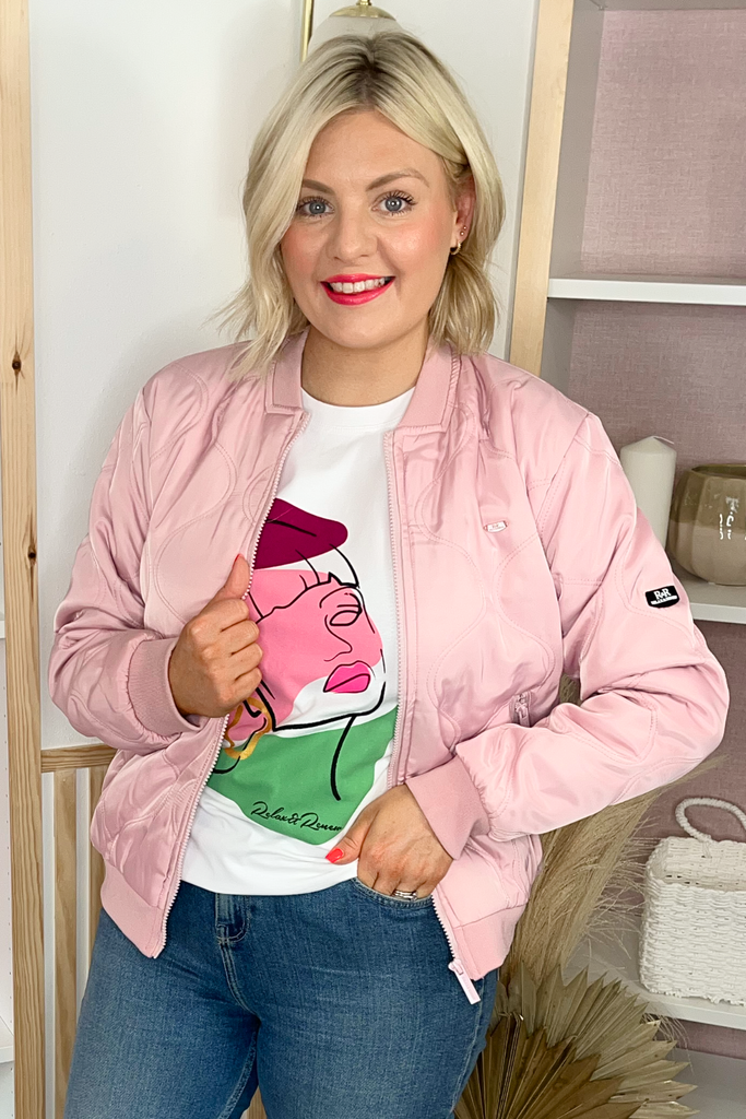 Pink zipped bomber style jacket in a light/medium weight. With quilted finish