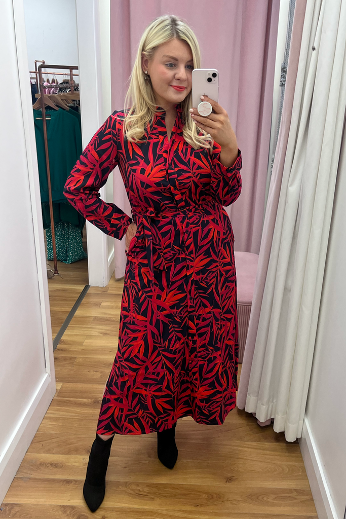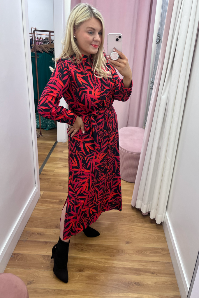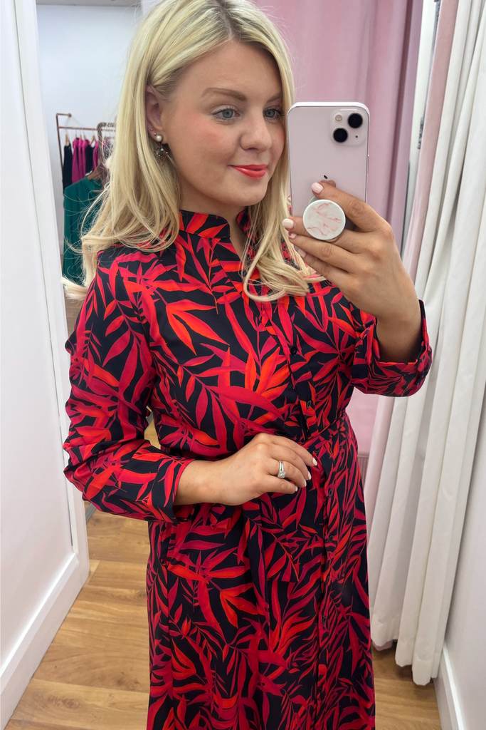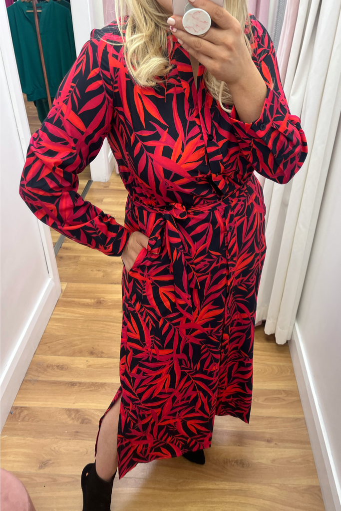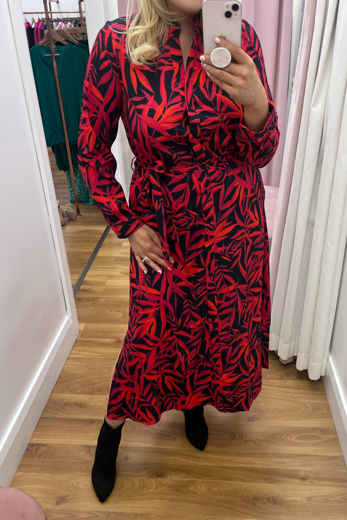 Stunning shirt dress in a bold leaf print. Features a delicate mandarin collared neckline, full button down front and slightly elasticated waist with tie waist belt to cinch in the waist. It has full length sleeves with buttoned cuff. Side slits at the sides make it move effortlessly. and pockets!