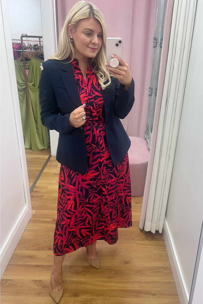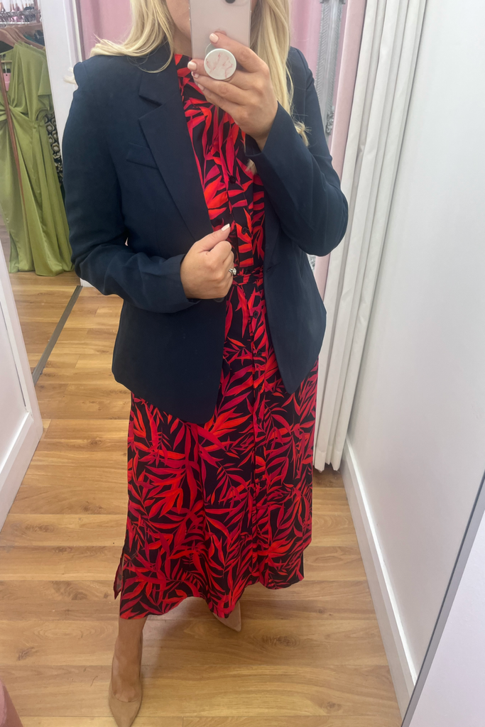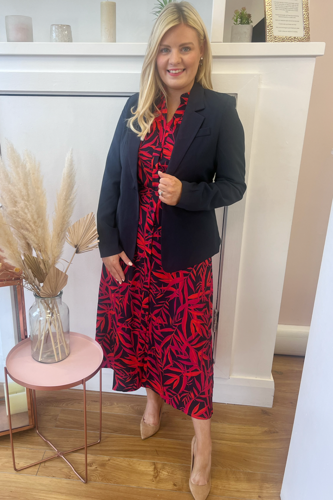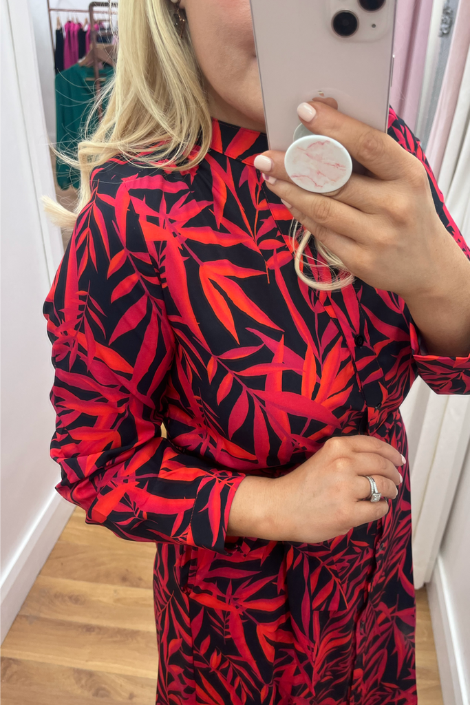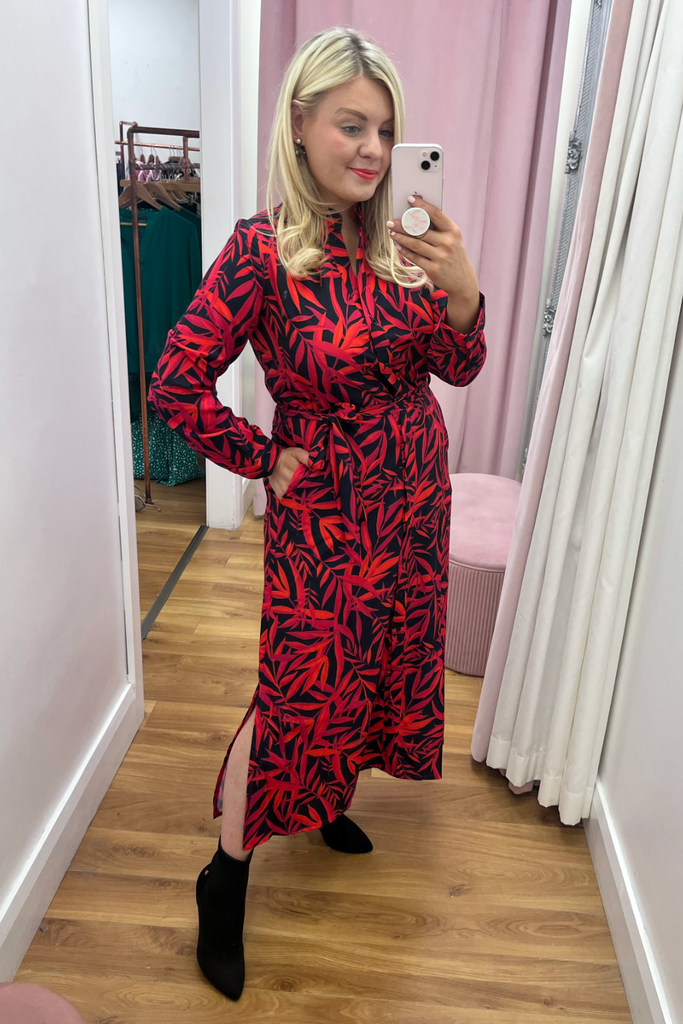 Stunning shirt dress in a bold leaf print. Features a delicate mandarin collared neckline, full button down front and slightly elasticated waist with tie waist belt to cinch in the waist. It has full length sleeves with buttoned cuff. Side slits at the sides make it move effortlessly. and pockets!