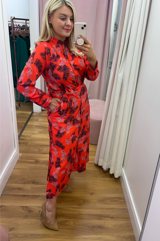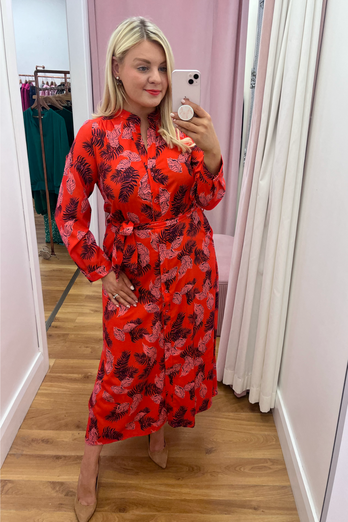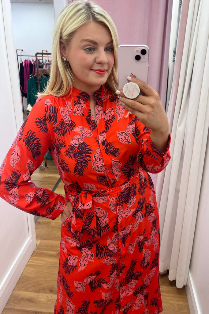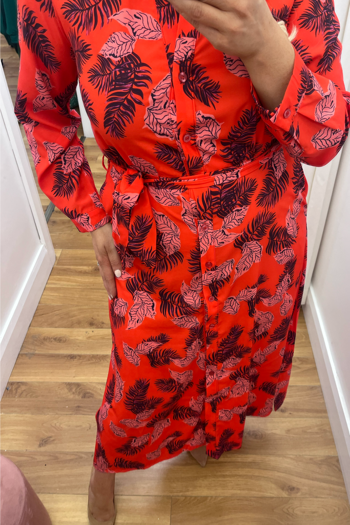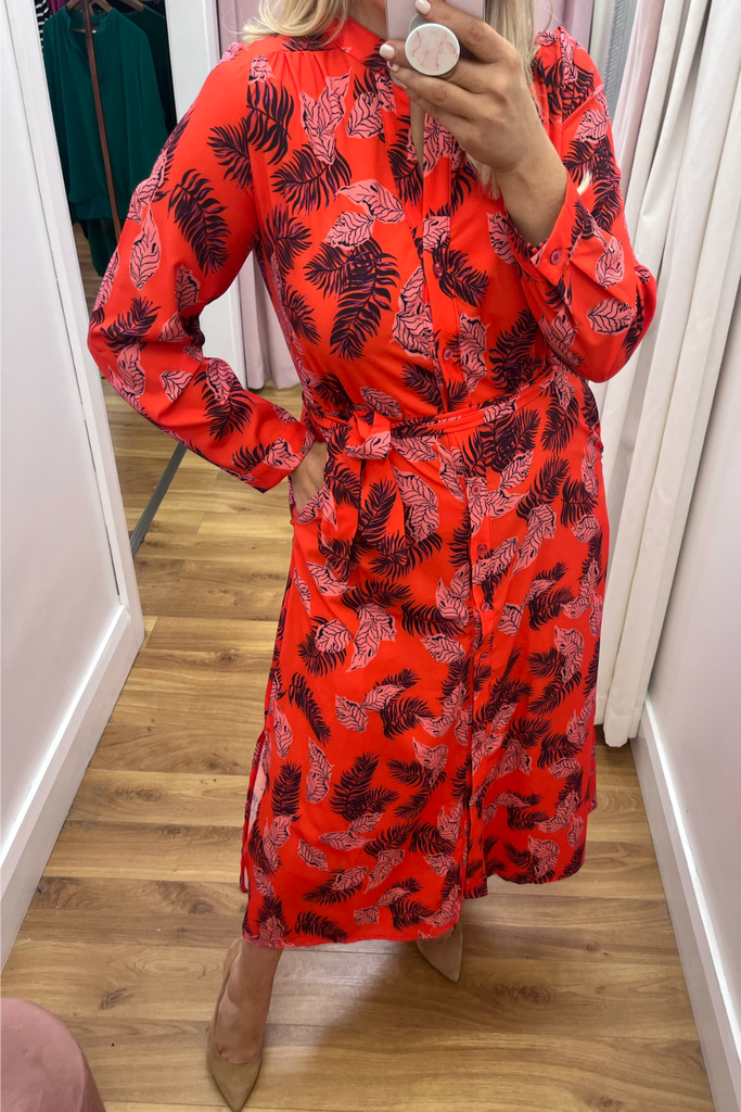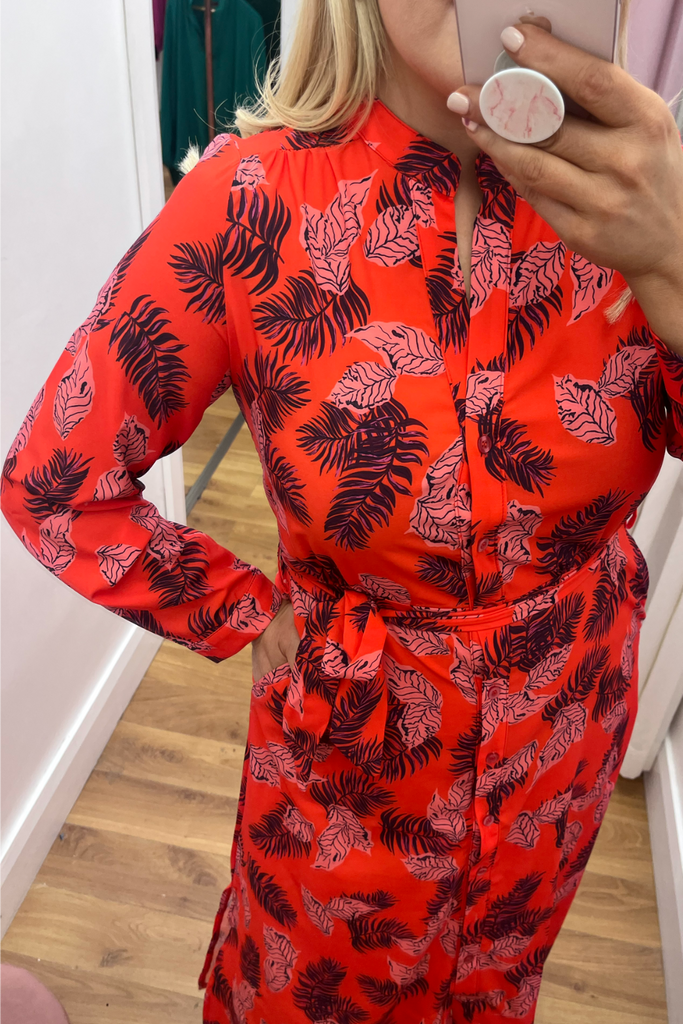 Stunning shirt dress in a bold leaf print. Features a delicate mandarin collared neckline, full button down front and slightly elasticated waist with tie waist belt to cinch in the waist. It has full length sleeves with buttoned cuff.  Side slits at the sides make it move effortlessly. and pockets!