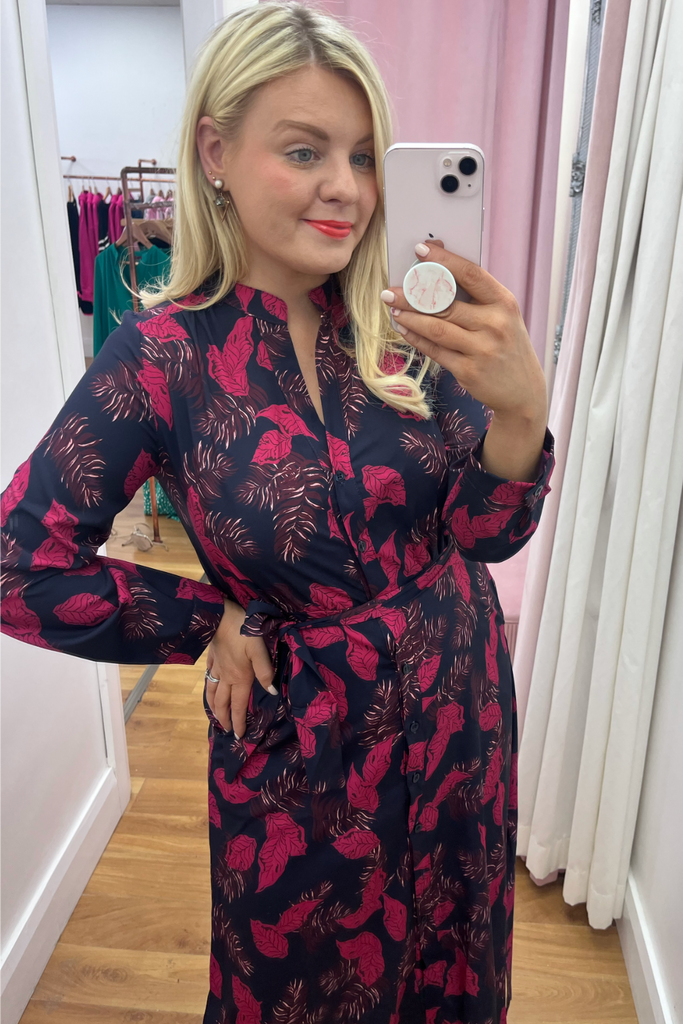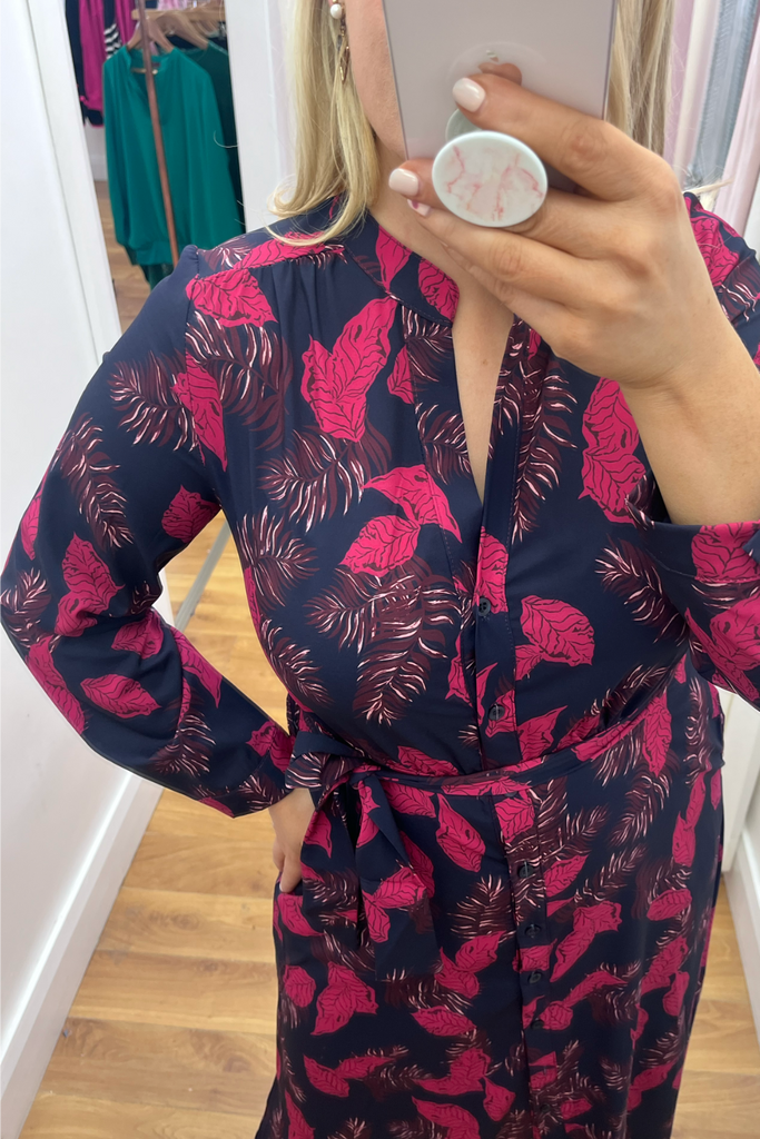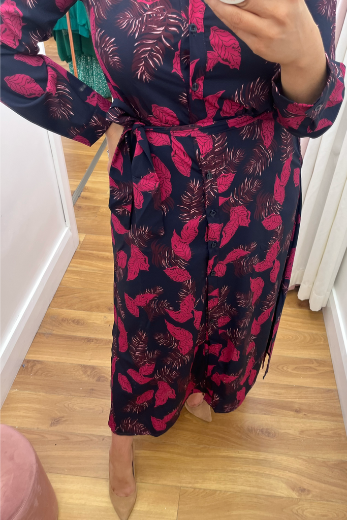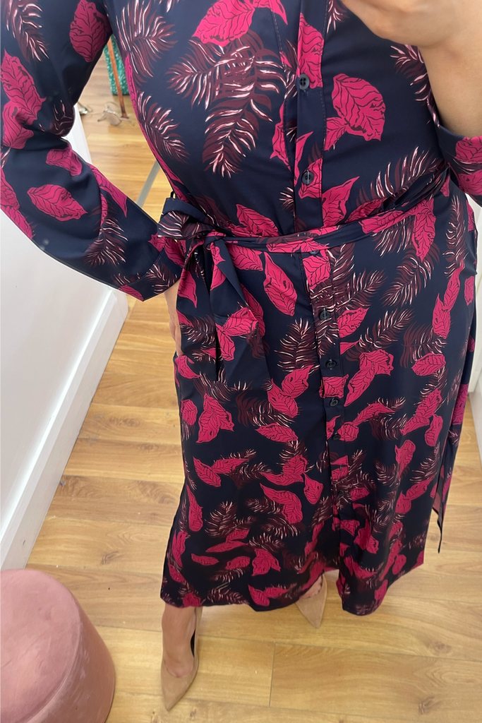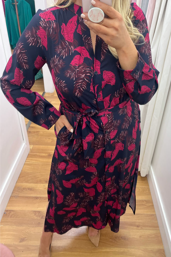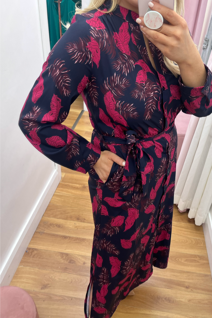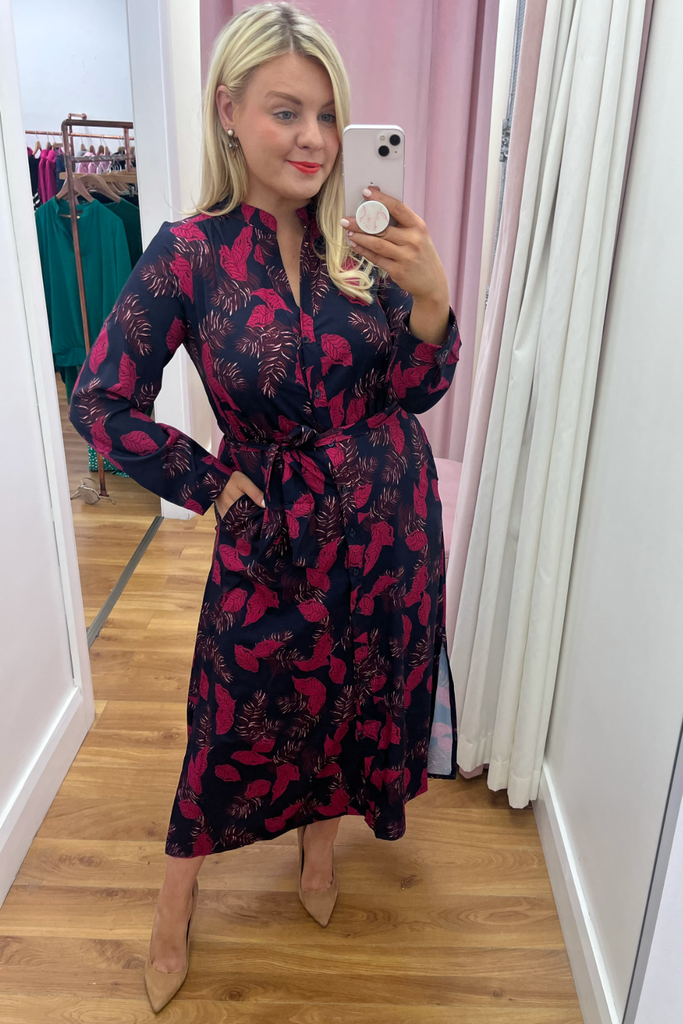 Stunning shirt dress in a bold leaf print. Features a delicate mandarin collared neckline, full button down front and slightly elasticated waist with tie waist belt to cinch in the waist. It has full length sleeves with buttoned cuff. Side slits at the sides make it move effortlessly. and pockets!