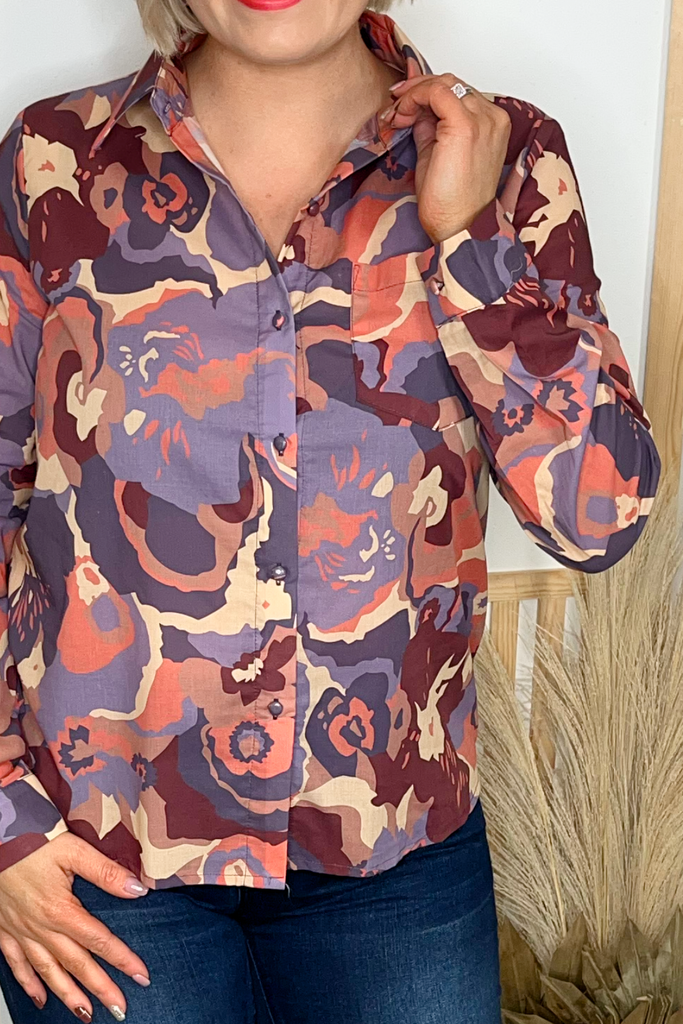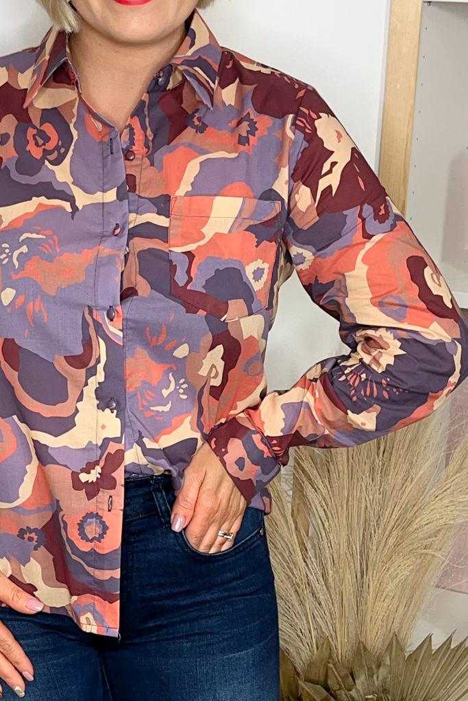Printed collared blouse in a mix of rich and pretty earthy tones. With buttoned cuffs and patch pocket