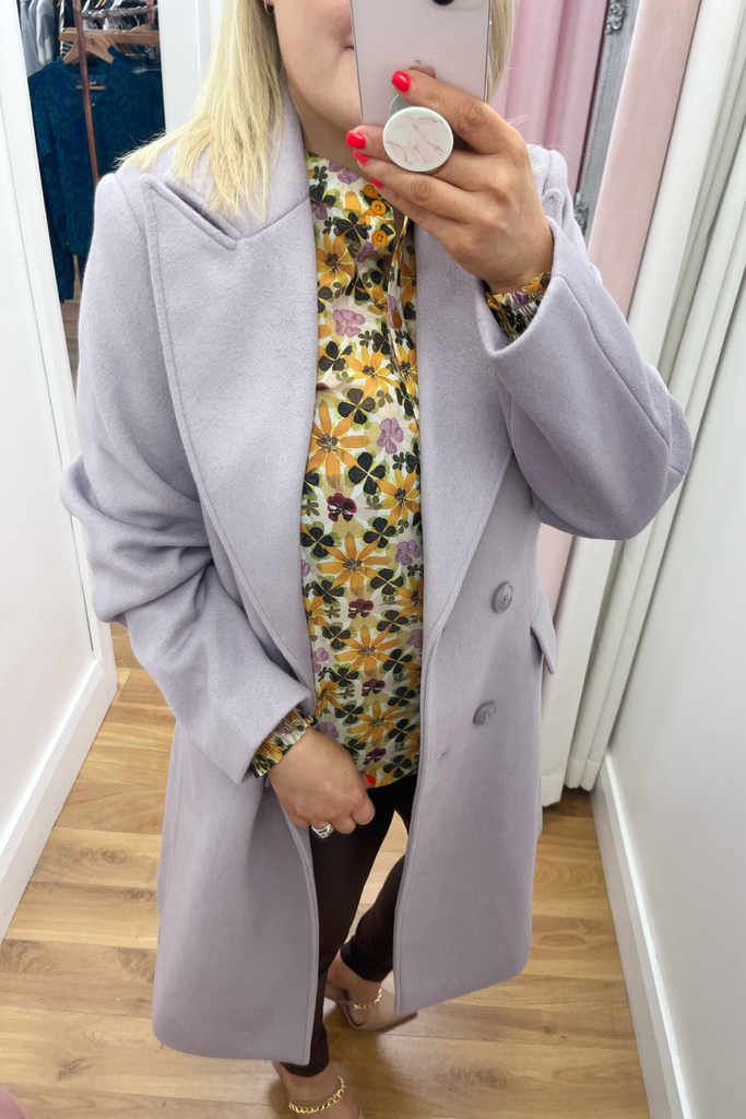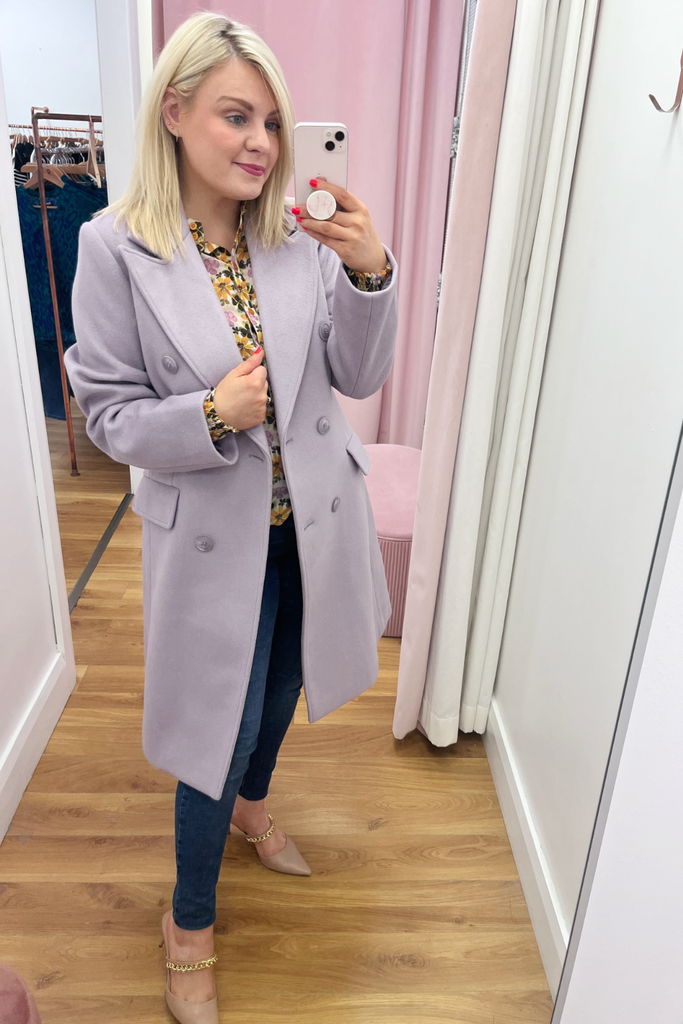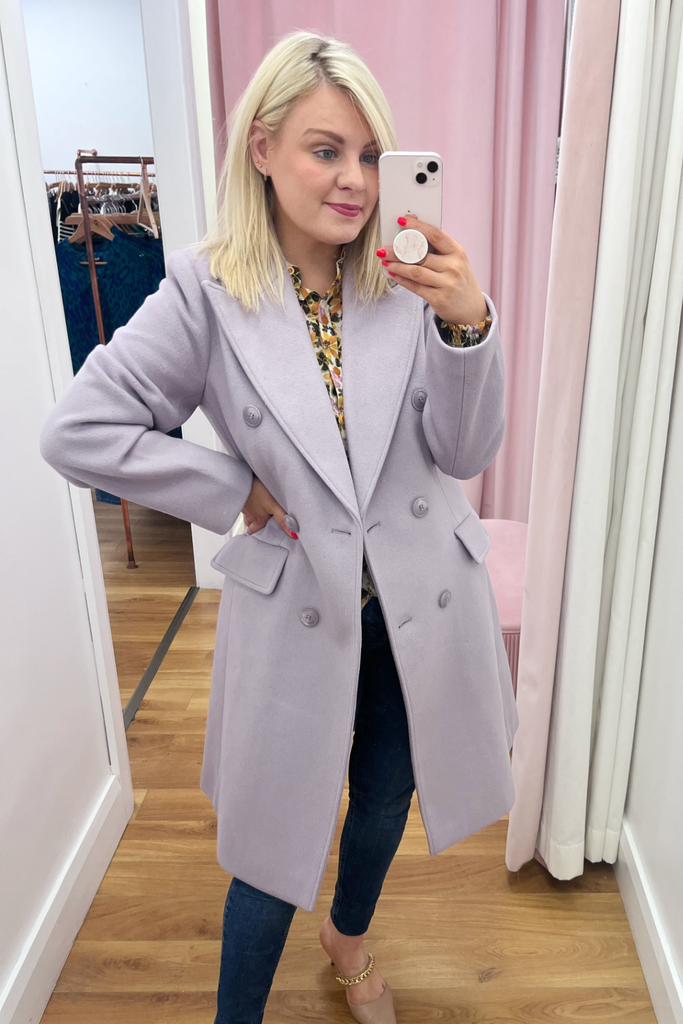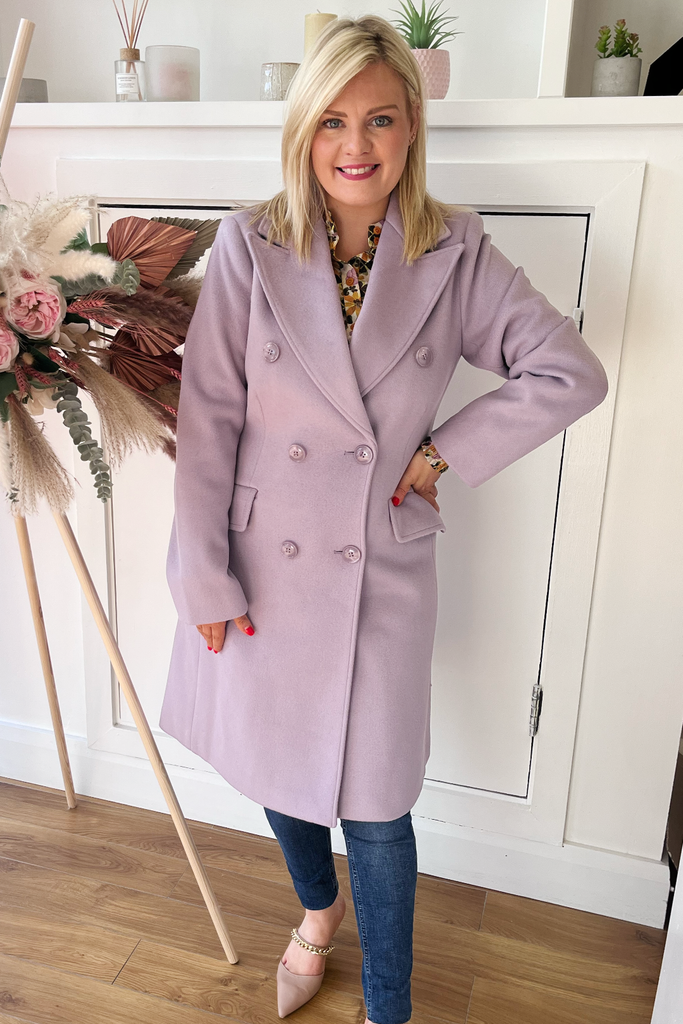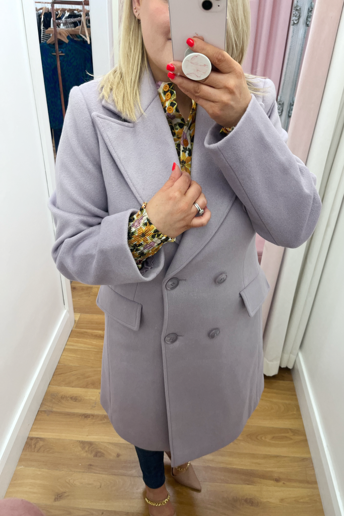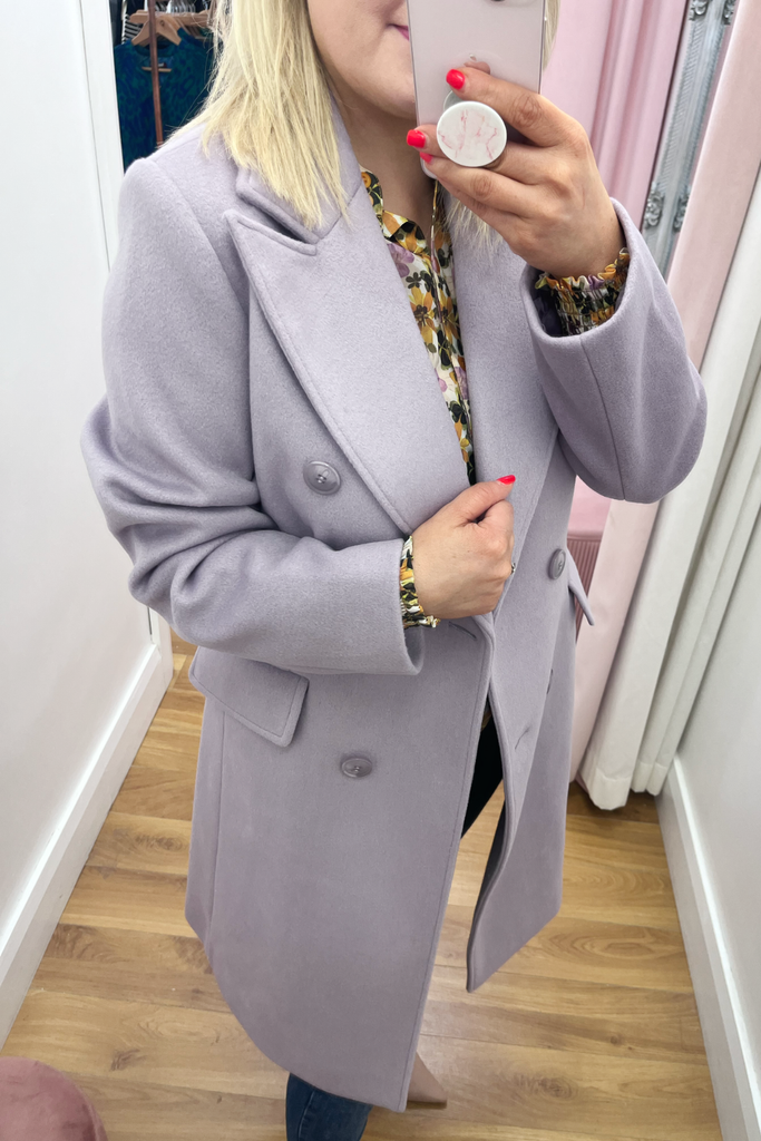 Super soft Lilac dressy coat with double button, front fold-over pockets and lapel. The perfect dressy style for this season