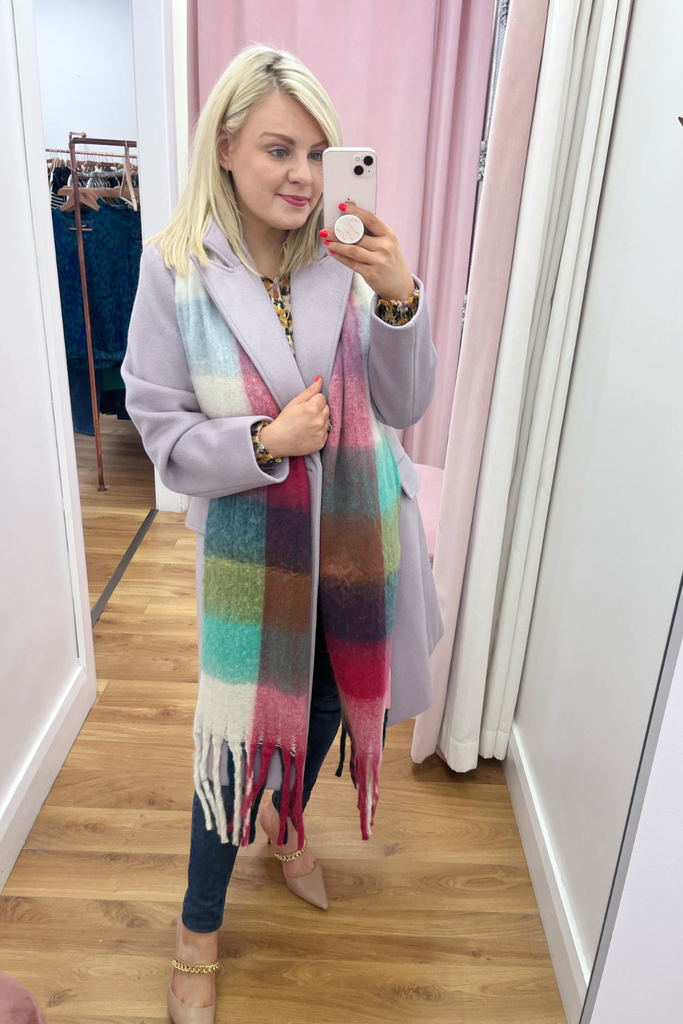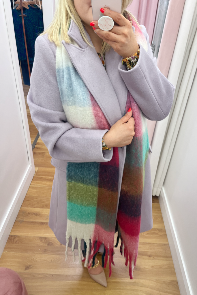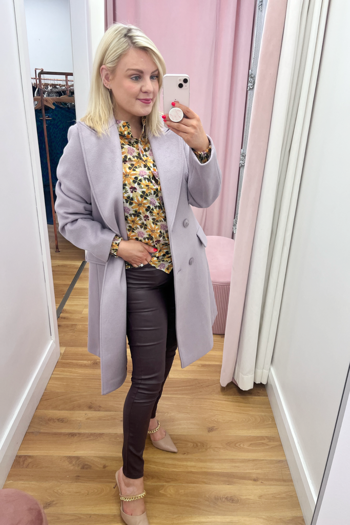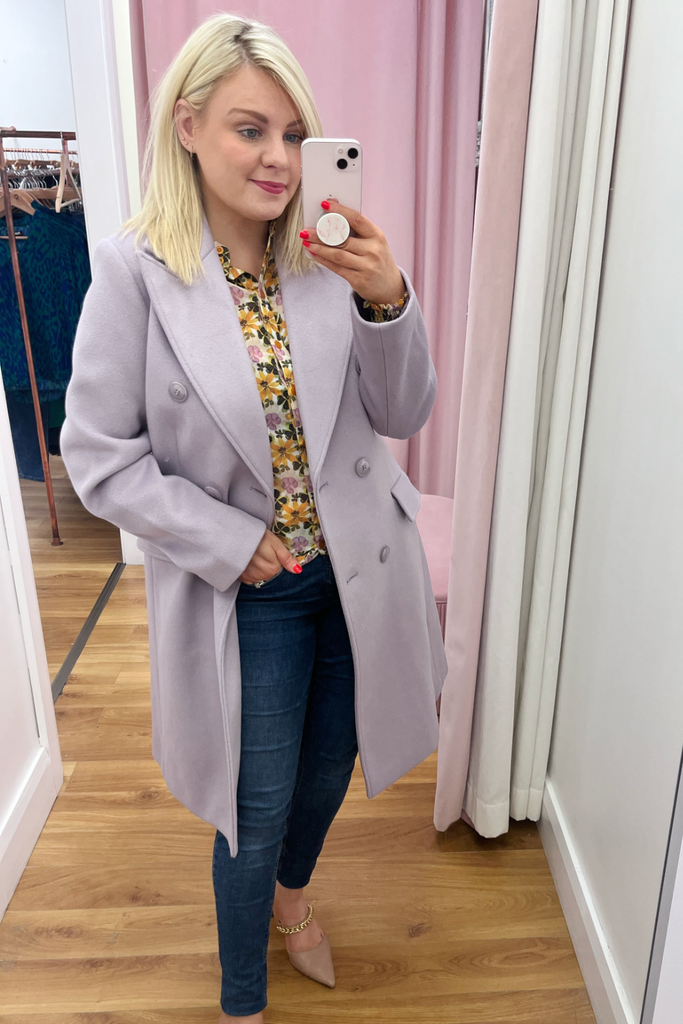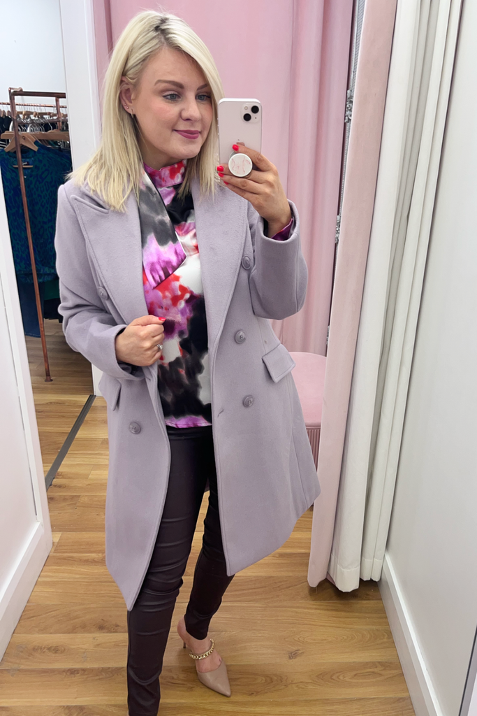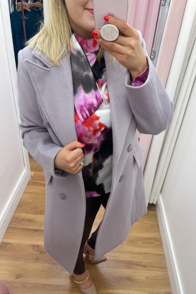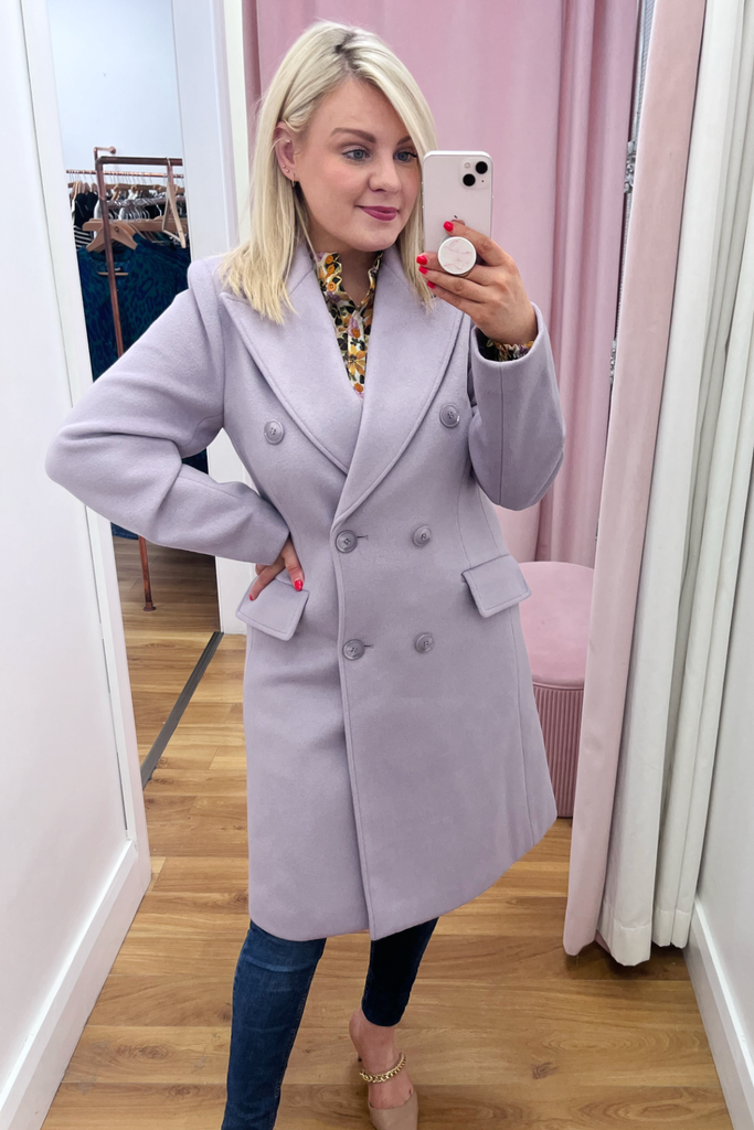 Super soft Lilac dressy coat with double button, front fold-over pockets and lapel. The perfect dressy style for this season
