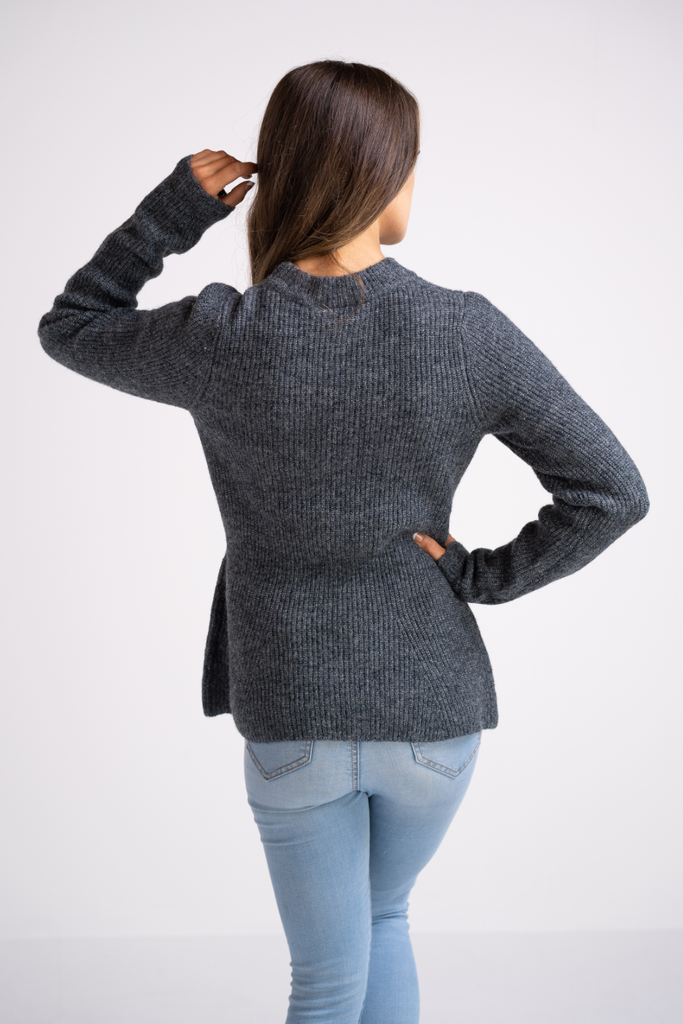 Super soft navy knit. Features a round neckline, full length sleeve and peplum waist