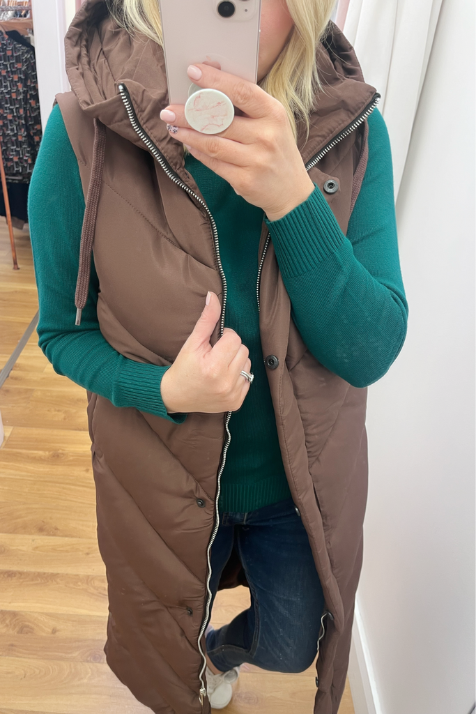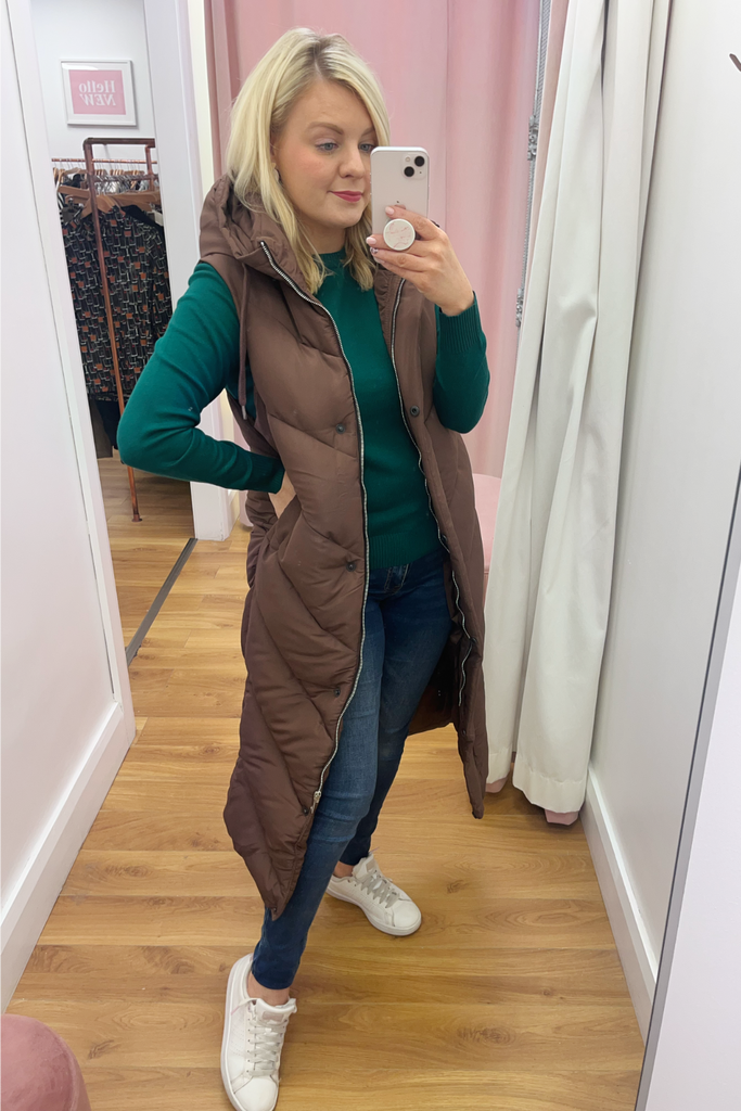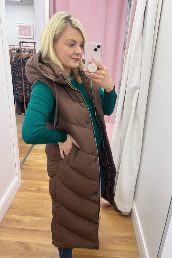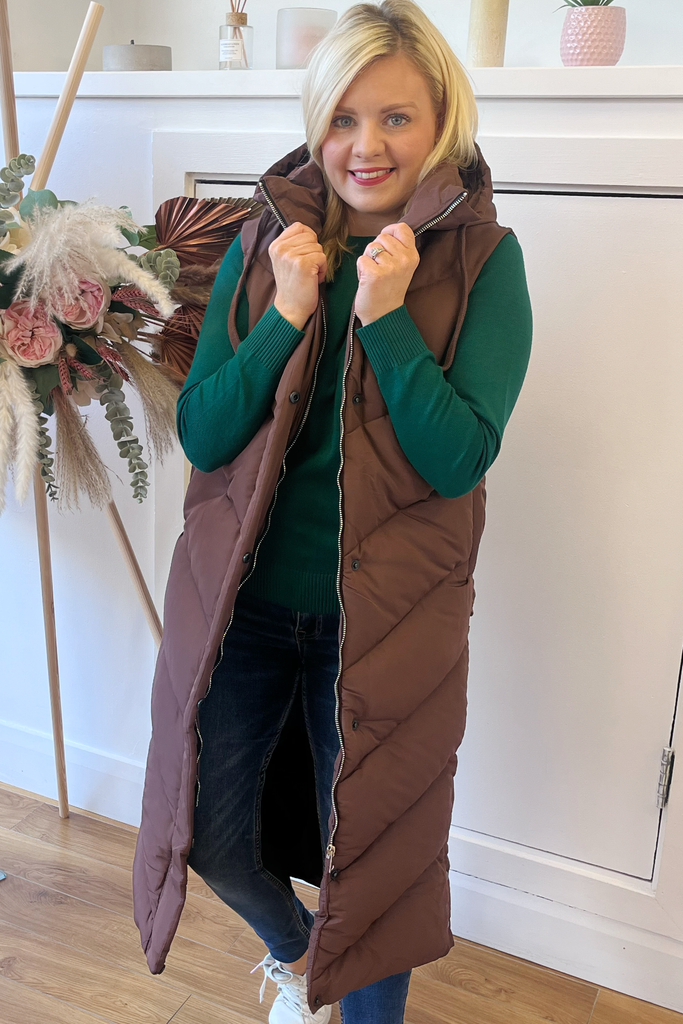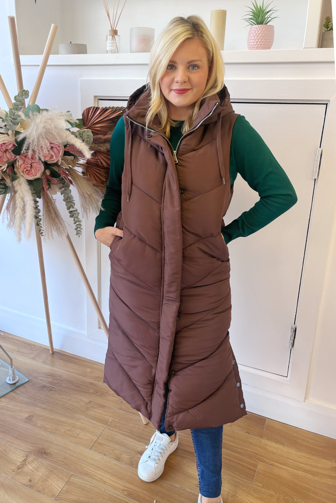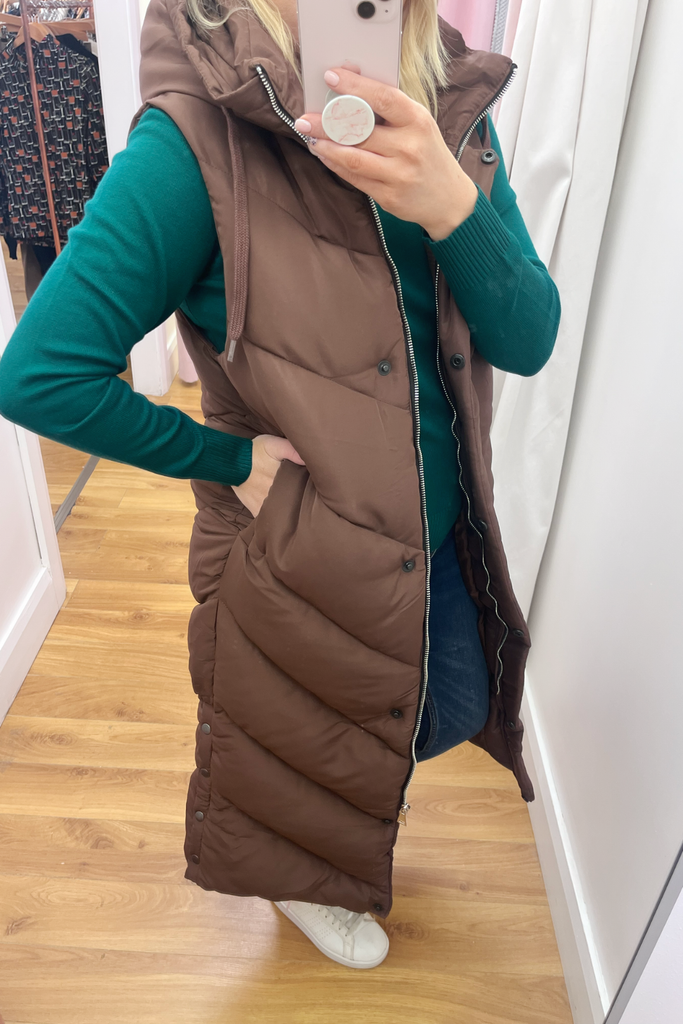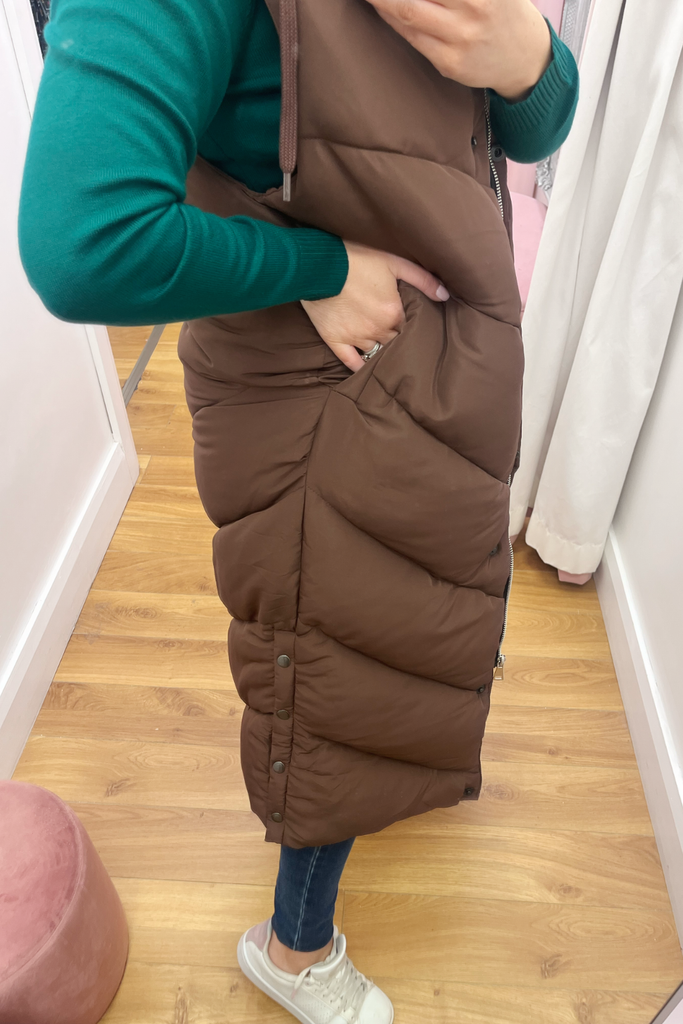 Longer length padded puffer gilet with hood and drawstring. Features a zip up and buttoned front, side pockets and side button detail. Amazing length to give coverage and warmth. Fully linedM