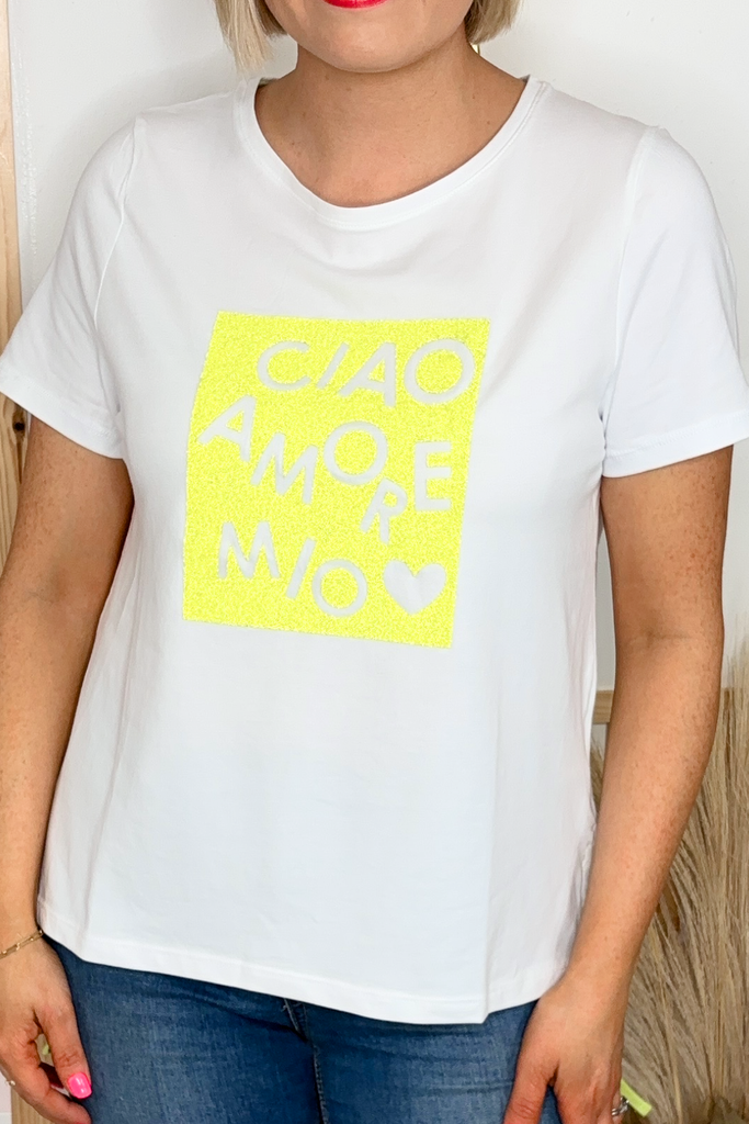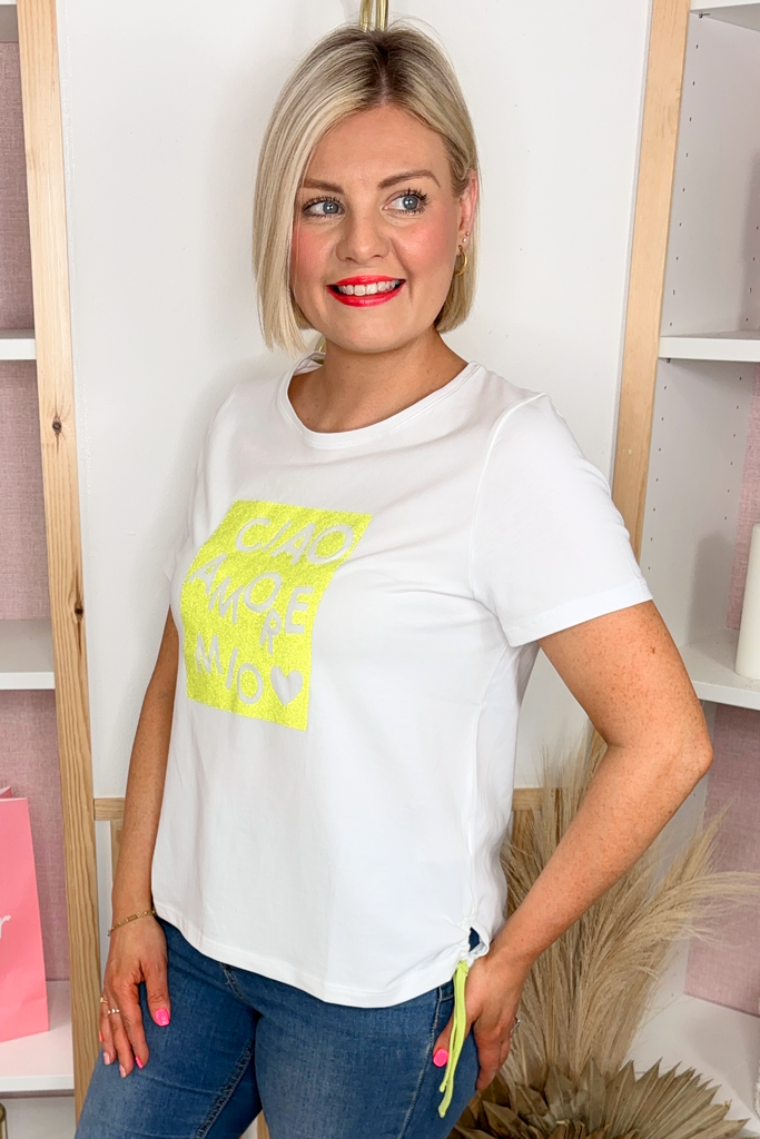 Round neck tee with metallic lime motif and contrasting side tie detail