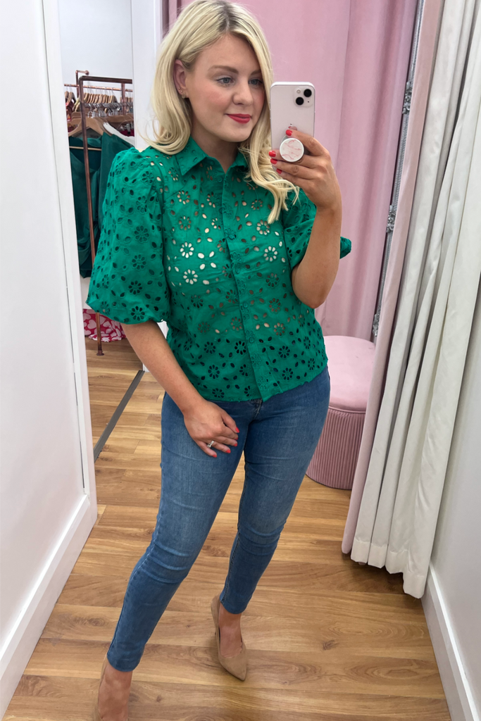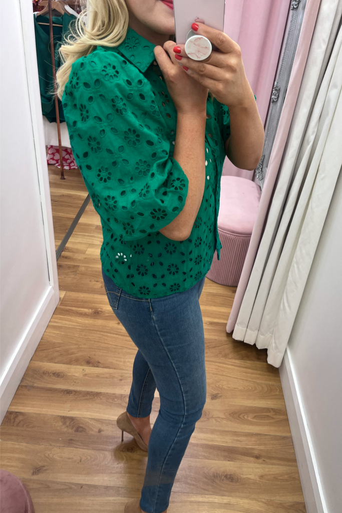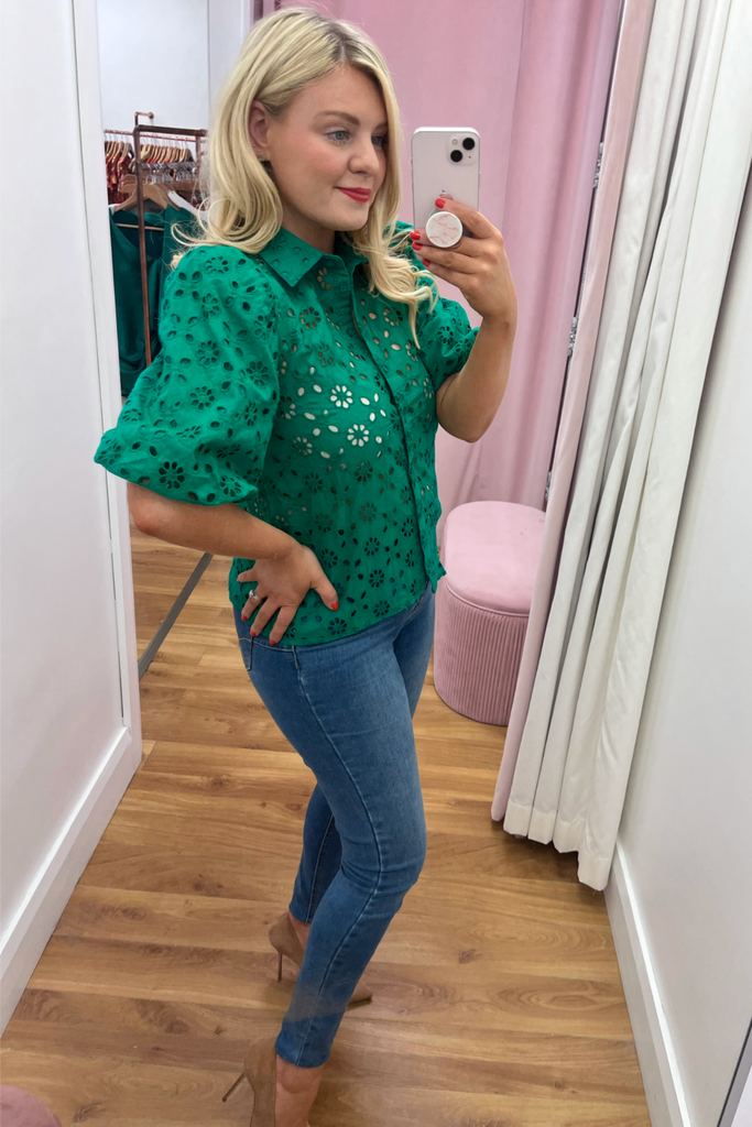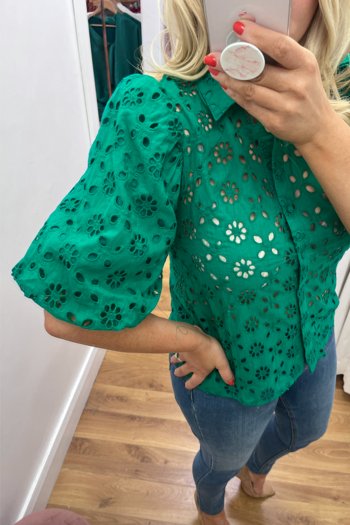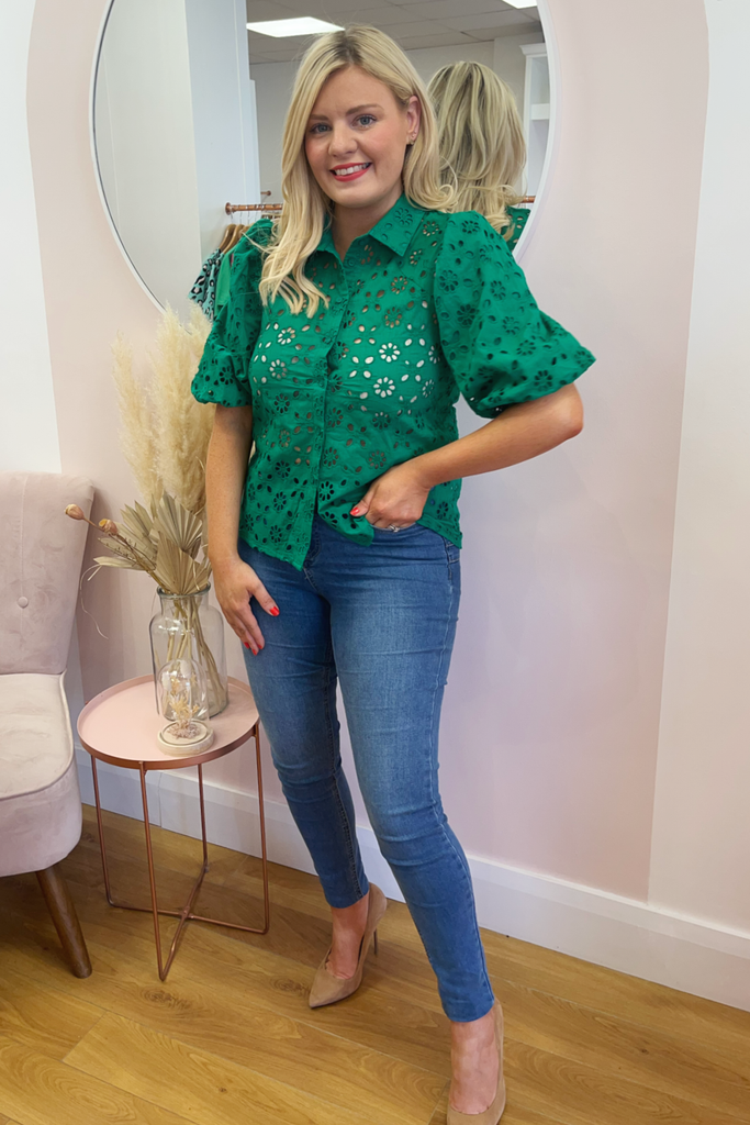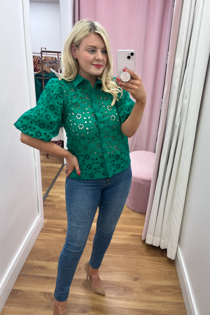 Collared buttoned blouse with Broderie Anglaise and statement half puff sleeves. This style is unlined with eyelet embroidery. It would require nude underwear/nude cami underneath (not included)