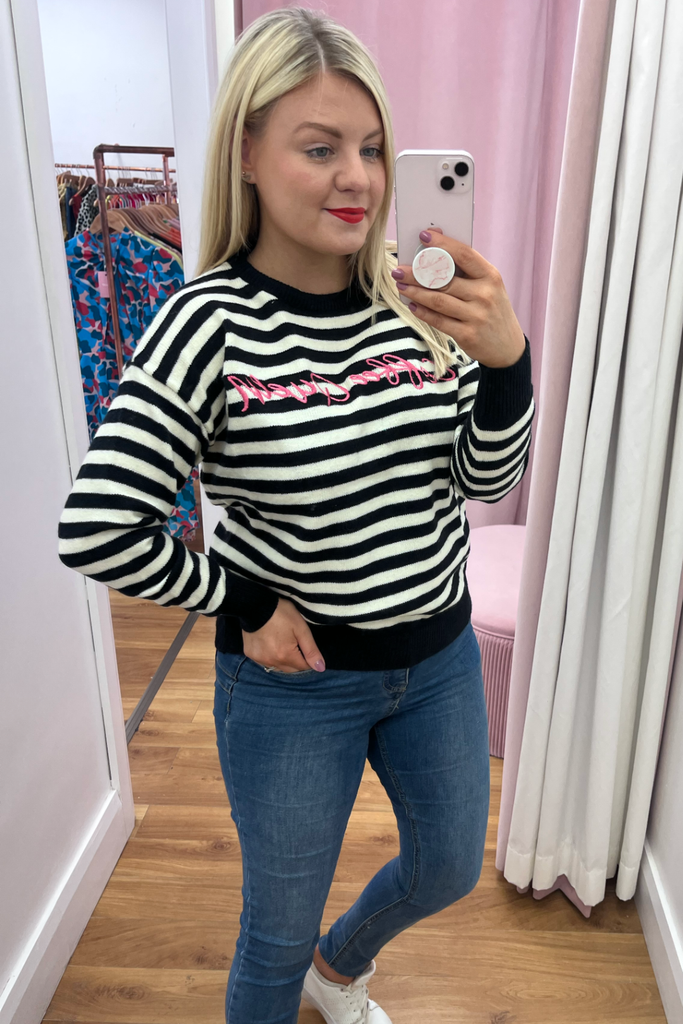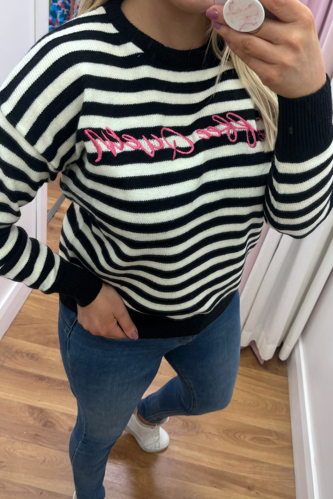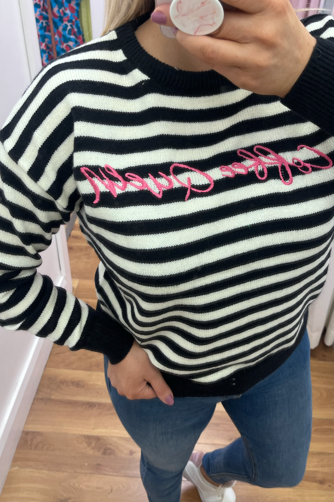 Striped knitted jumper with embroidered "Coffee Queen' in contrasting colours. Round neckline lightweight jumper with contrasting neckline, cuff and band. The perfect pop of print and colour for your casual Autumn wardrobe!