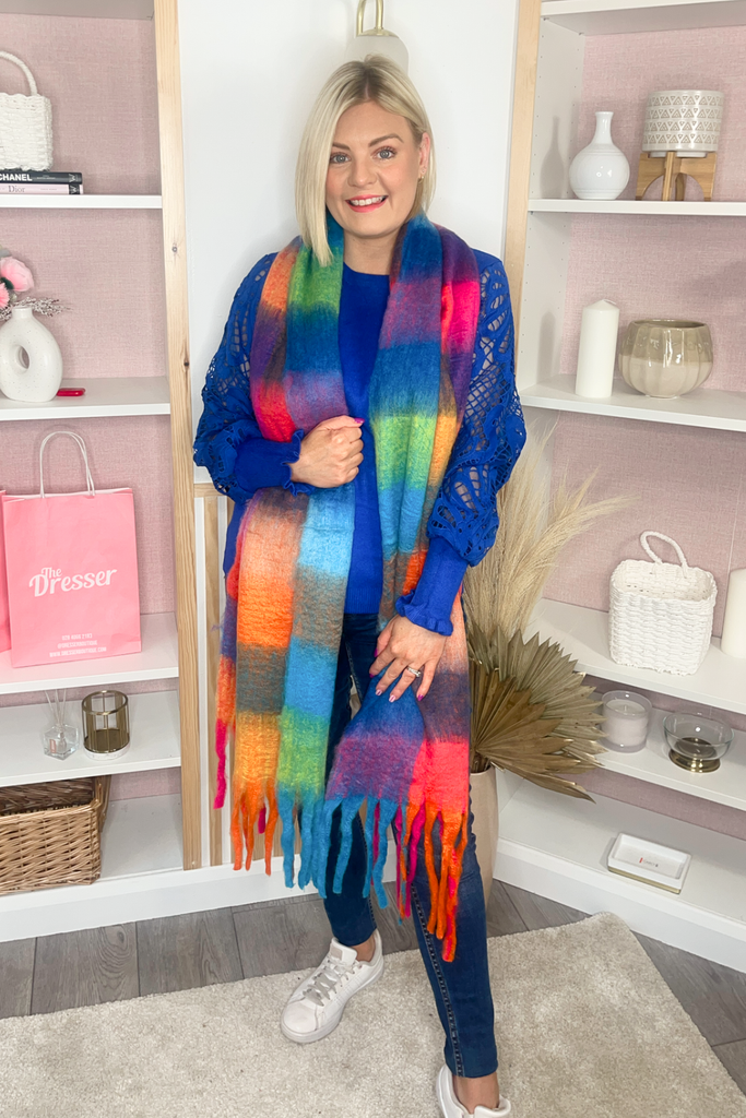 This incredibly soft and cozy blanket scarf is artfully designed with a mix of vibrant colours and tasseled ends