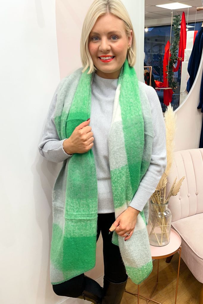 This incredibly soft and cozy blanket scarf is artfully designed with a mix of greens
