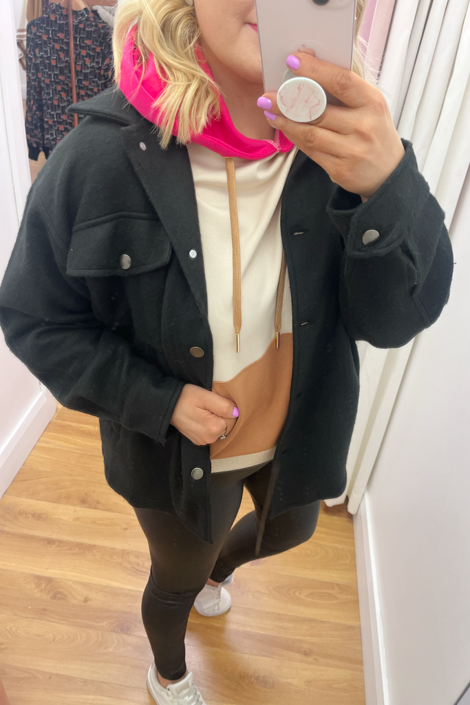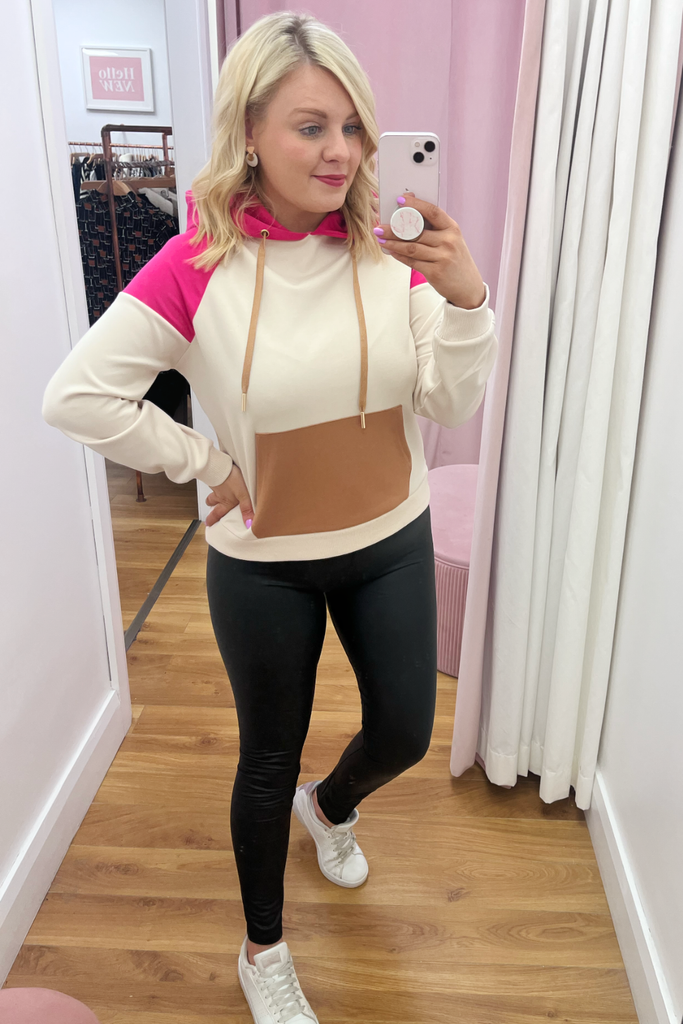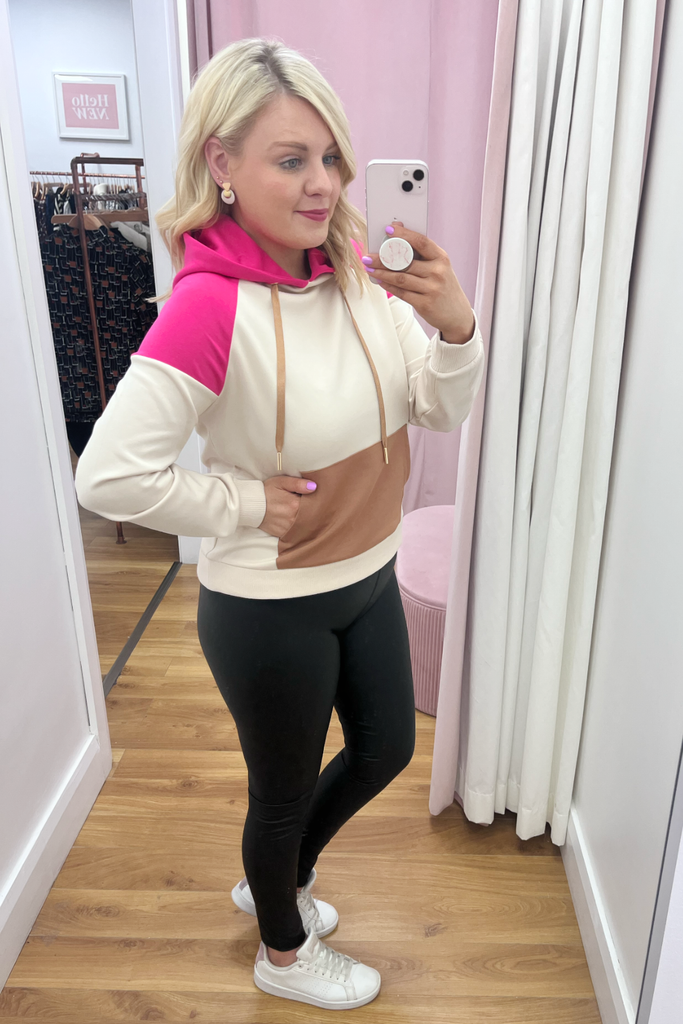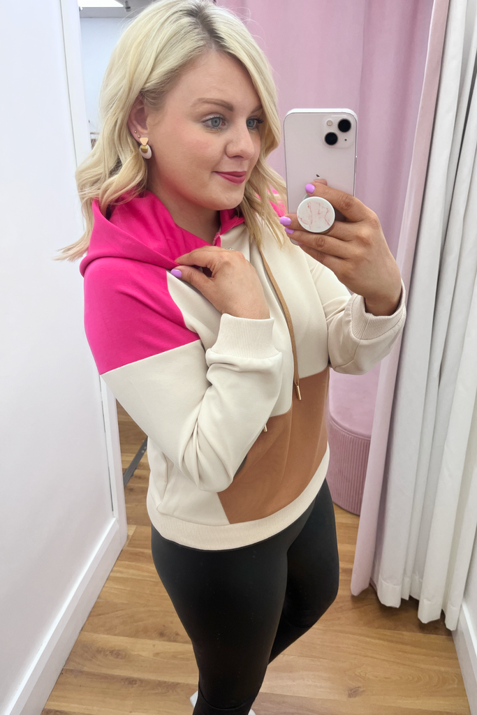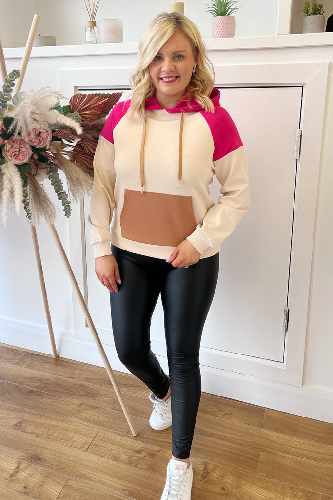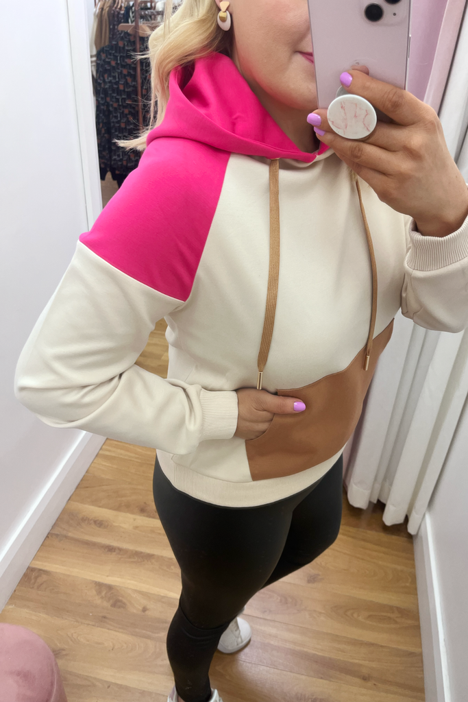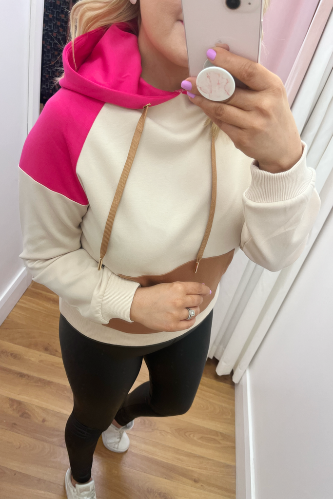 Mid-weight silky feel hooded jumper with contrasting stone/chocolate/fuchsia pink colour blocking. Features front long pocket and drawstring hood