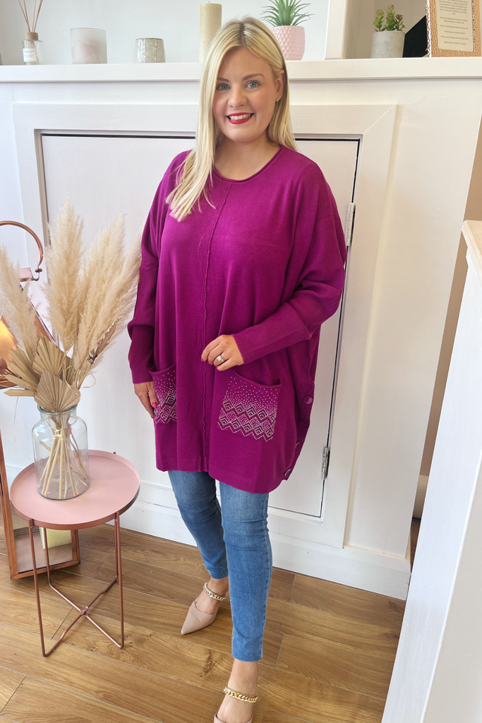 A beautiful mix of comfortable and luxurious! Our knitted cape jumper has sleeves and embellished pockets. With faux button detail on each side. Many colours available.