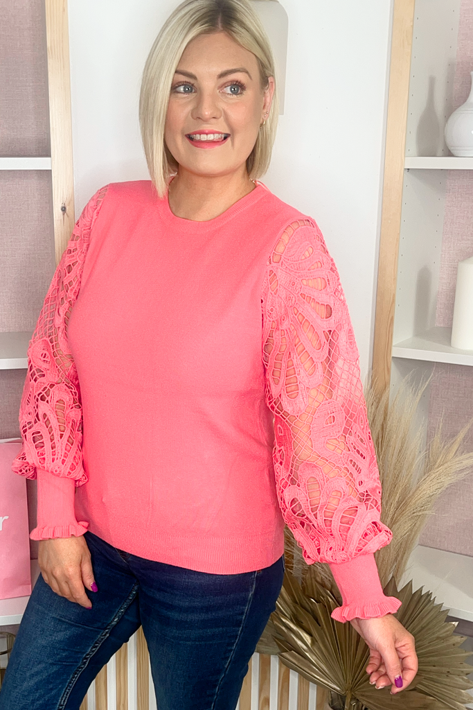 Round neck jumper with statement crochet sleeves and deep cuff. Multiple colours available
