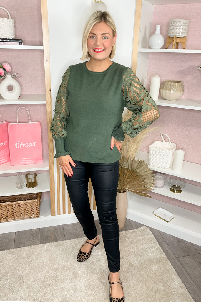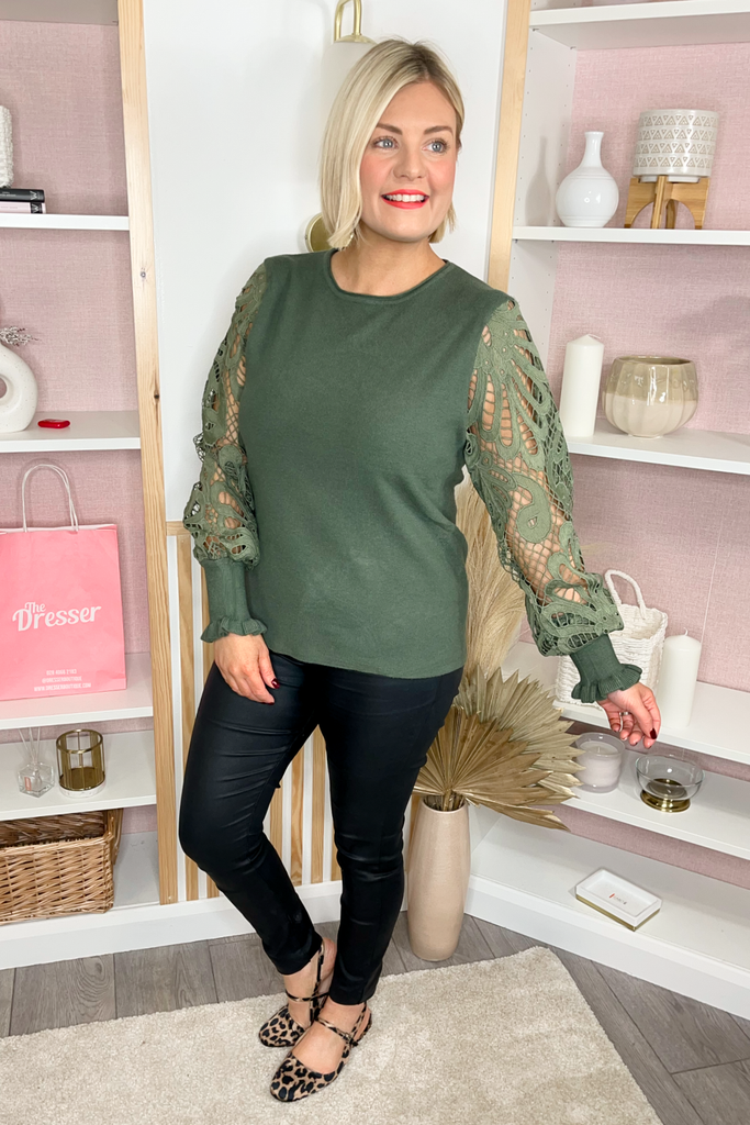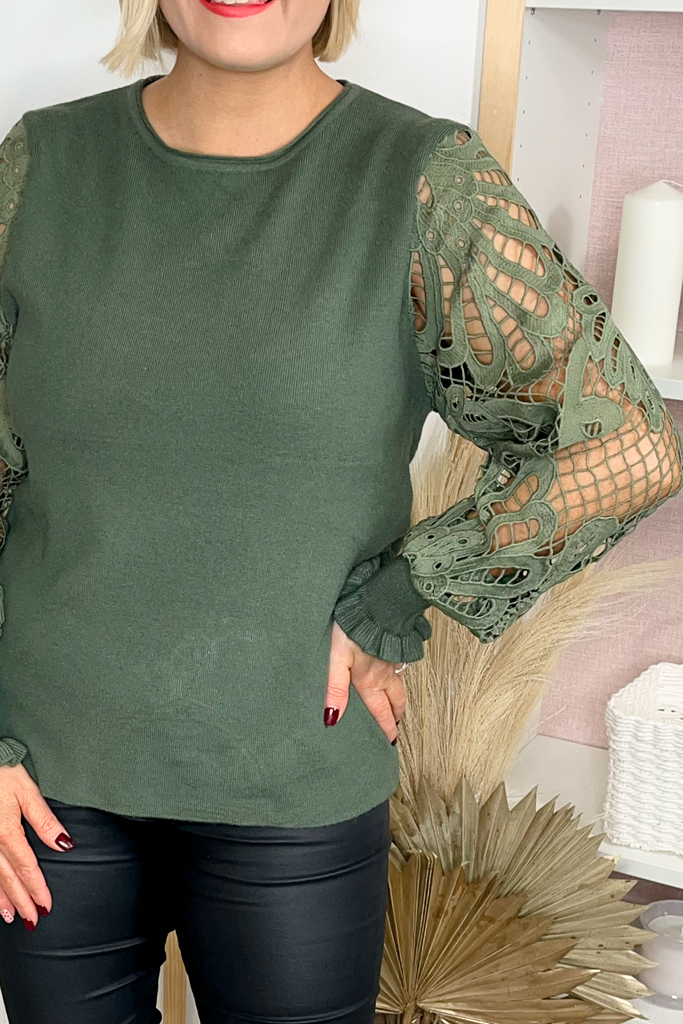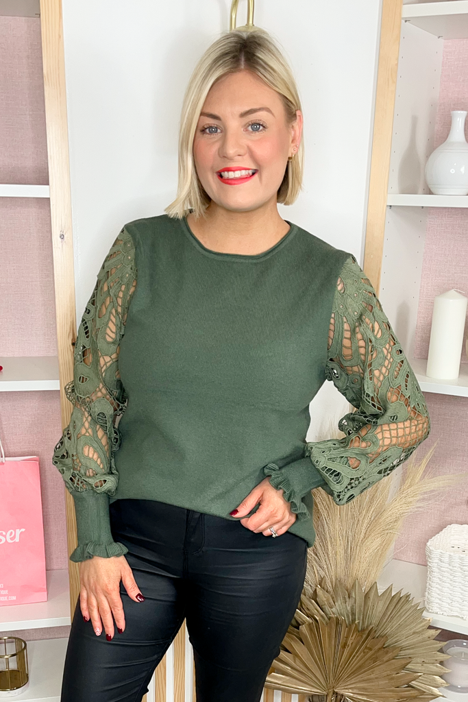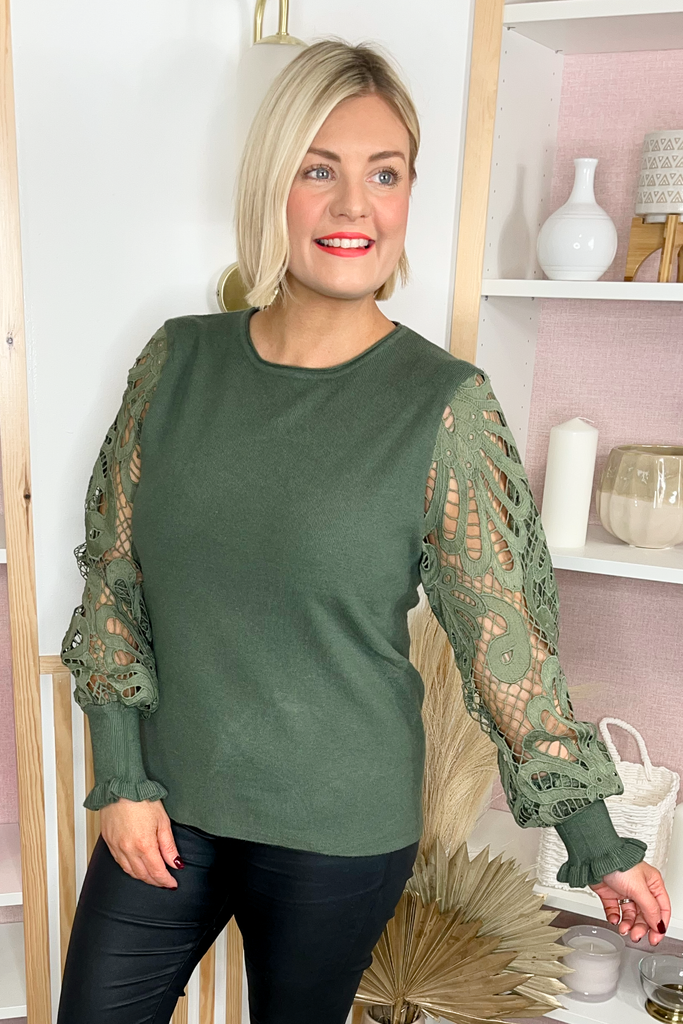 Round neck jumper with statement crochet sleeves and deep cuff. Multiple colours available