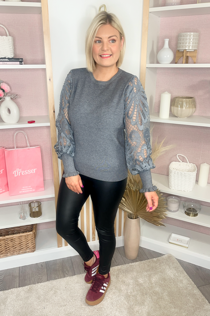 Round neck jumper with statement crochet sleeves and deep cuff. Multiple colours available