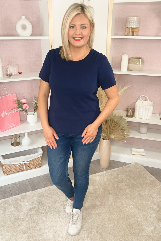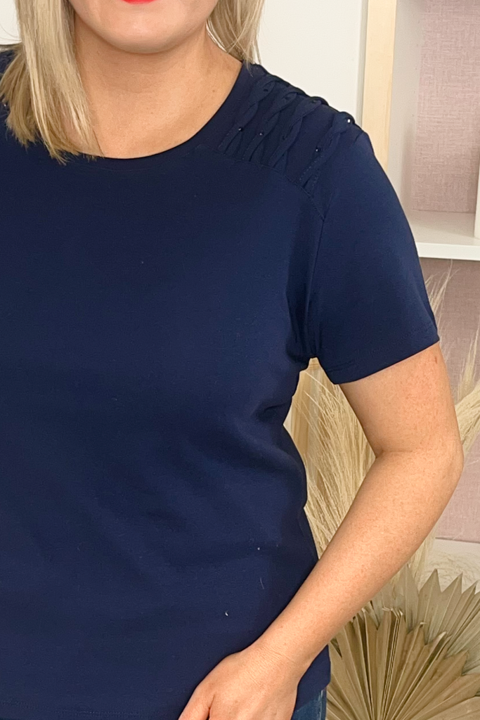Super soft tee with round neckline, half sleeve and latticed and jewelled embellishment.