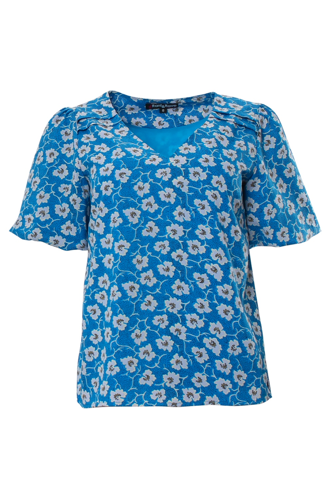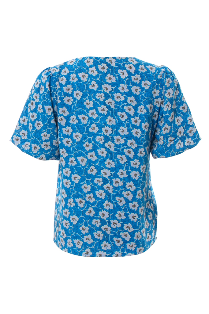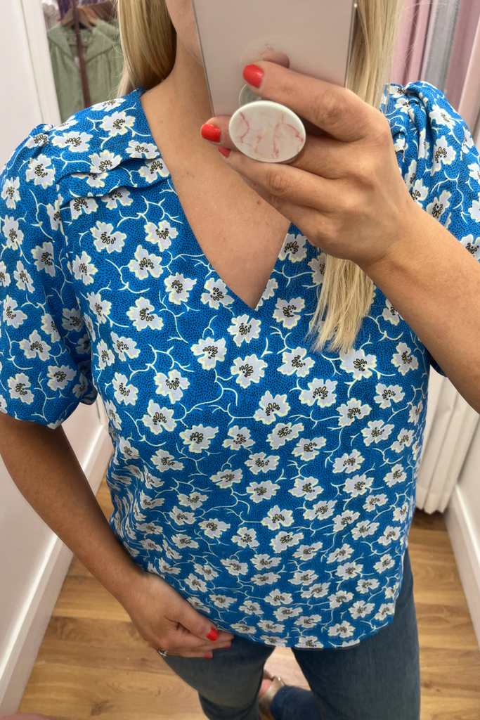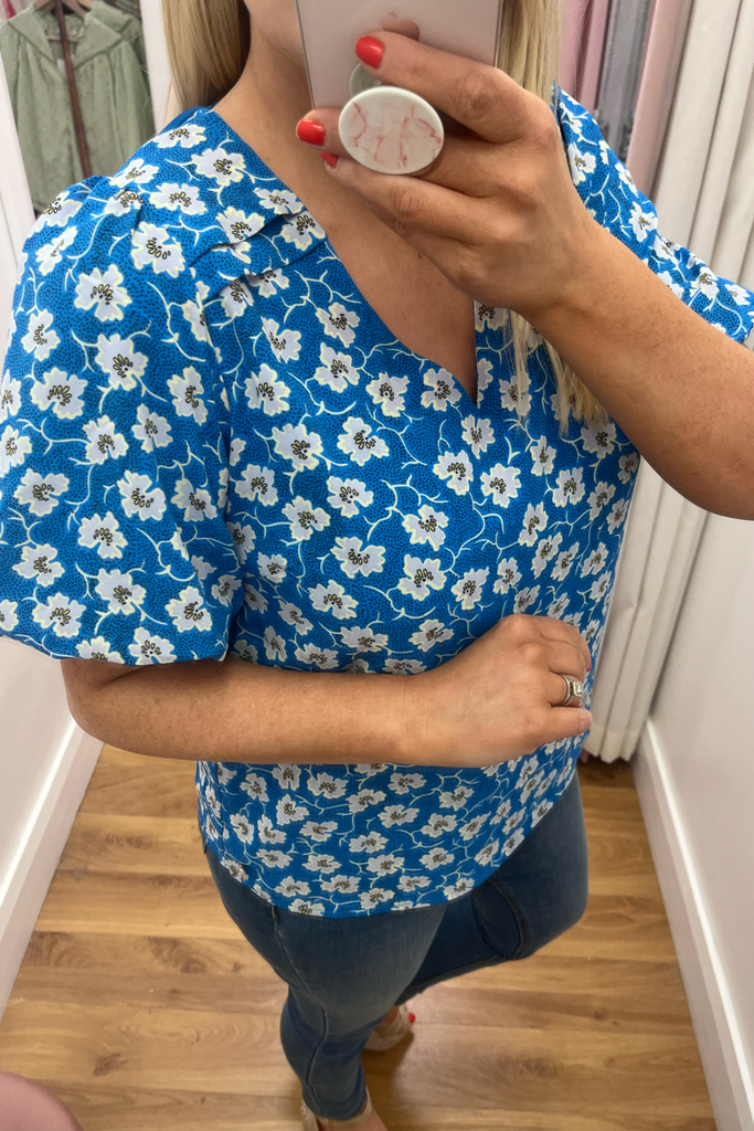 V-neck blouse with relaxed body and short balloon sleeves with soft pintucks to the shoulders for a feminine feel. In a striking blue with white floral print