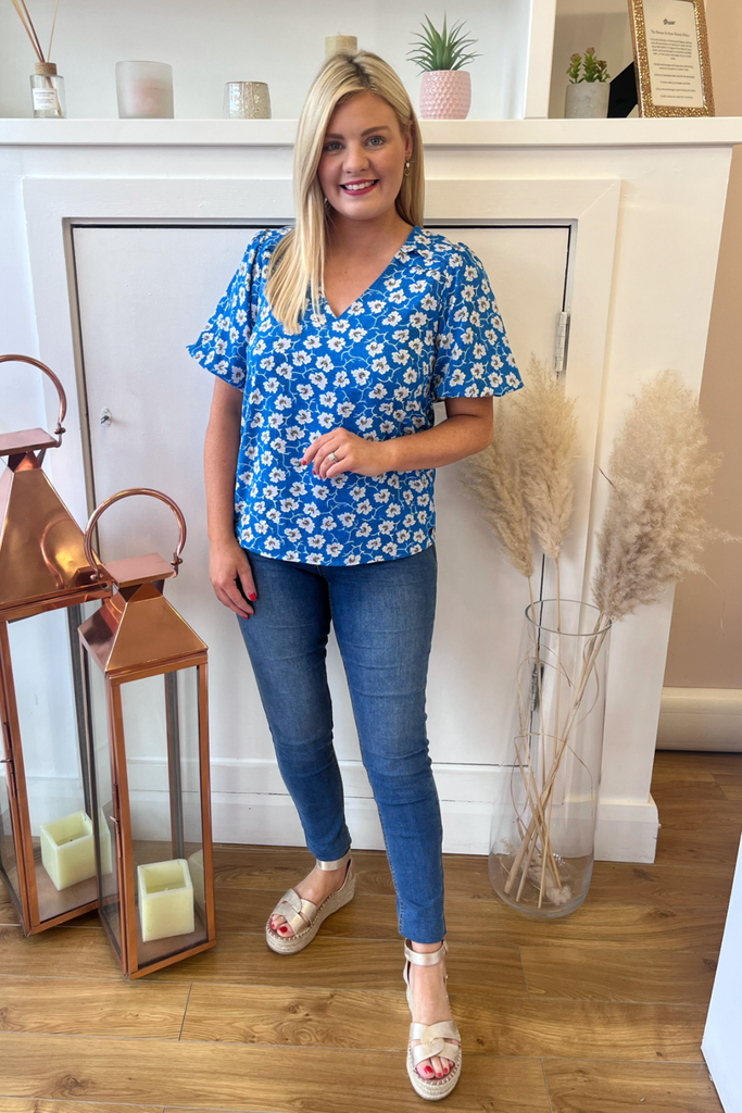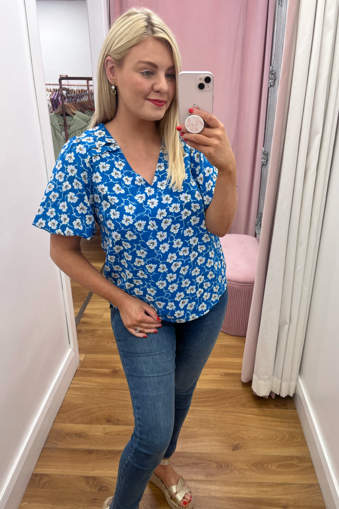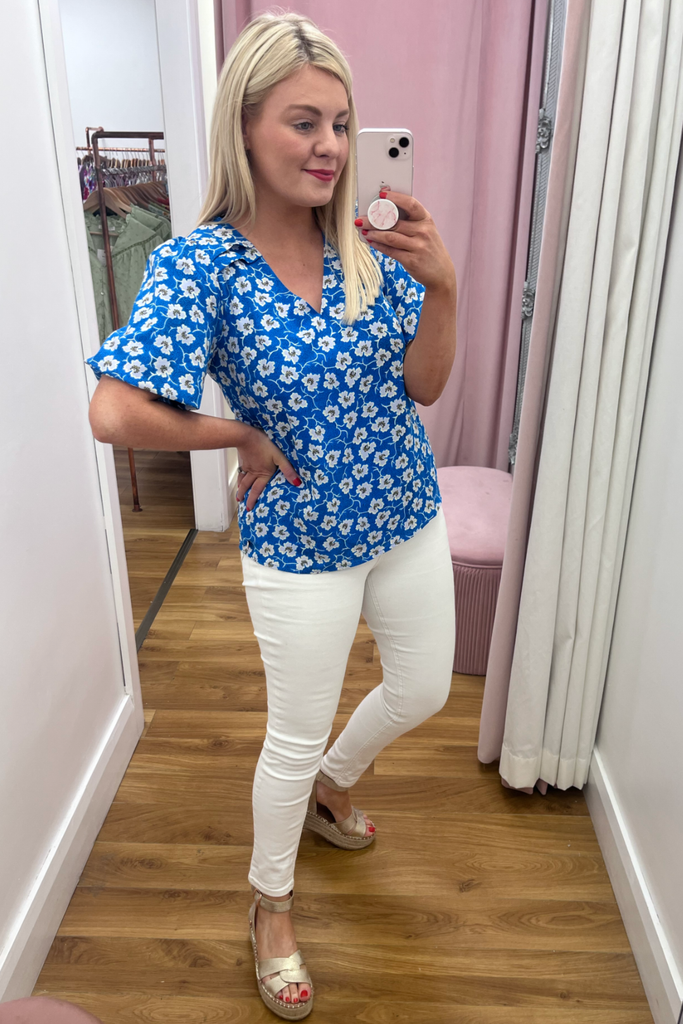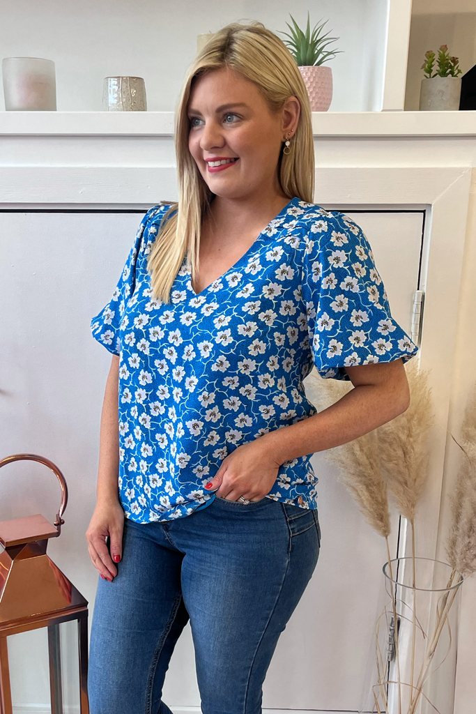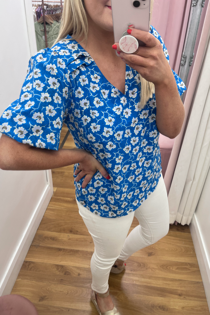 V-neck blouse with relaxed body and short balloon sleeves with soft pintucks to the shoulders for a feminine feel. In a striking blue with white floral print