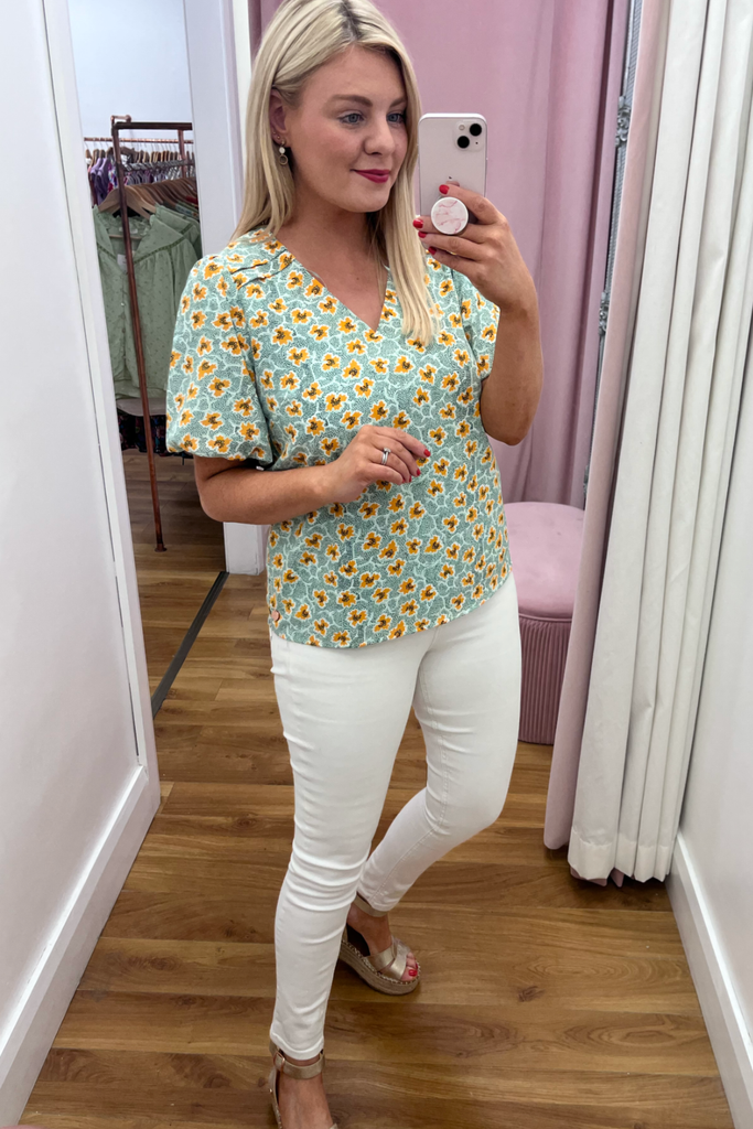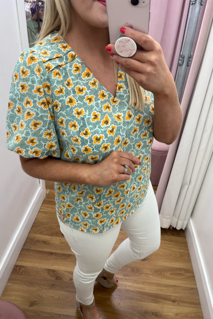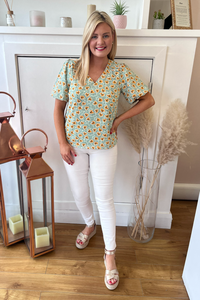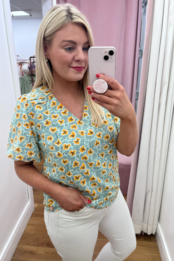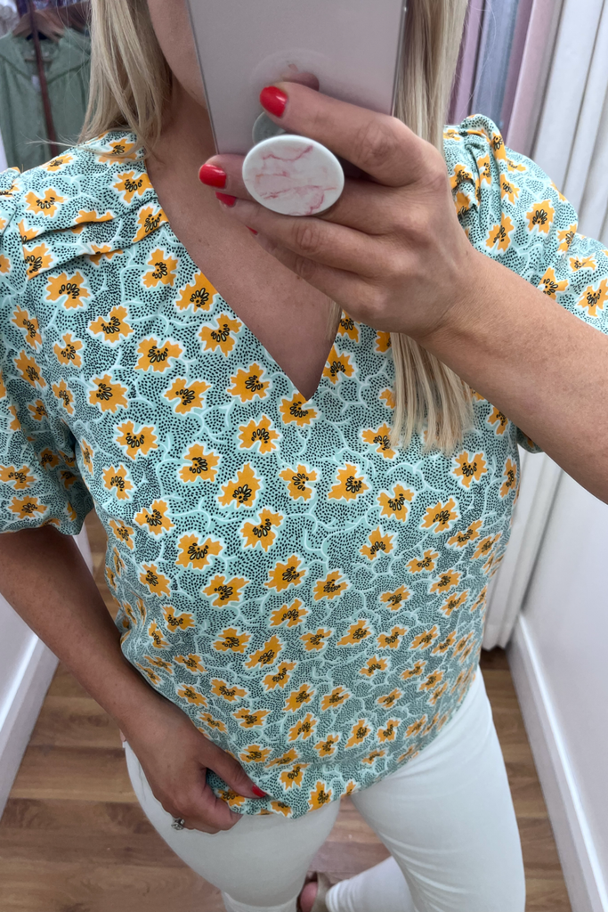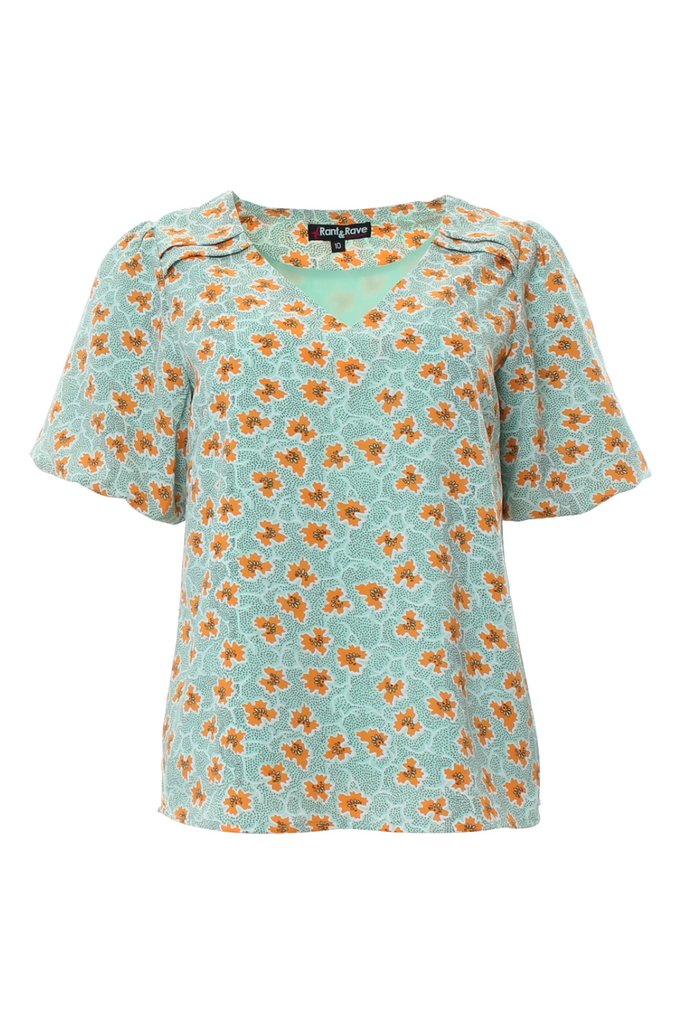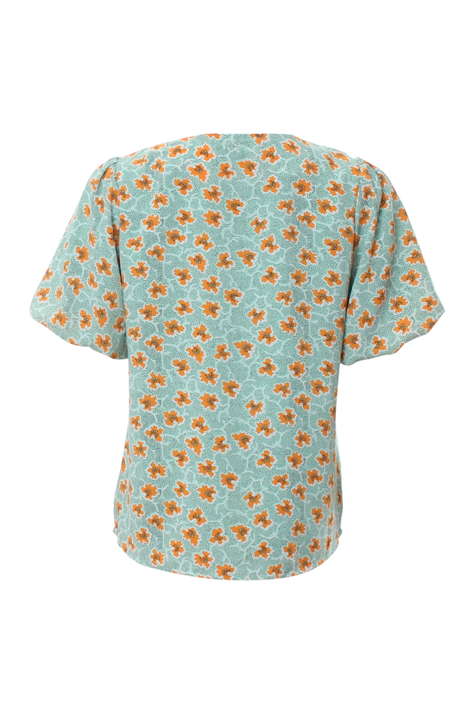 V-neck blouse with relaxed body and short balloon sleeves with soft pintucks to the shoulders for a feminine feel. In a soft mint green with orange floral print