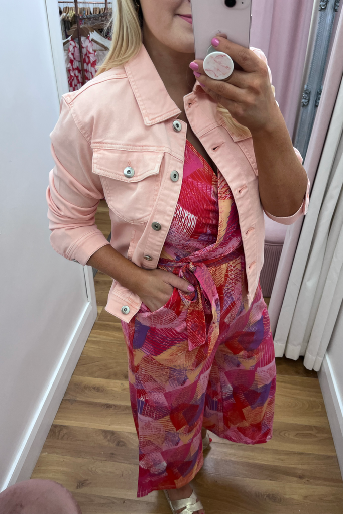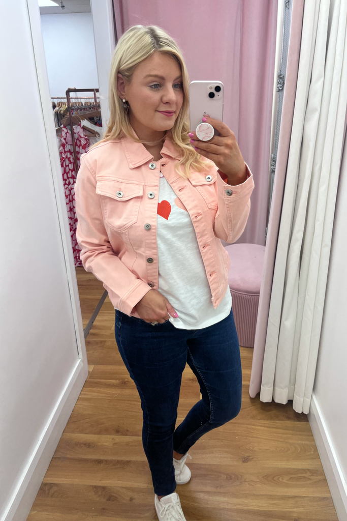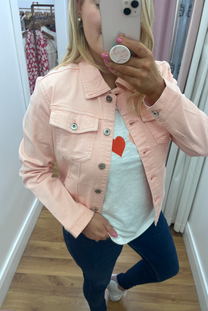 This light pink cotton stretch denim jacket is our fave new wardrobe essential! Team it with dresses, skirts or blue/white jeans.