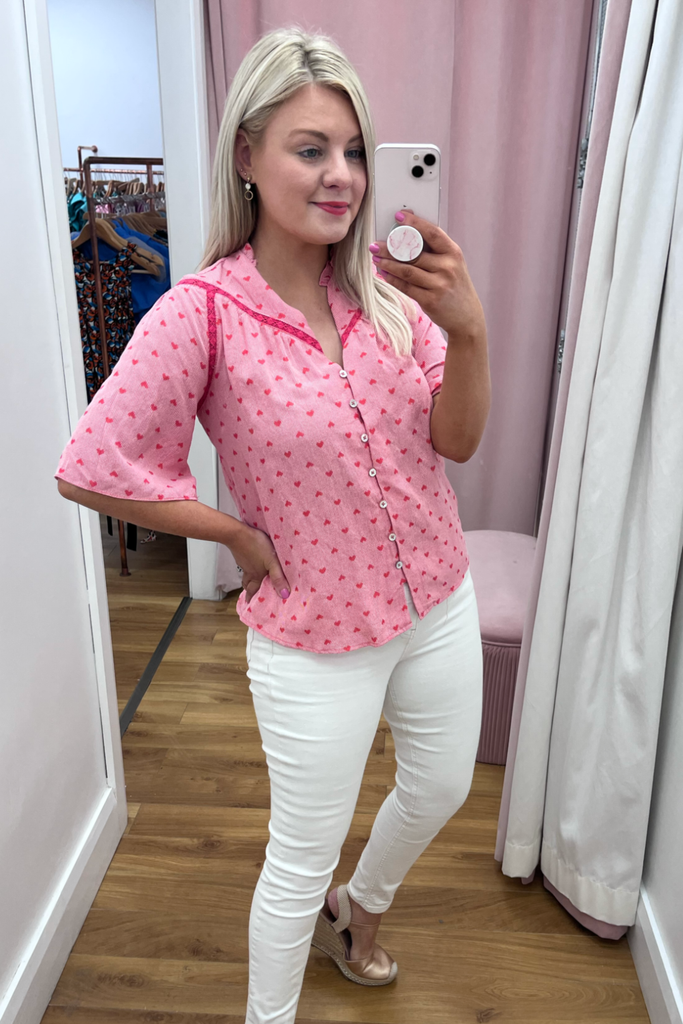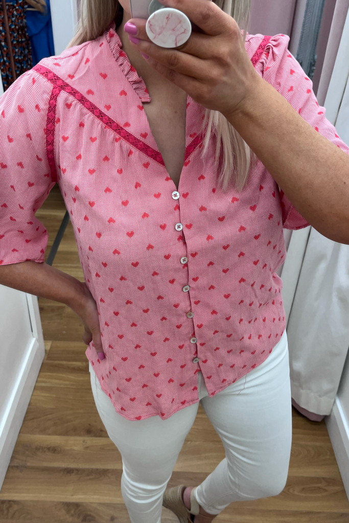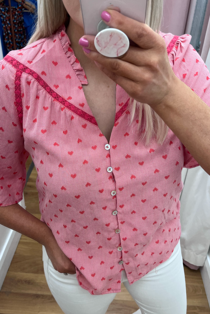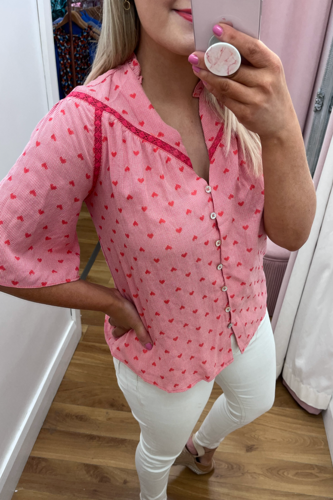Pretty red blouse with delicate heart print. Features wide half sleeves, V-neckline with buttons, and embroidery detail