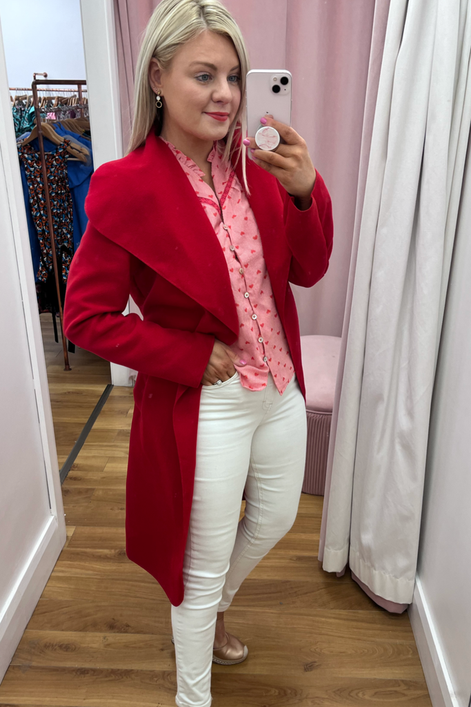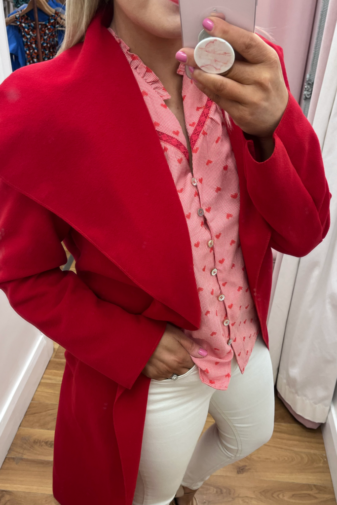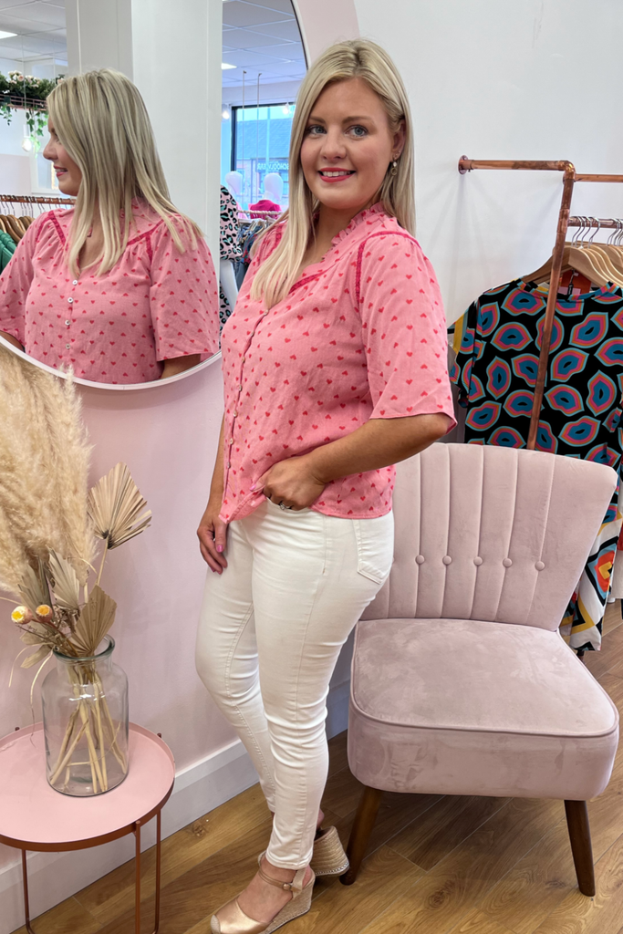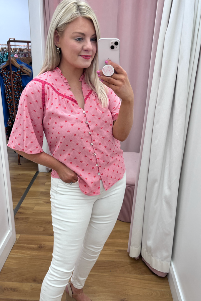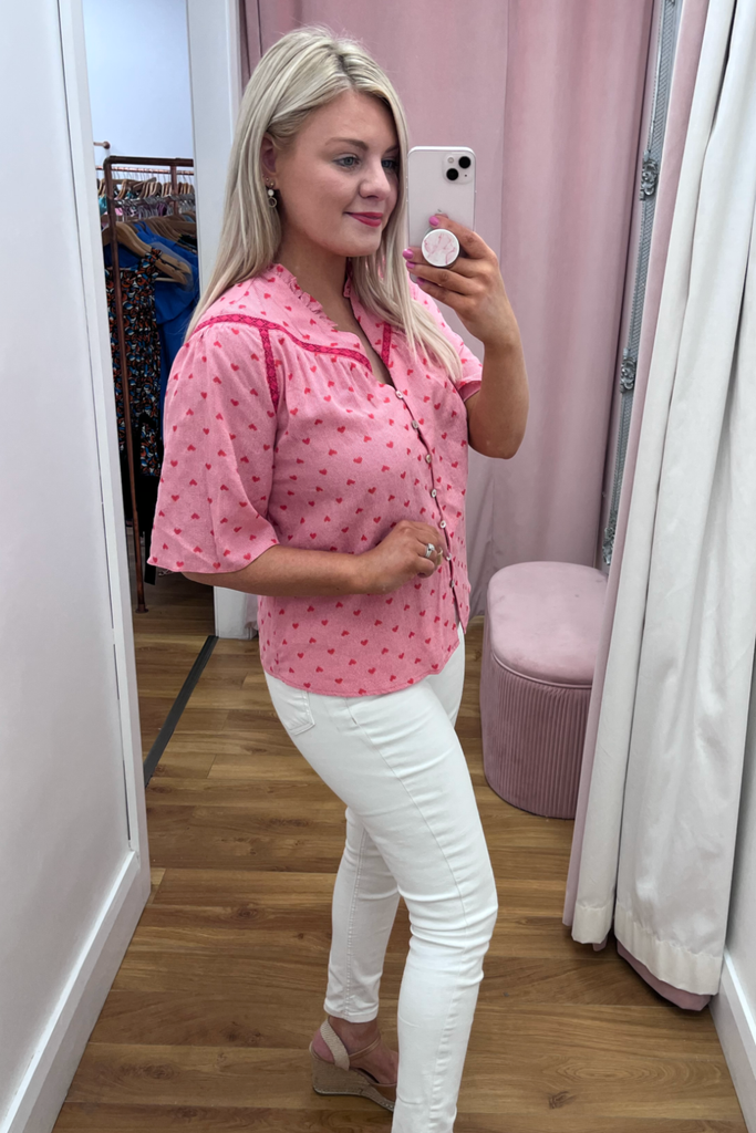 Pretty red blouse with delicate heart print. Features wide half sleeves, V-neckline with buttons, and embroidery detail