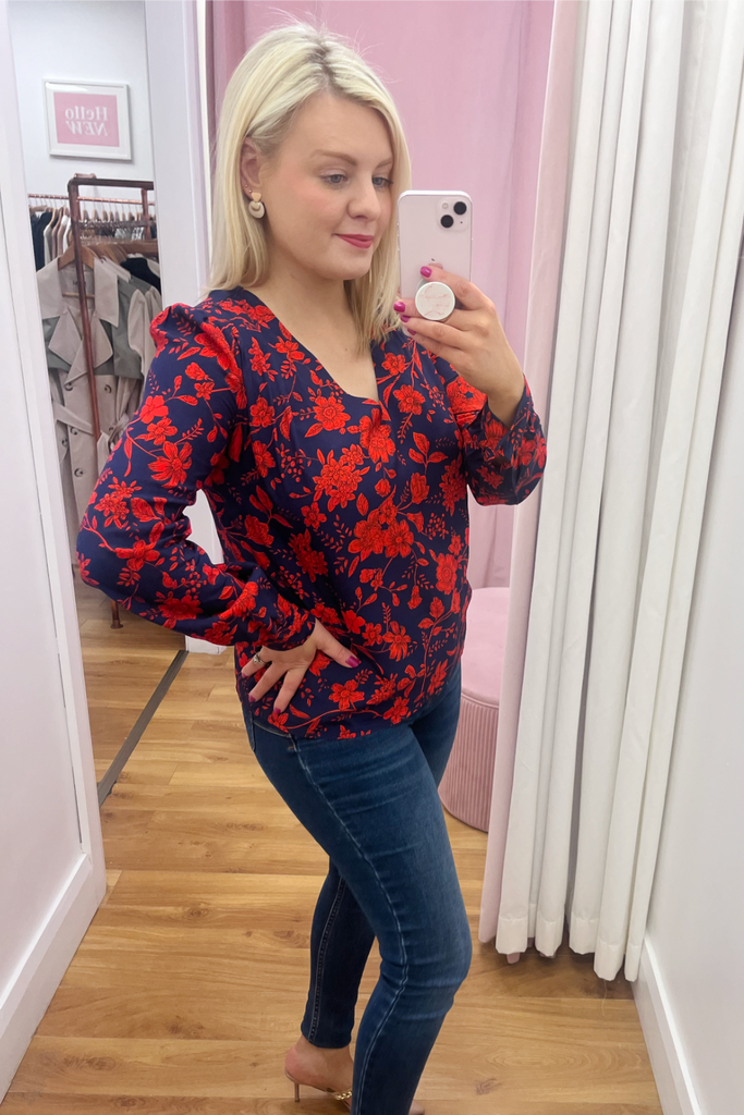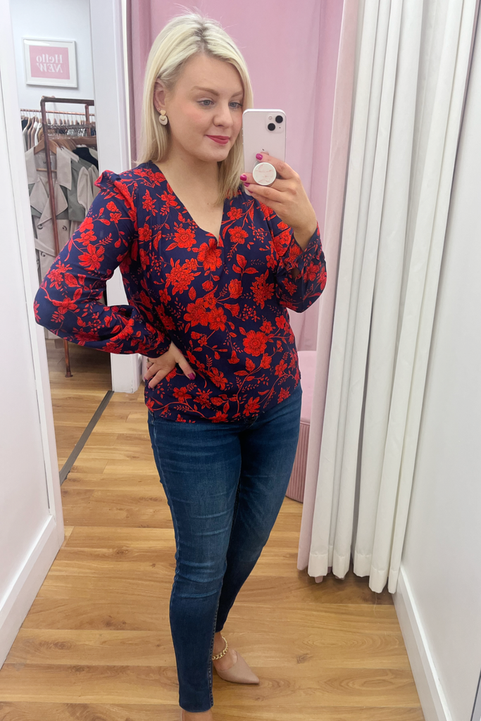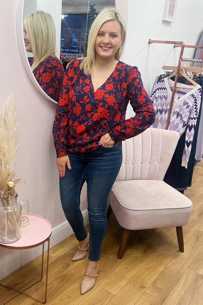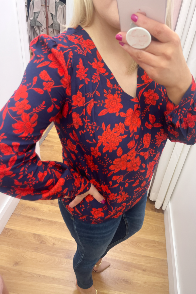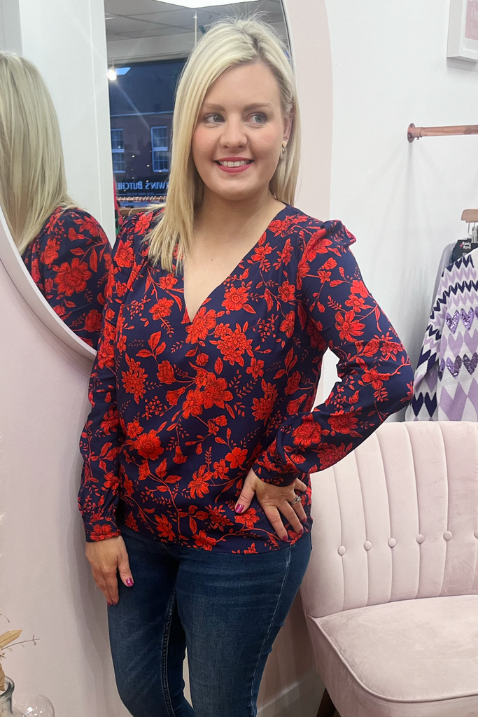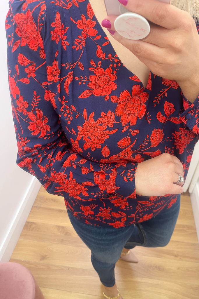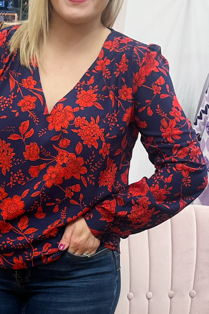 Striking navy blouse with bold red floral print. With V-neckline, buttoned down front and buttoned cuff. Also available in a collared blouse