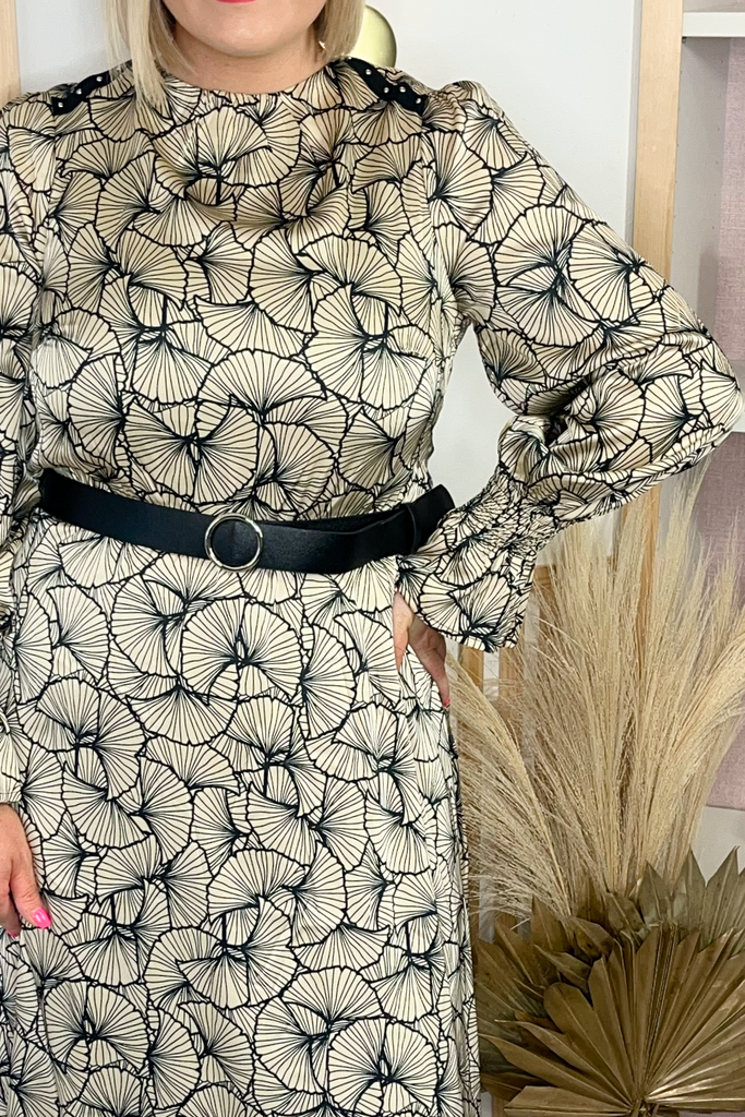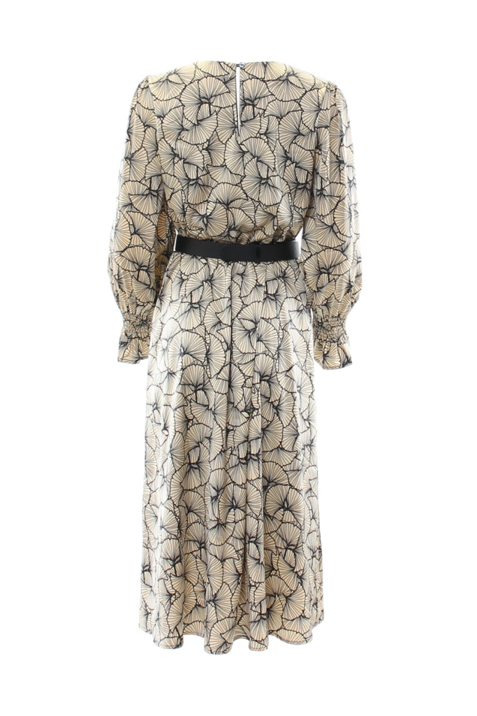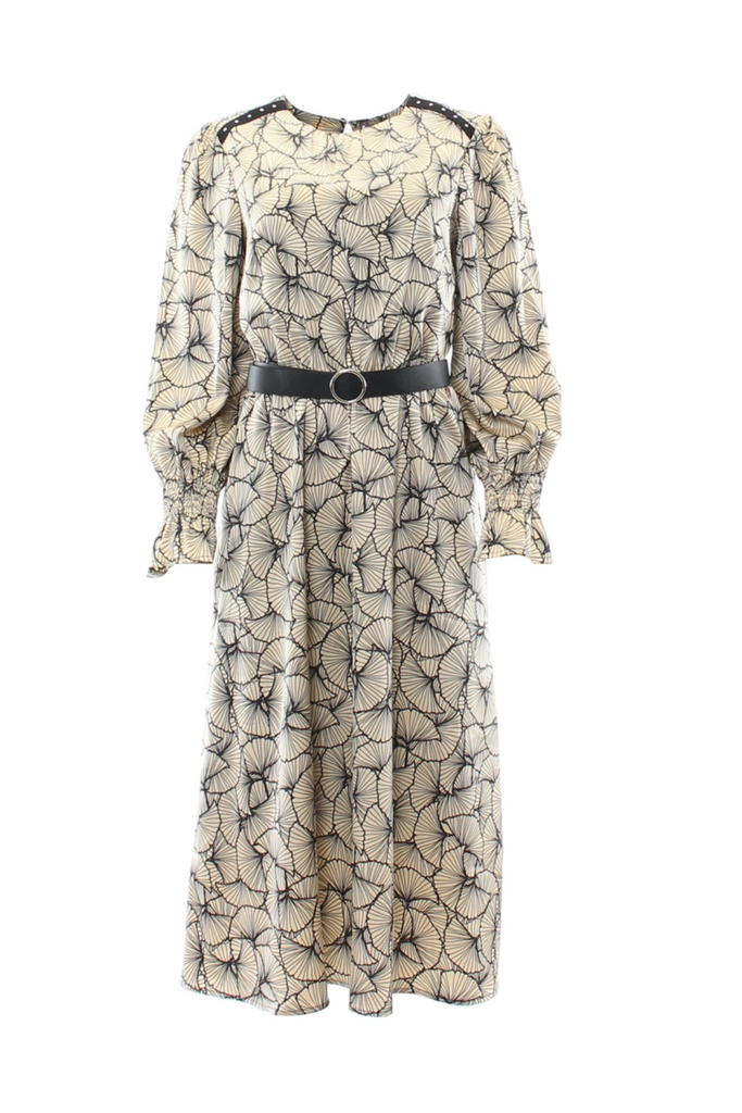 This midi-length style has a classic silhouette with round neckline and full length balloon sleeves with peplum cuff. In a gorgeous mix of neutrals, with a matching belt. The perfect day-to-evening style perfect with boots or heels