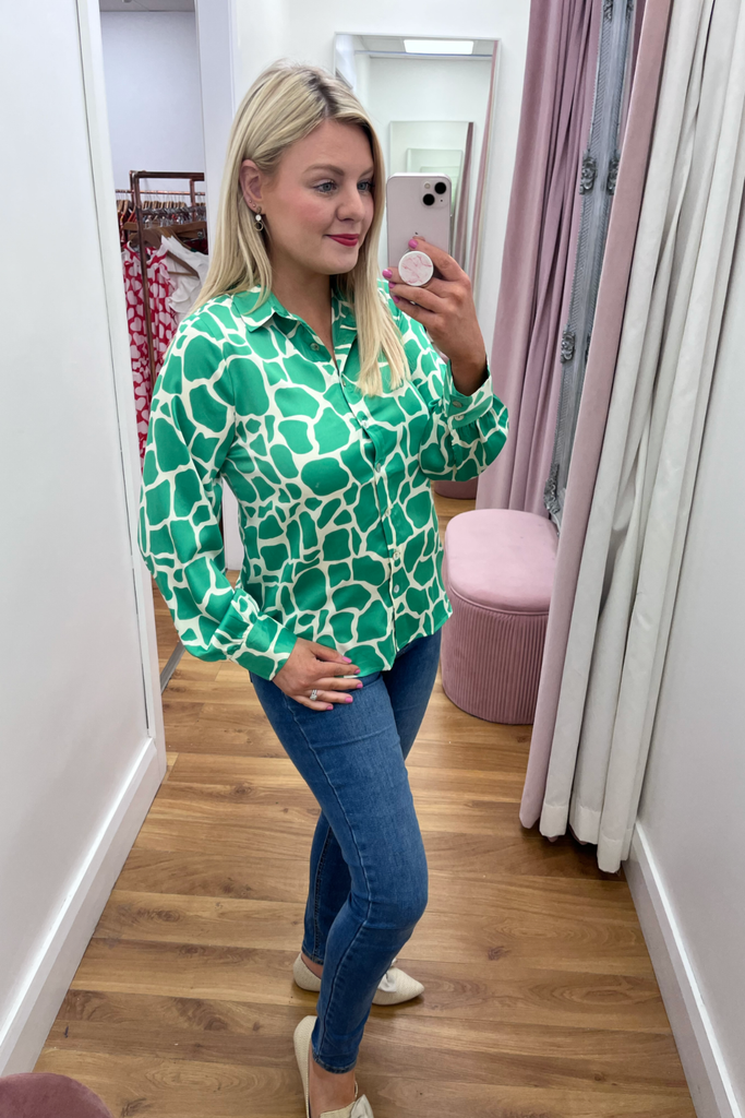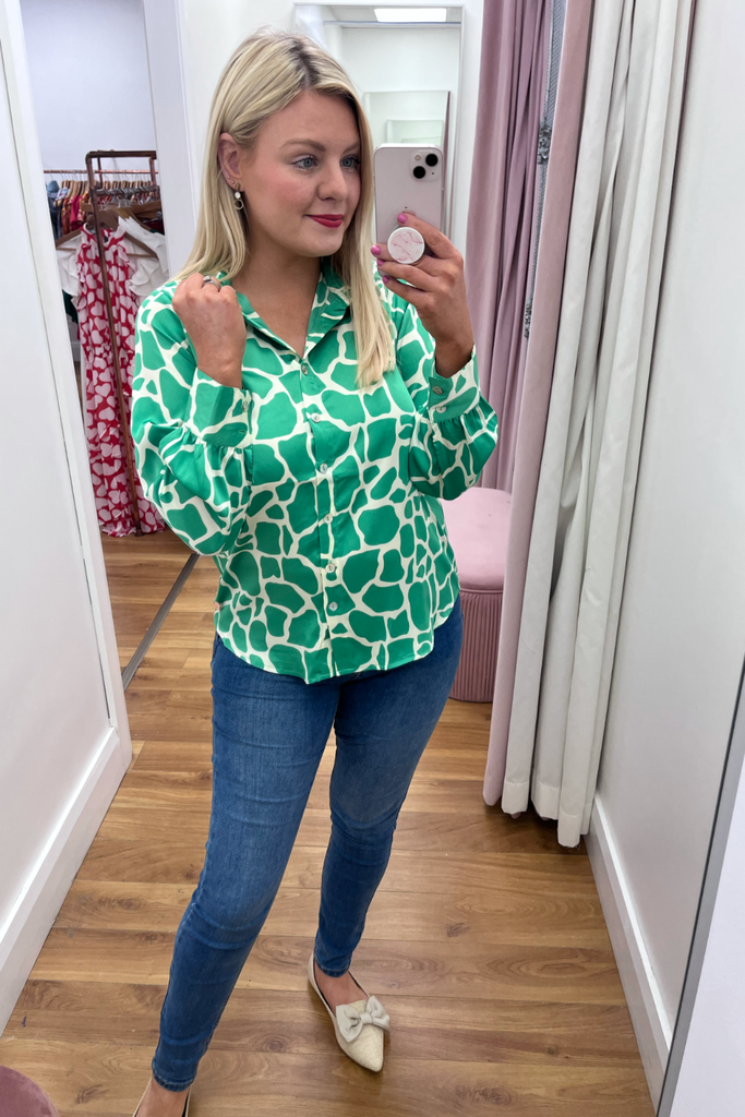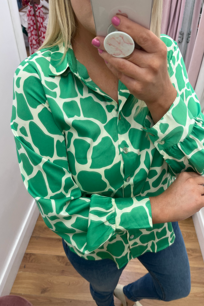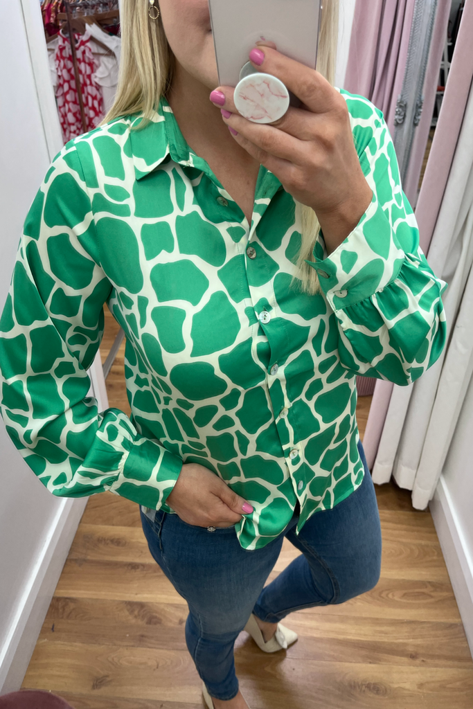 Stunning blouse with a unique and striking green animal print. Features a collared neckline full button down front, nice length, and full balloon sleeves with deep buttoned cuffs. It has a soft satin-like finish.
