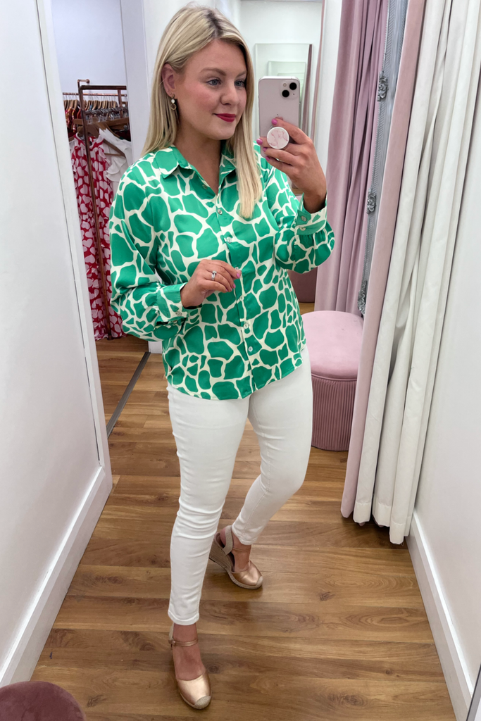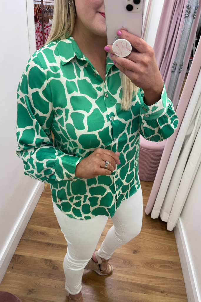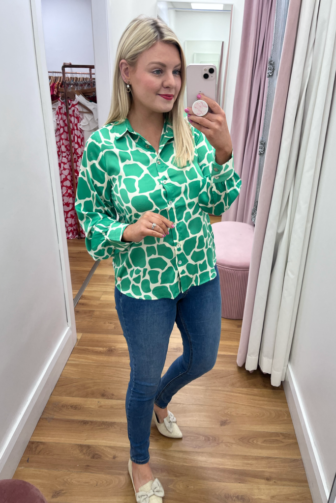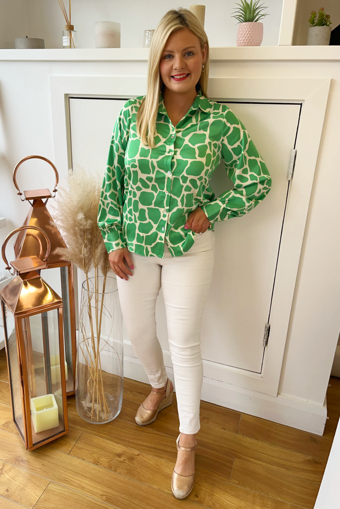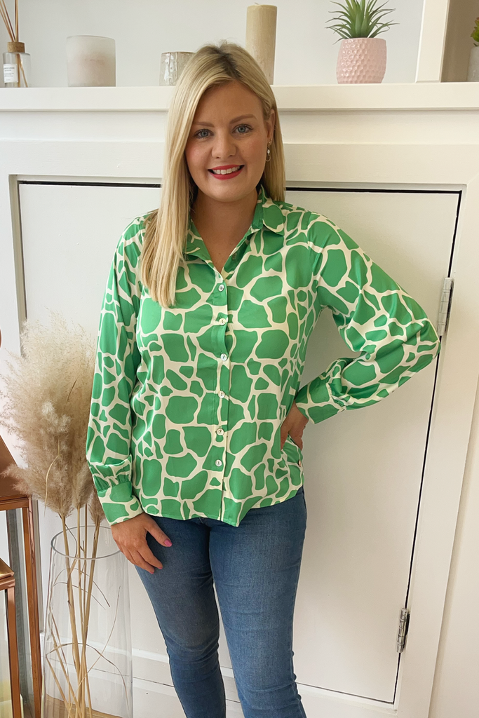 Stunning blouse with a unique and striking green animal print. Features a collared neckline full button down front, nice length, and full balloon sleeves with deep buttoned cuffs. It has a soft satin-like finish.