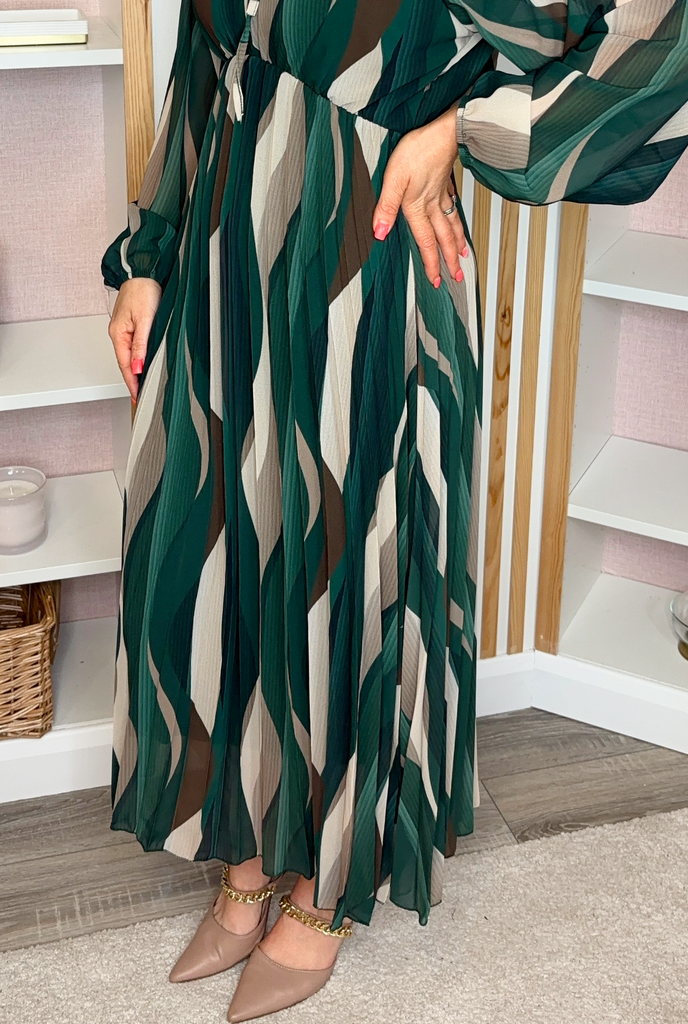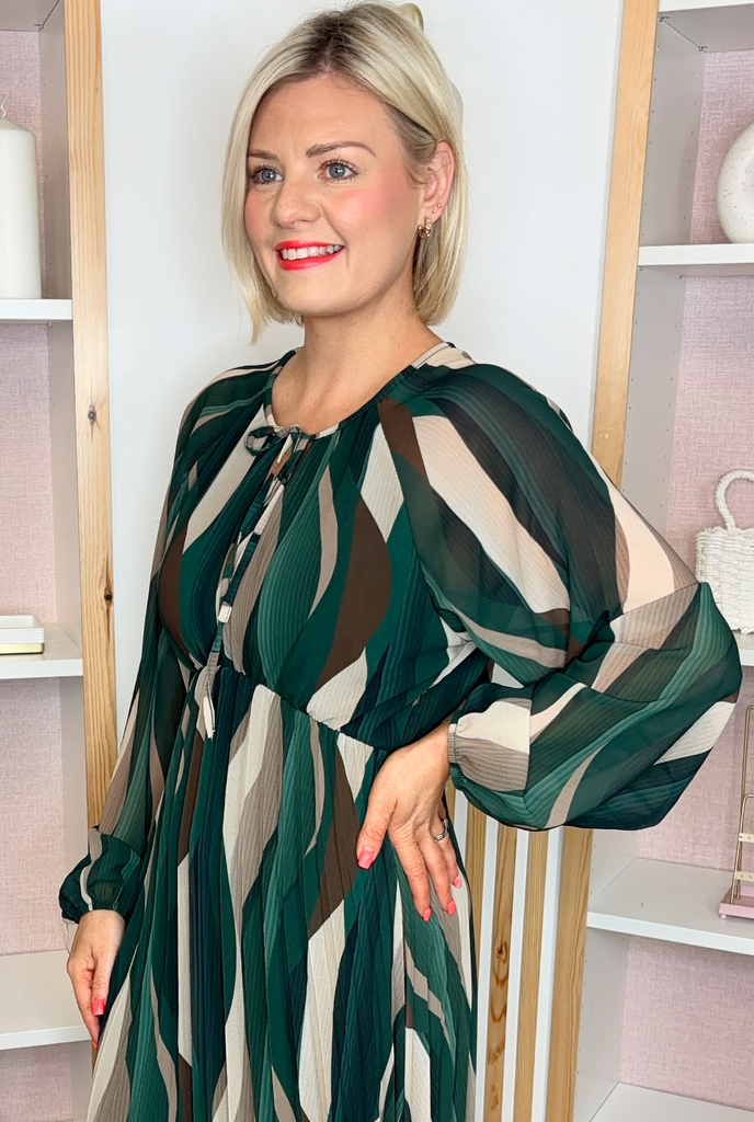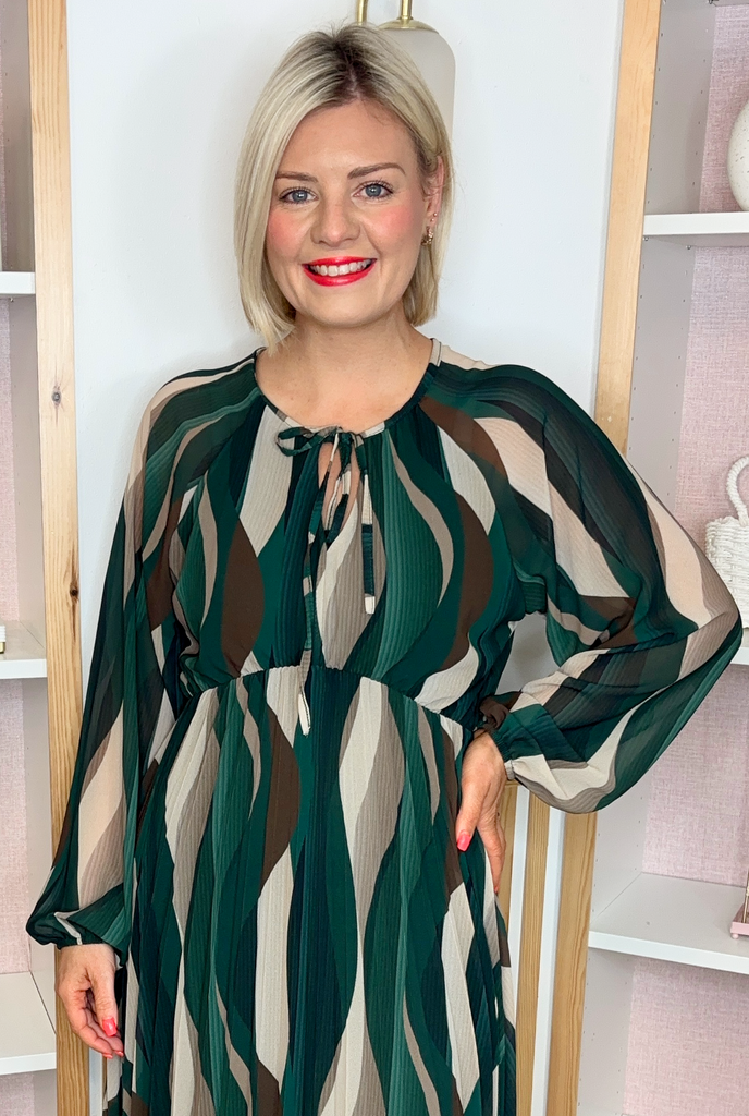 Round neck midi dress with tie neck, pleated skirt and tie belt. The body and skirt is lined and the sleeves are sheer