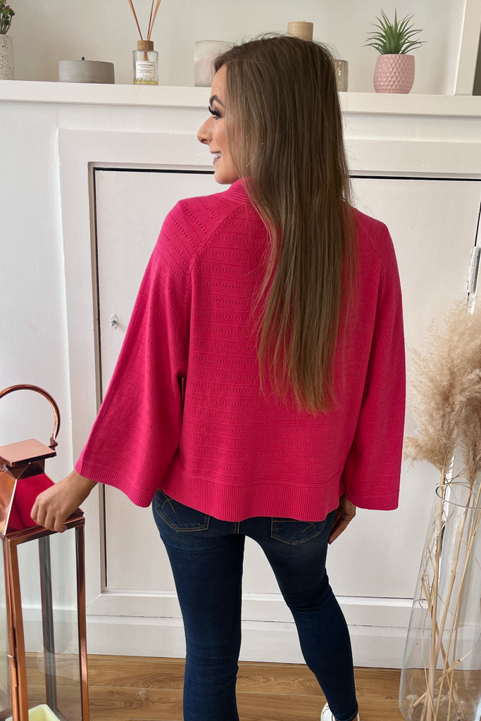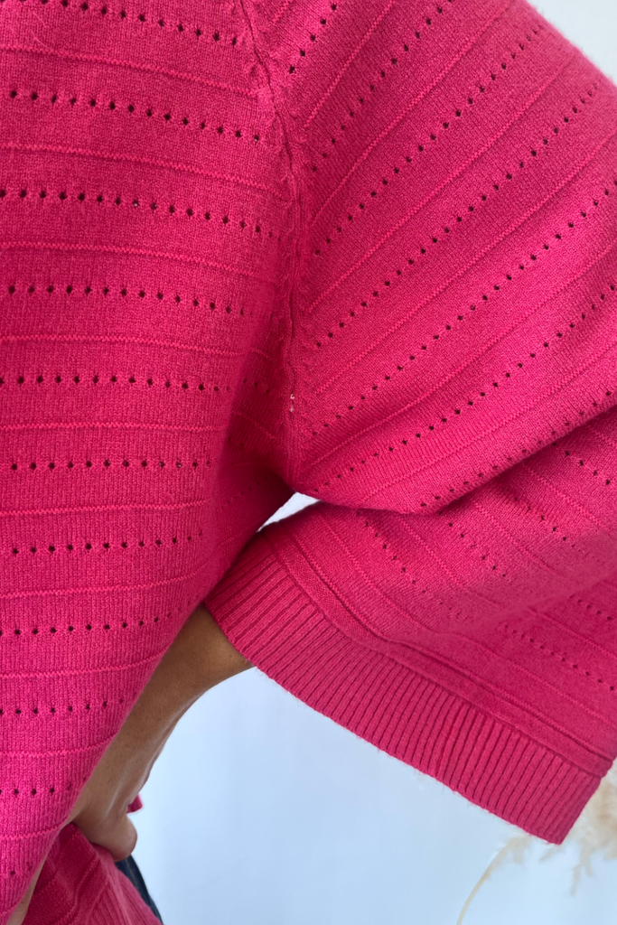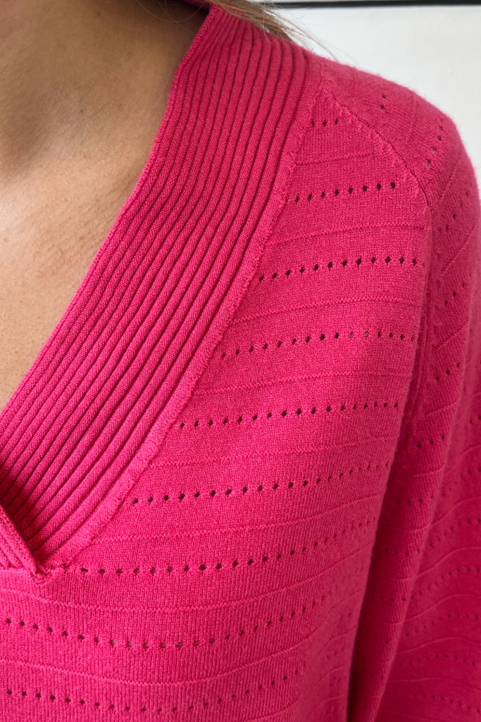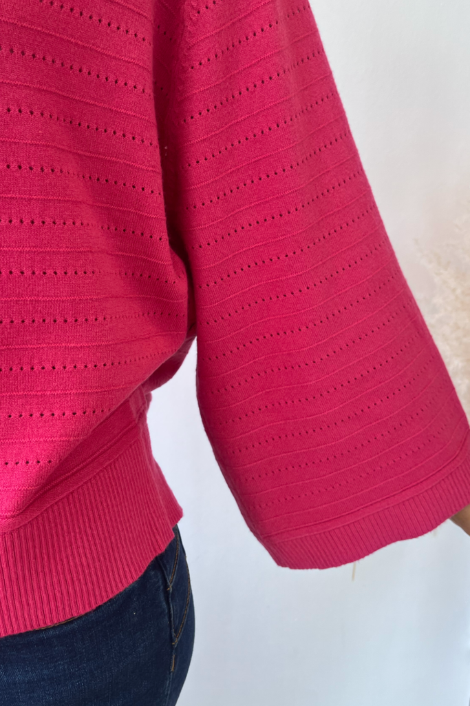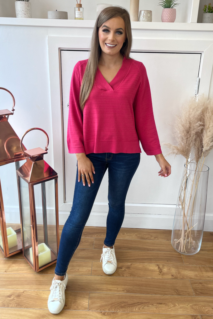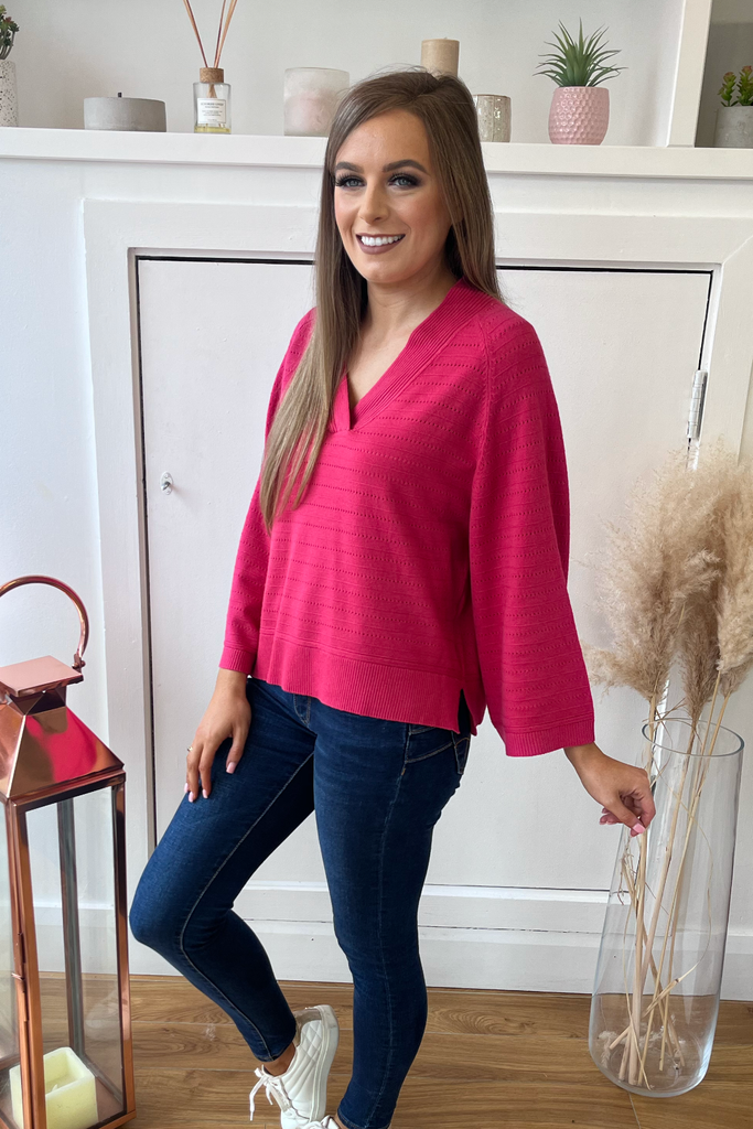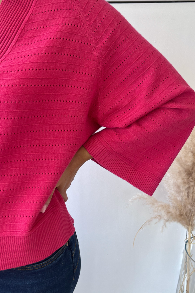 Super soft feel knit in a vibrant berry pink colour with ribbed detail along the V-neckline and hemline. It has a wider fit bodice and wide cropped sleeve