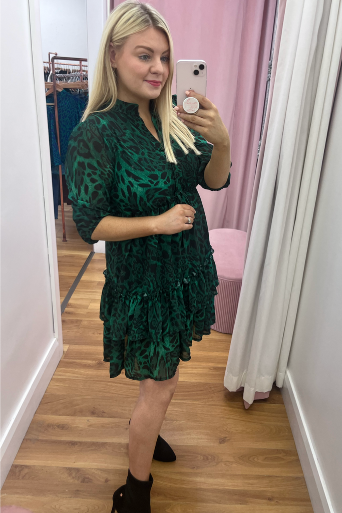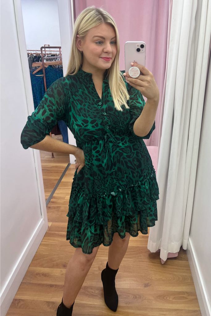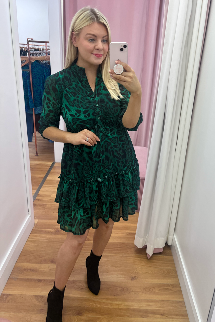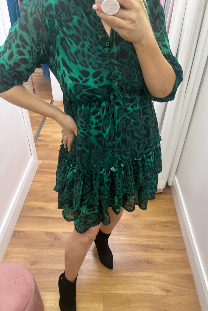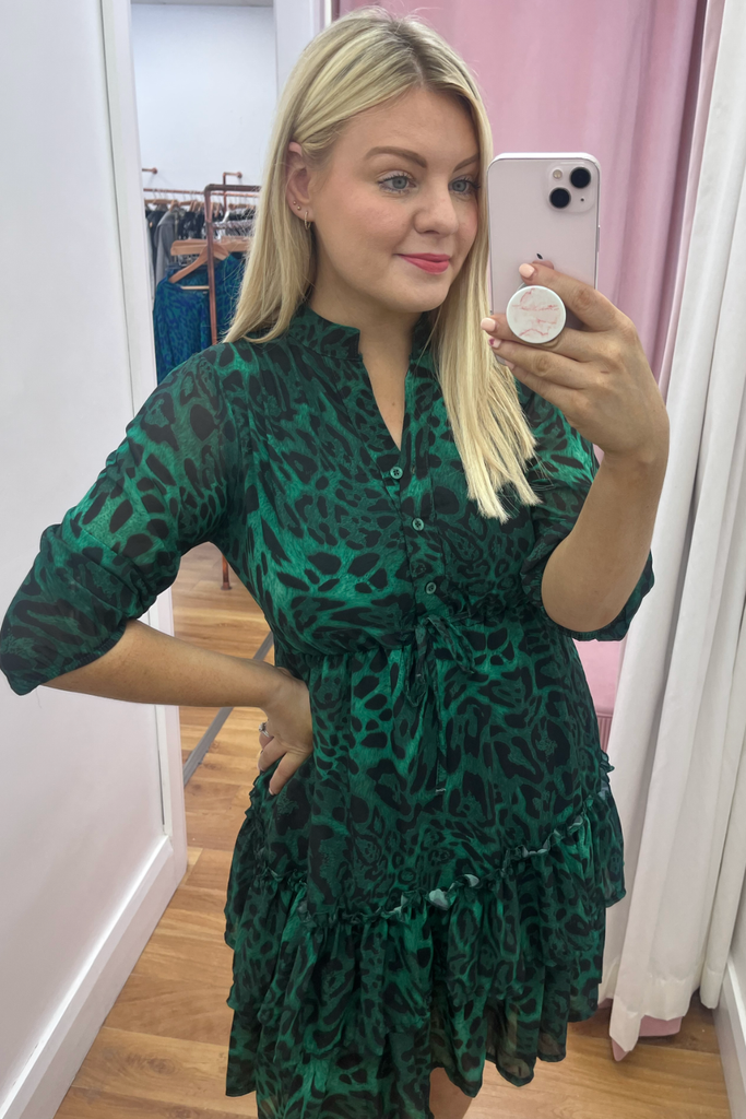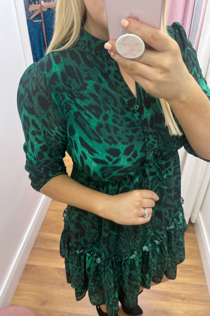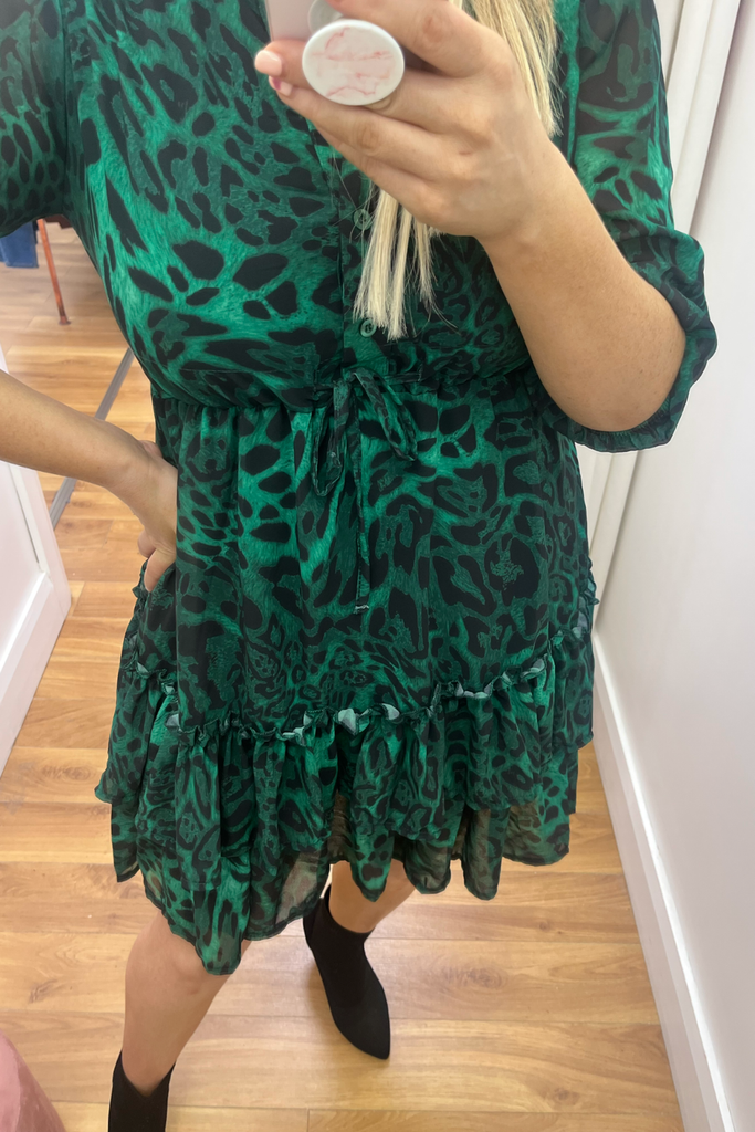 Vibrant Green animal print dress. Features a V- neckline with mandarin collar, button down front, tie waist belt to cinch in the waist and half sleeve with elasticated cuff. Lined style with tiered skirt, an easy one to take into all seasons!