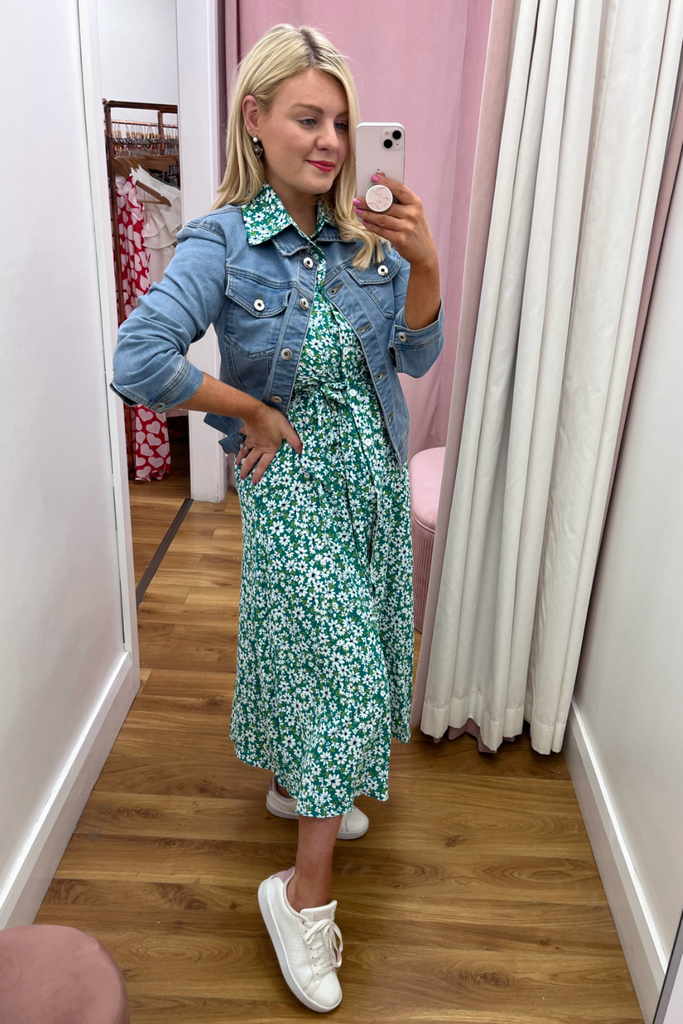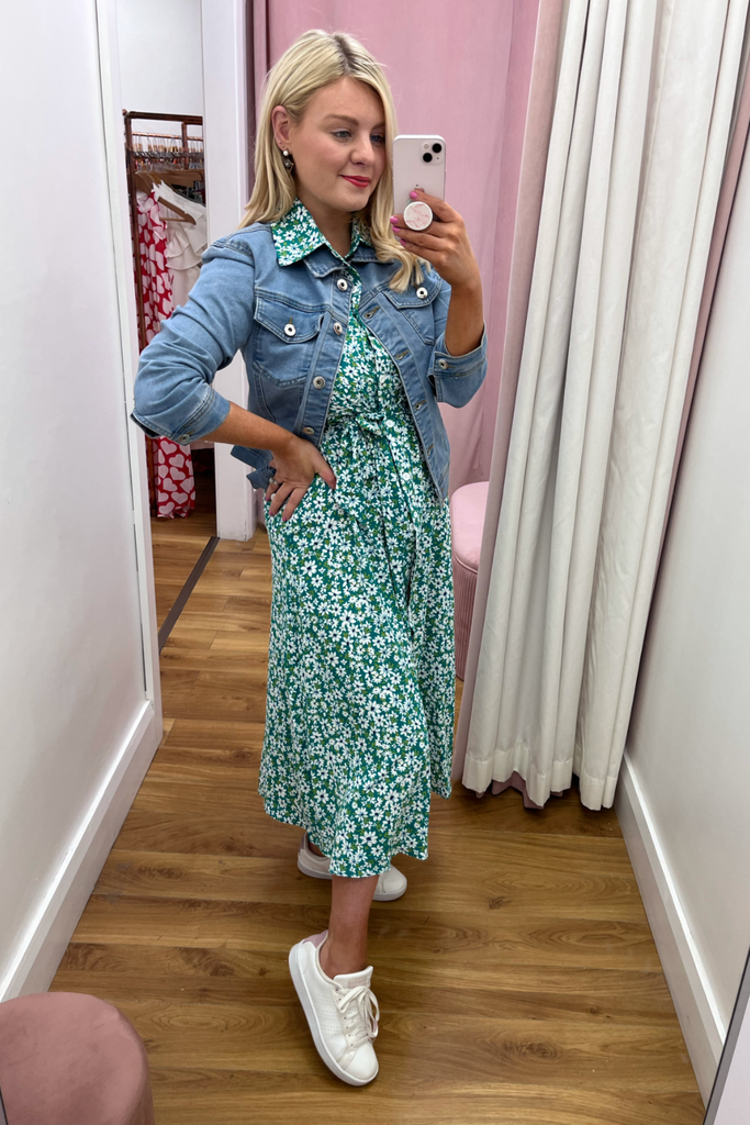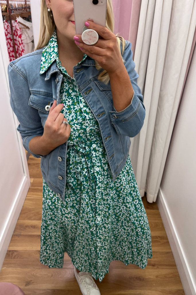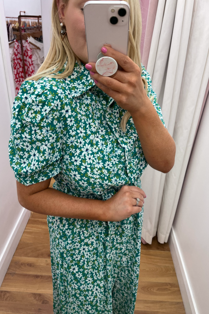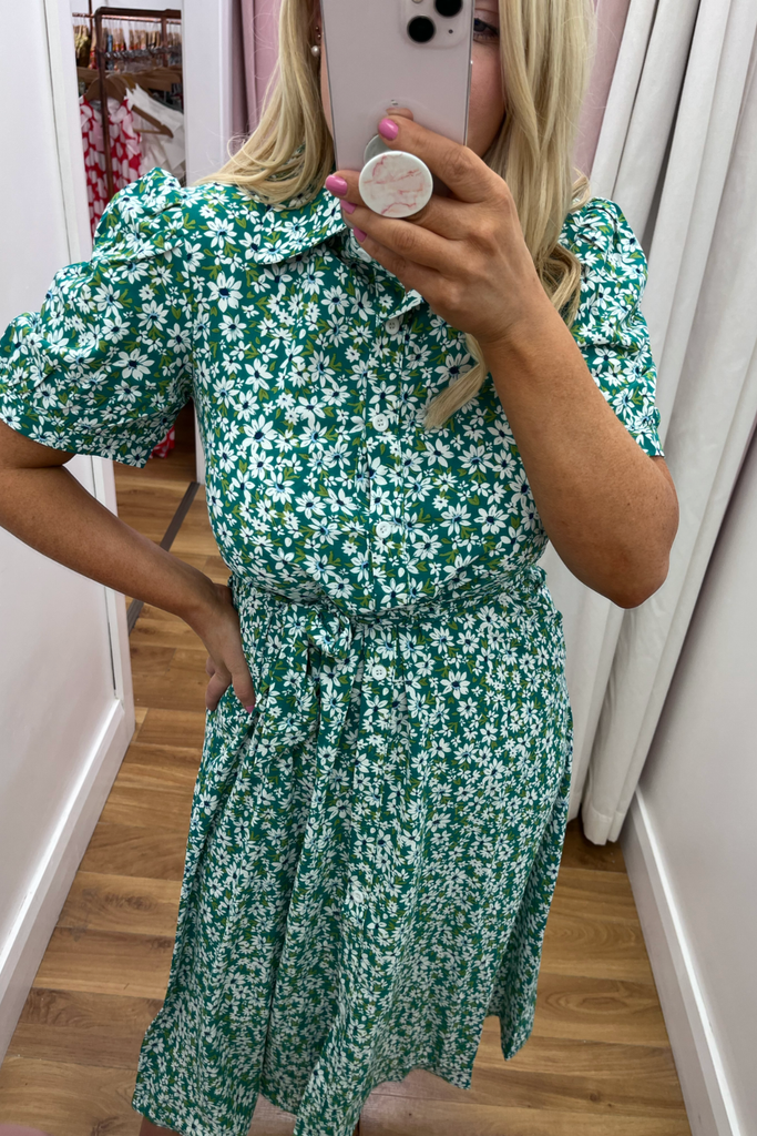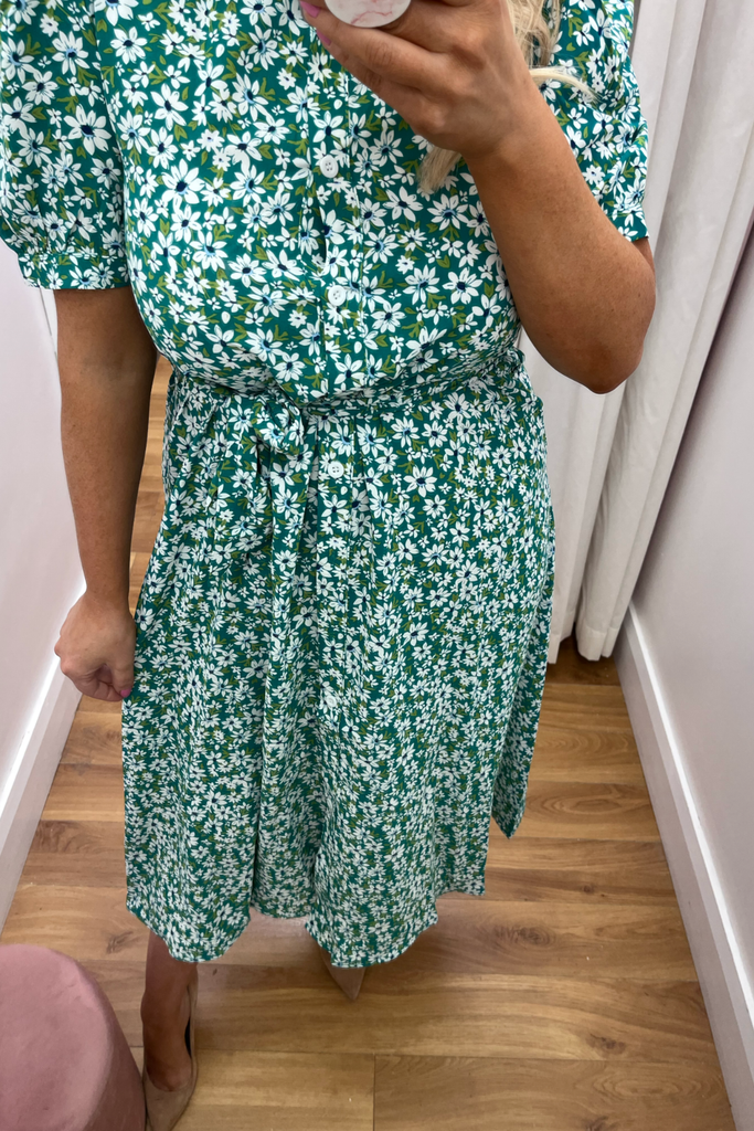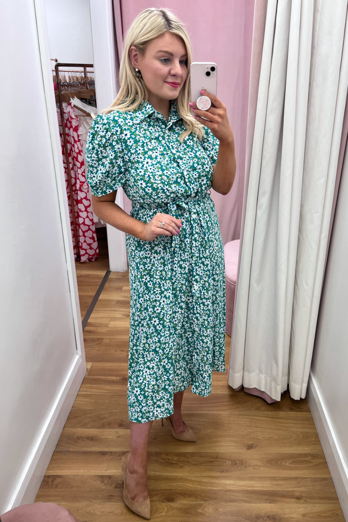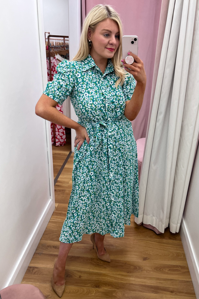 * Best-seller Restocked* Green and white floral midi-length shirt dress with collar and fitted waist. Features buttoned down front and half puff sleeve with fitted cuff This style has a matching material belt. This style is light weight and unlined.