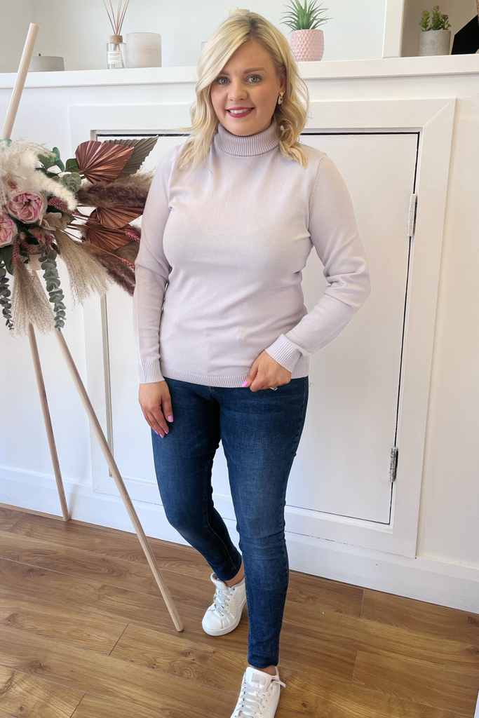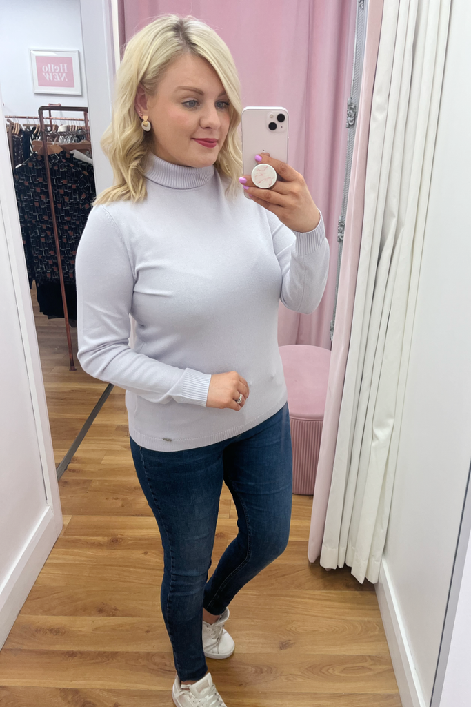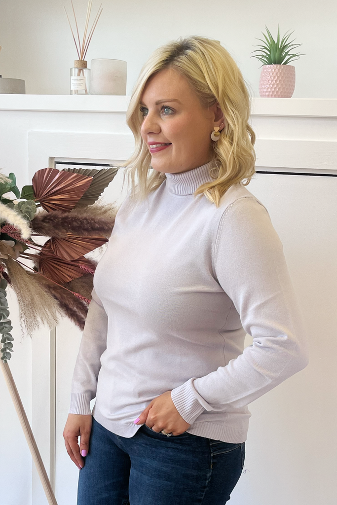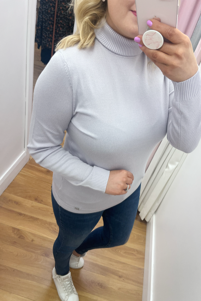 Light-weight polo neck jumper with ribbed cuffs and hemline, with lovely length. Other colours available