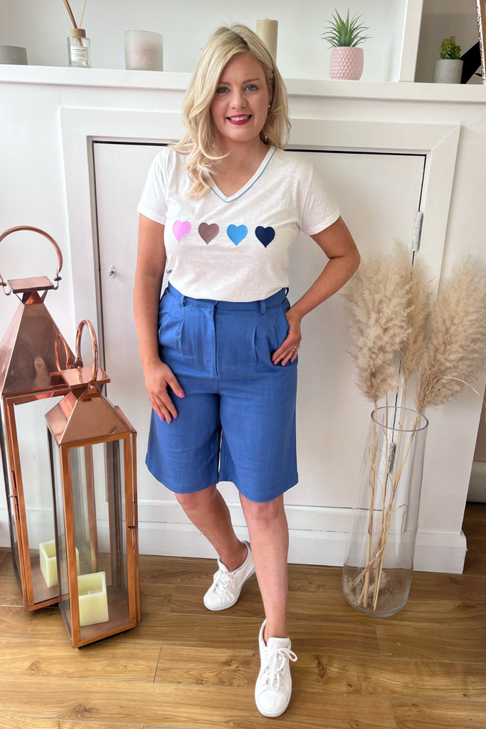 A gorgeous linen blend knee-length shorts in sky blue. This style has pockets and is partially lined. With front zip and clasp fastening at the waist.
