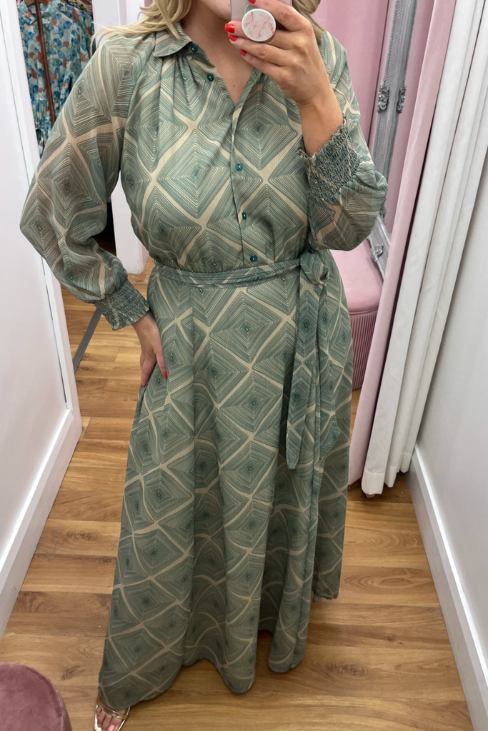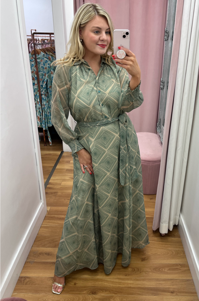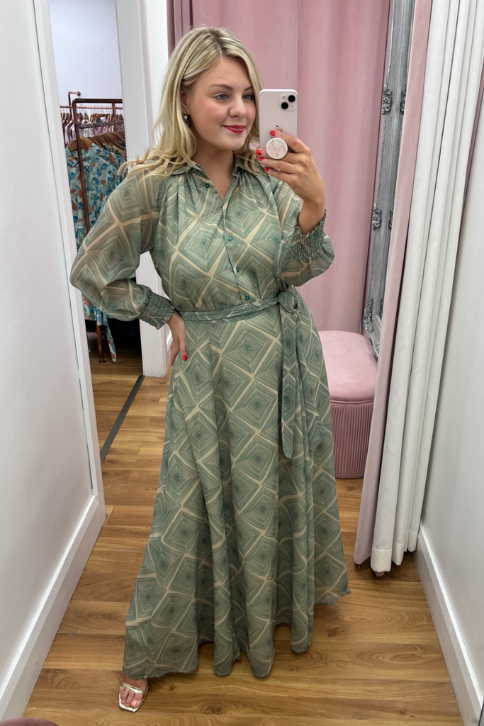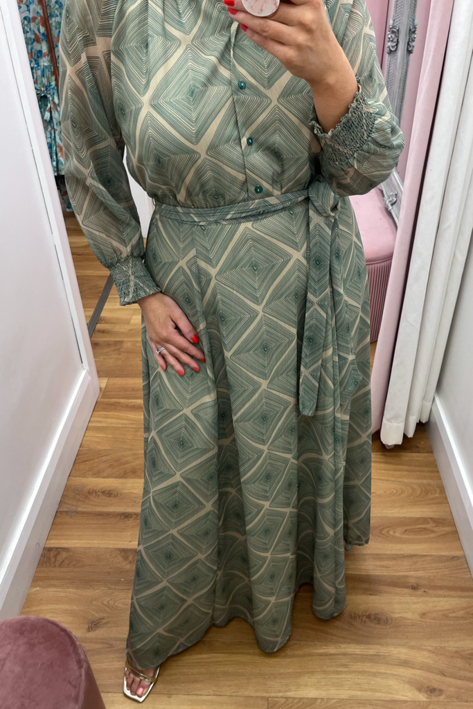 Luxurious maxi length dress in a mix of forest green and taupe. With buttoned top to the waist, collared neck and long sleeve with fitted waist. It has a floaty skirt and tie belt. Zips to the side and is fully lined.