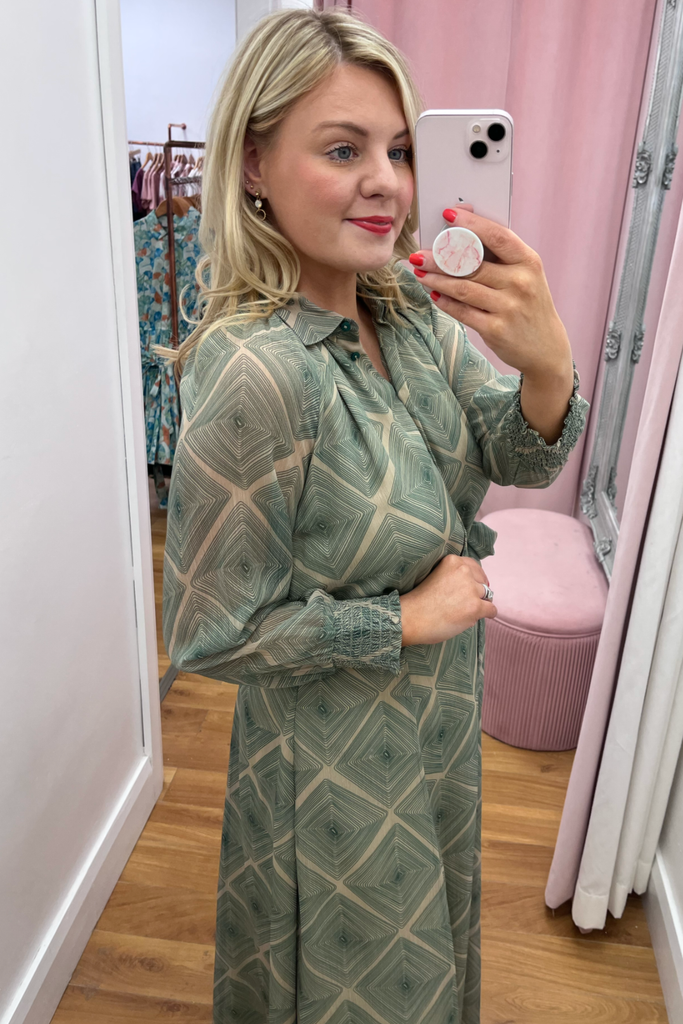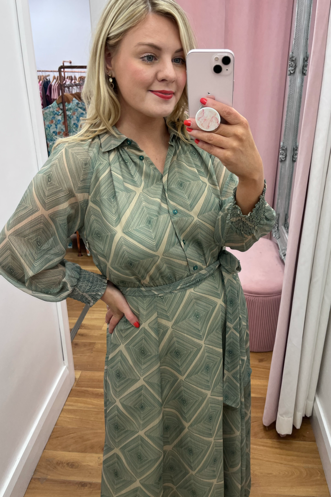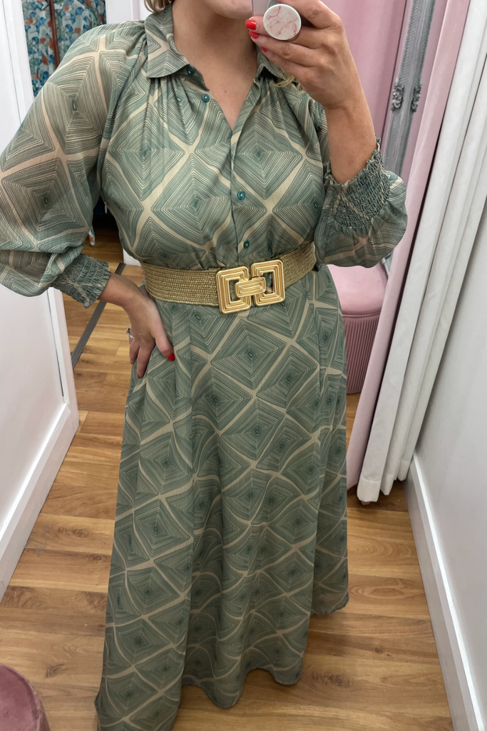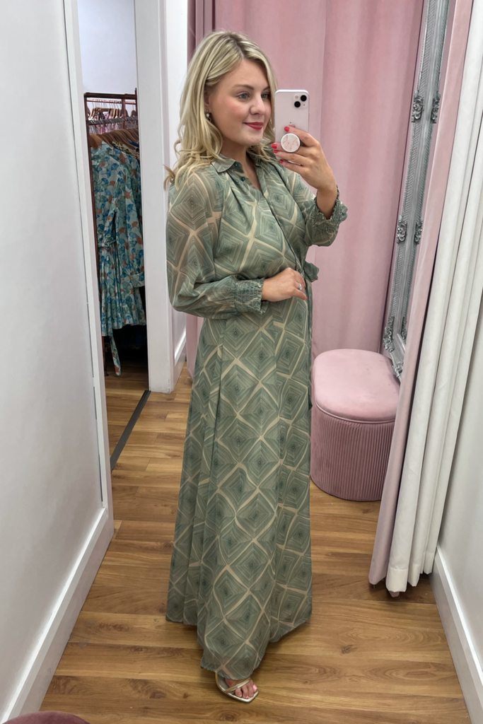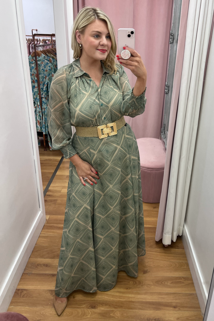 Luxurious maxi length dress in a mix of forest green and taupe. With buttoned top to the waist, collared neck and long sleeve with fitted waist. It has a floaty skirt and tie belt. Zips to the side and is fully lined.