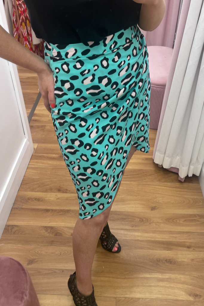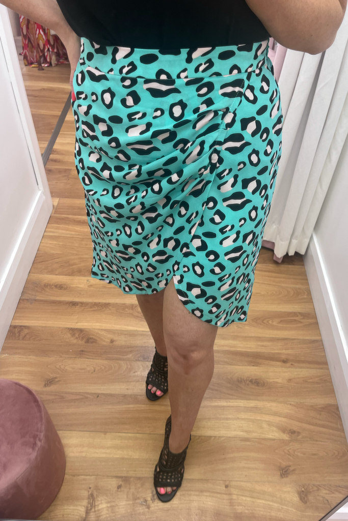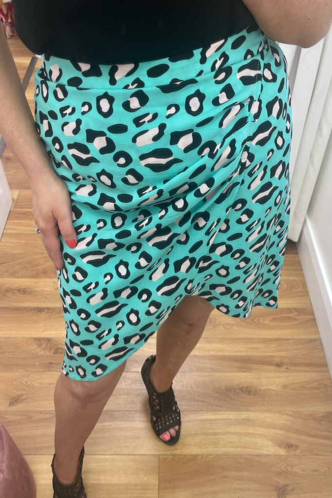 A soft pastel mint mini skirt with pink leopard print. In a faux wrap look and asymmetric hemline. Dress up with a blouse or cami and a heel, or dress down with a knit and tee and trainer!