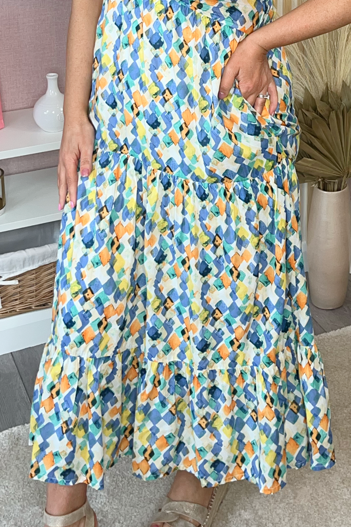 Multicoloured mosaic print midi dress. Features spaghetti straps with delicate bow, V-neckline, and fitted waist. The skirt is a full tiered style, with lining. And pockets!