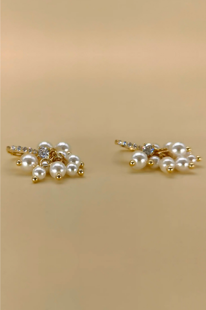 Pearl and gold cluster drop earring with jeweled hoop. Perfect for any occasion to add some glam to your outfit!