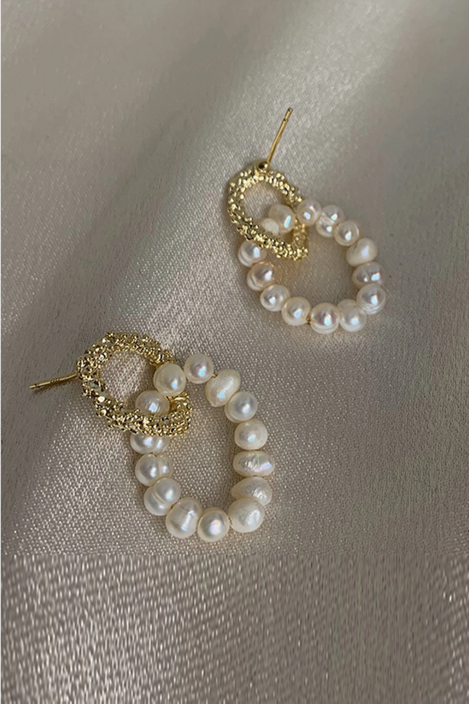 Chic alloy and pearl hoops earrings. These elegant earrings feature a mix of textured gold tone alloy hoop interlock with a shiny asymmetrical pearl hoop.