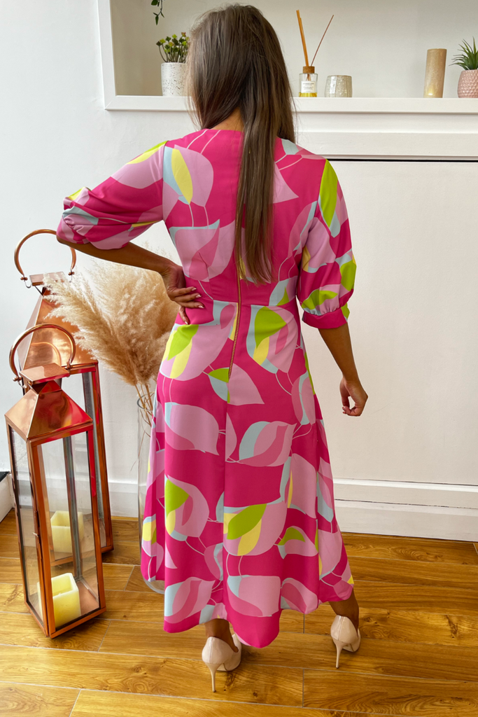 Vibrant pink midi dress with lime, mint and baby pink floral print. Features a wrap over front with tie waist belt and half puff sleeves. It has a dipped hem and zip closure at the back.