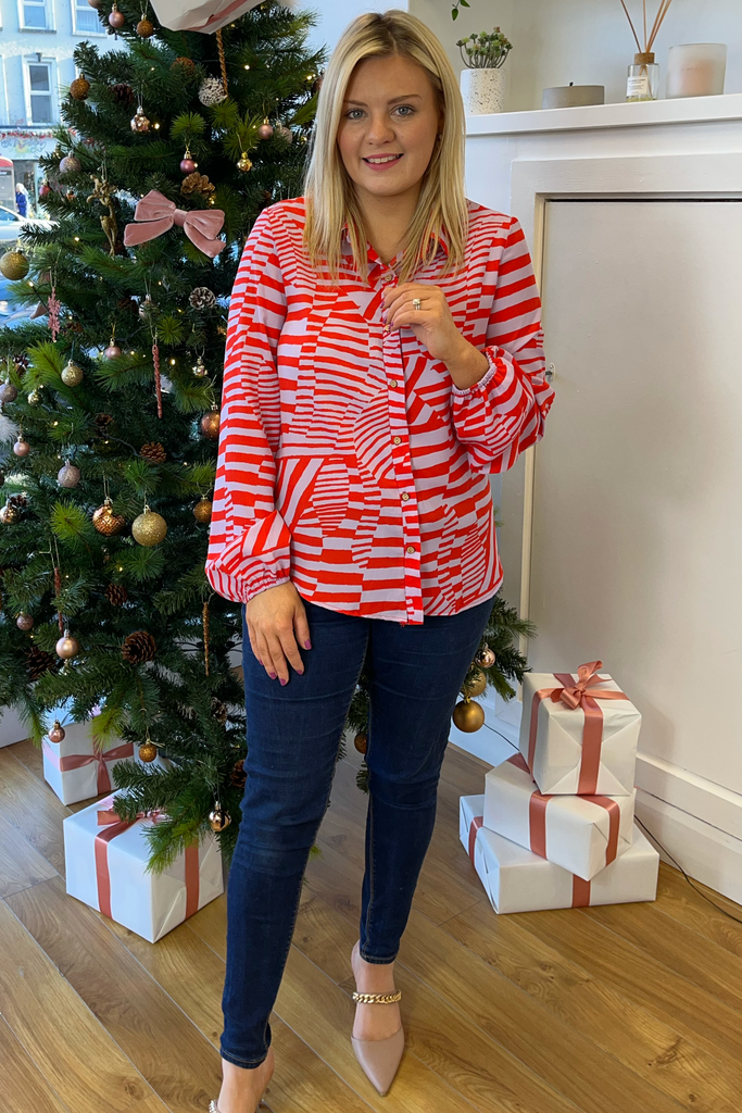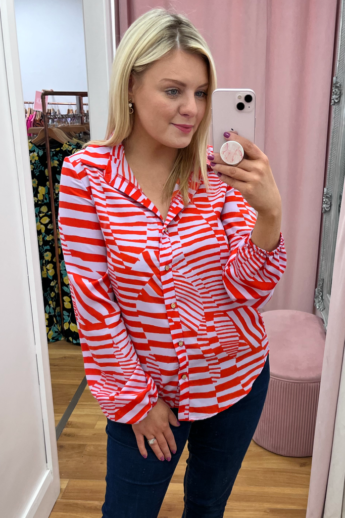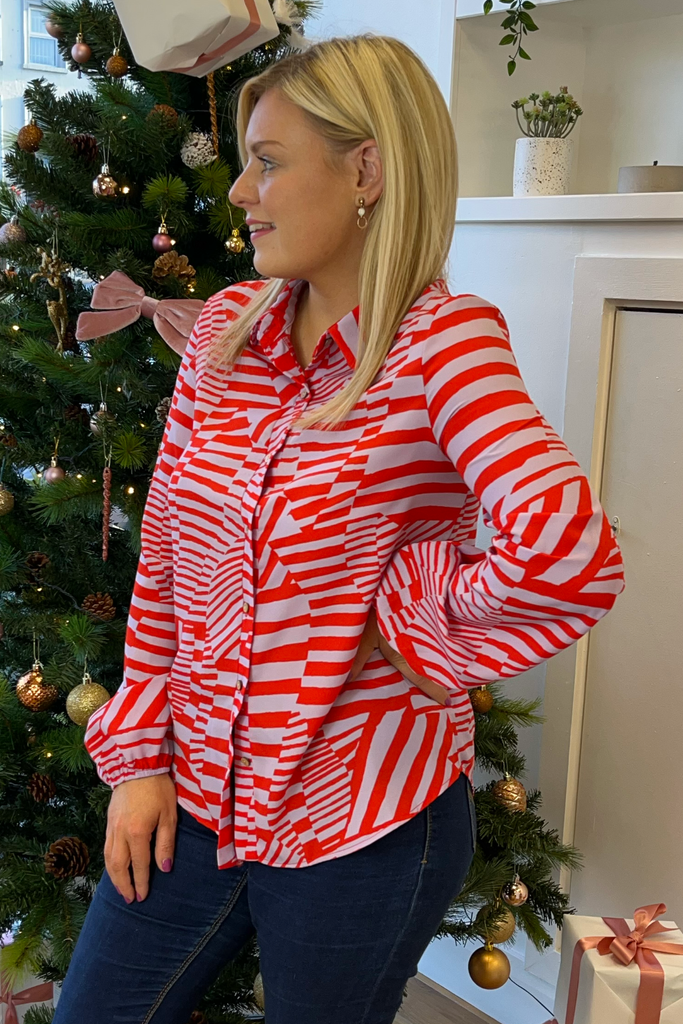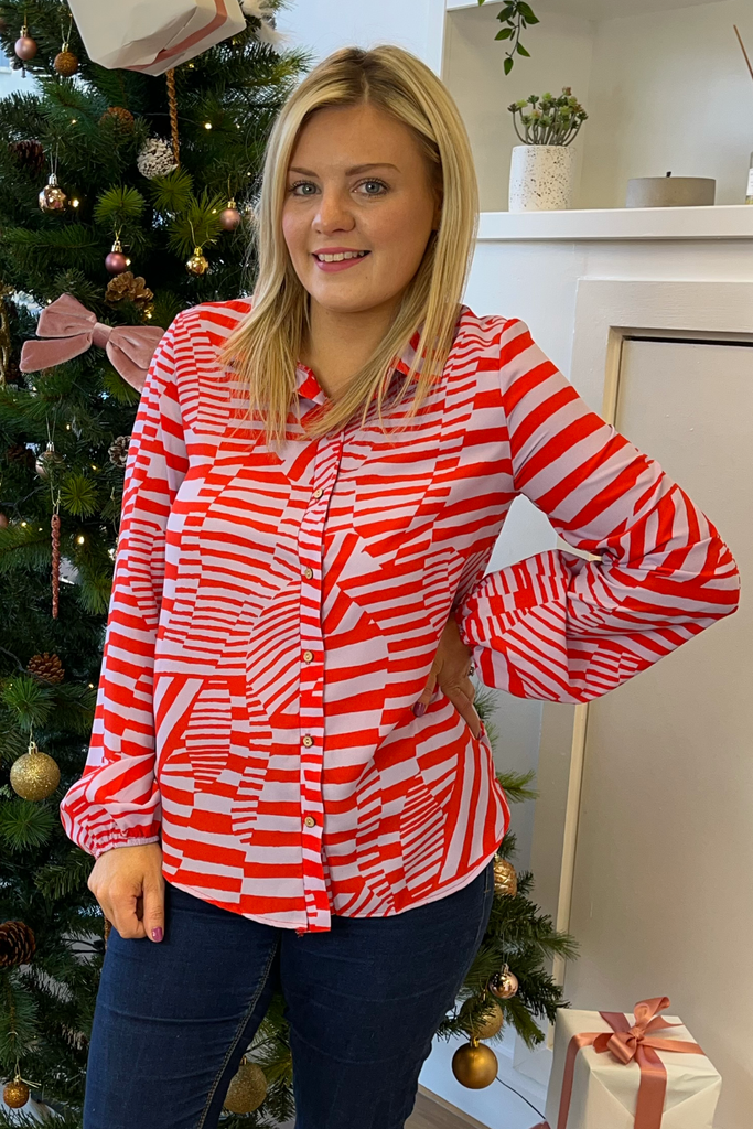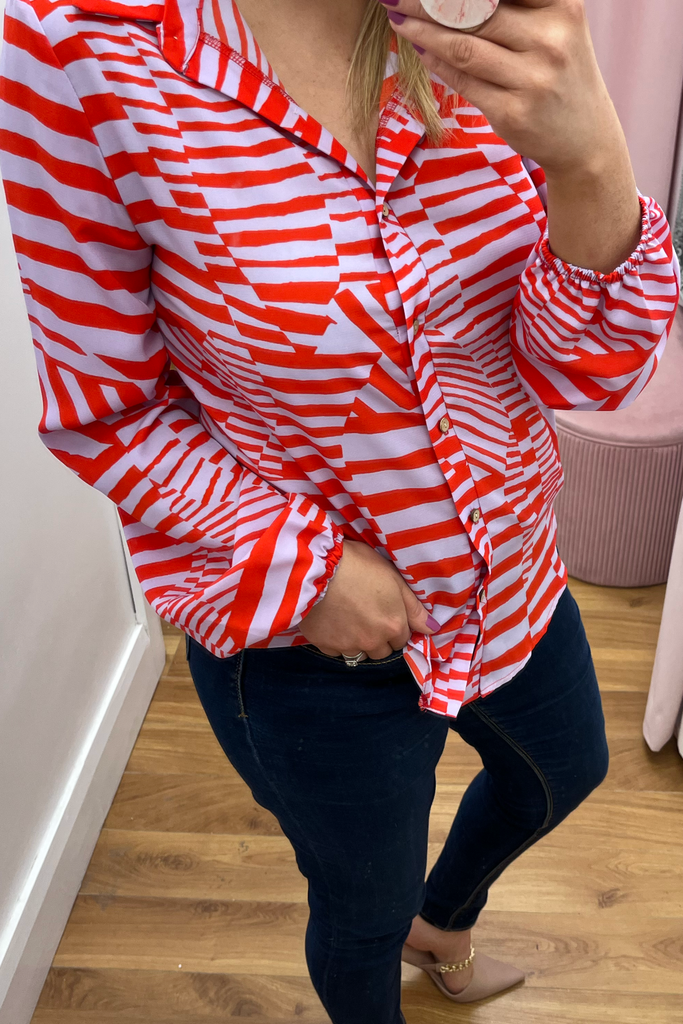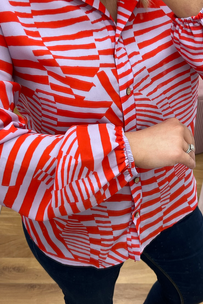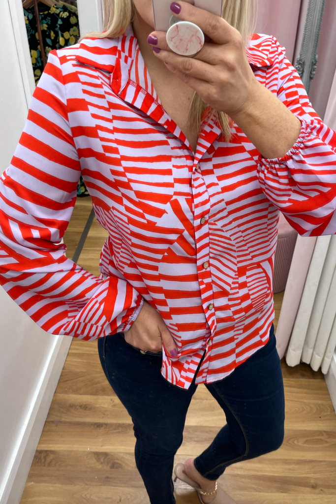Button-down collared shirt in colour clashing Red and lilac Zebra print. With curved hem, balloon sleeve and elasticated cuff. Bold and beautiful, perfect for dressing up or down