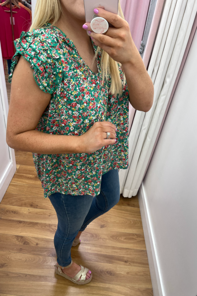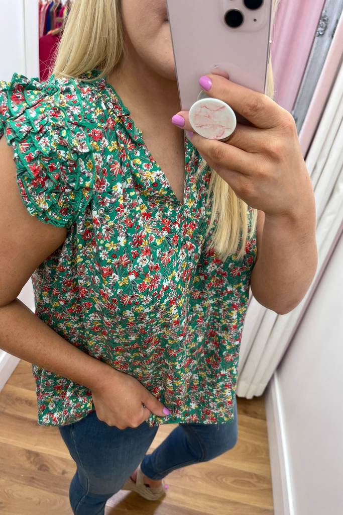 Green blouse with floral print in a mix of red, lemon and white. Features a v-neckline, sleeveless design with triple ruffled shoulder and relaxed bodice. It has a ruffled neck and pleated back.